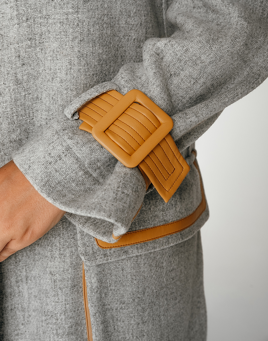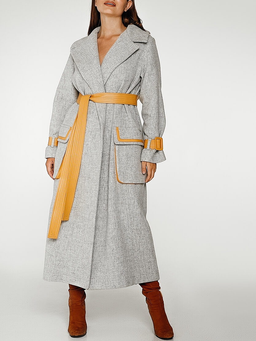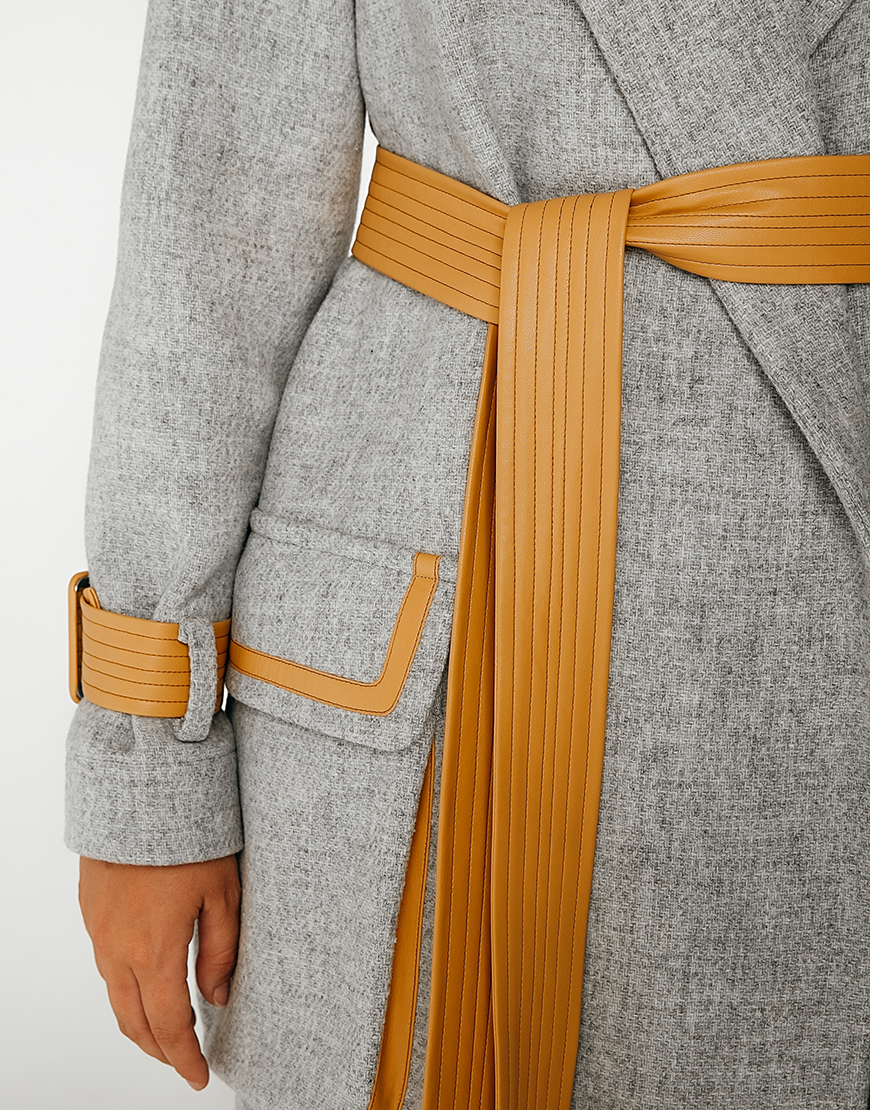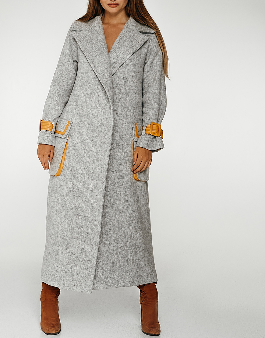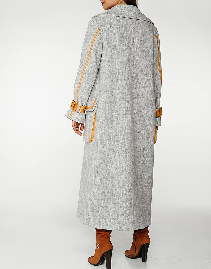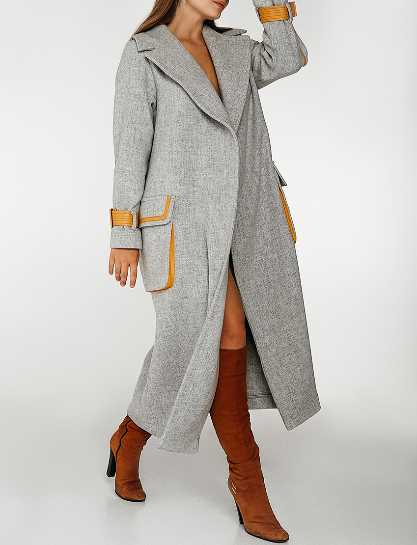 Вовняне пальто з контрастними вставками з еко-шкіри. Без підкладки. Внутрішні шви оброблені шовком.