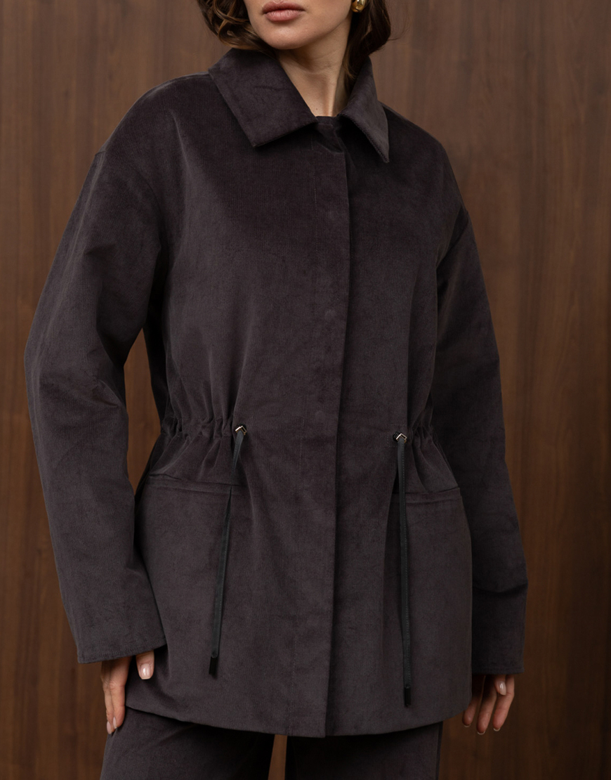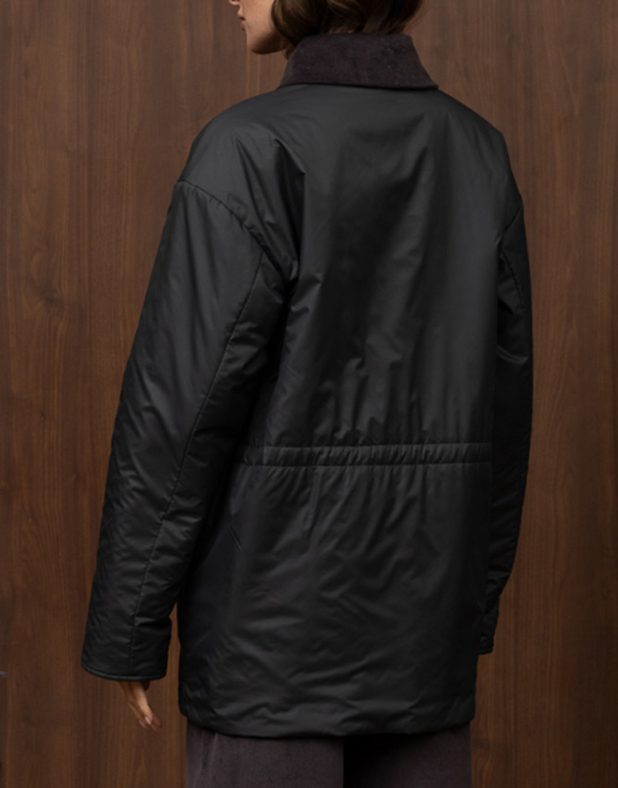 Інша сторона куртки виконана з плащової тканини. Куртка з плащової тканини має вельветовий комір, а також, за бажанням, можна зробити вельветові манжети, підгорнувши рукава куртки.