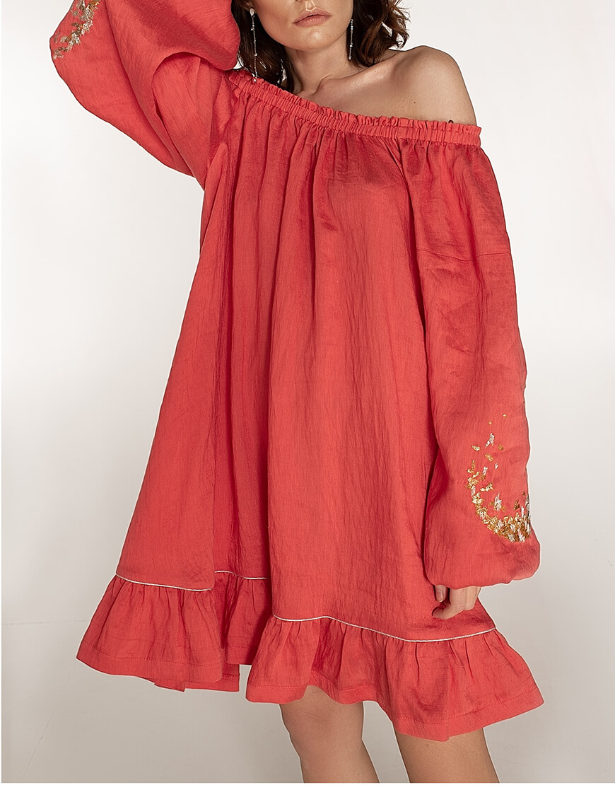 Сарафан на тонких бретелях з відкритою спиною. Знімний декор на спині виконаний з коралових намистин і барокових перлів. Бретелі регульовані – максимальна довжина 49 см. Склад: Льон – 86% Поліакрил – 14% Інструкція з догляду: машинне прання за температури 30 градусів. Режим – делікатне прання, без віджимання. Прасувати можна при низьких температурах до 110 градусів. Інформація про модель: 80-58-88 см. Зріст 172 см