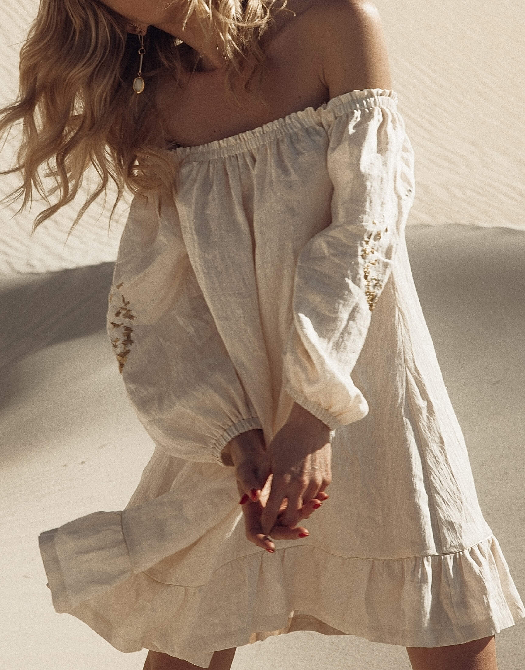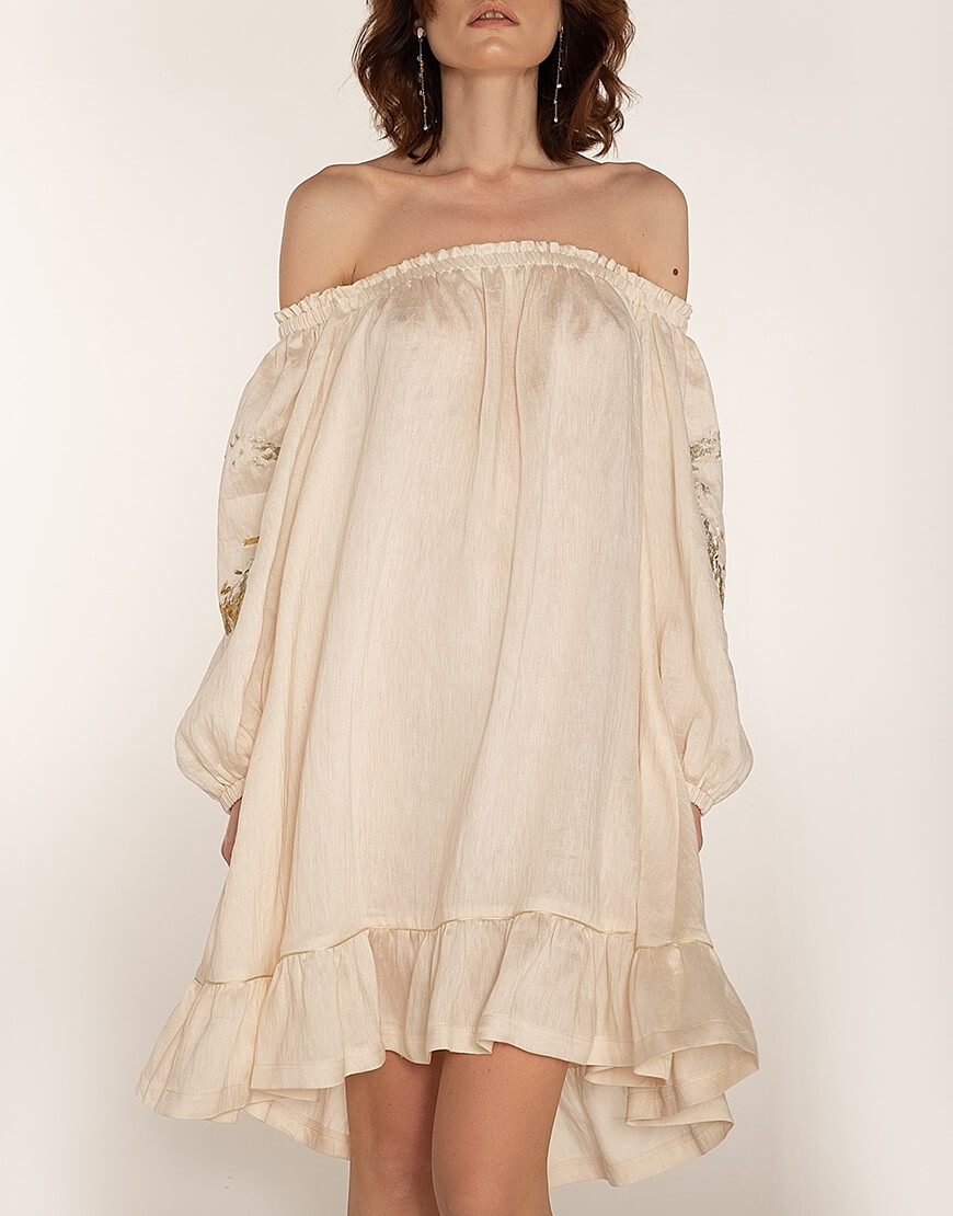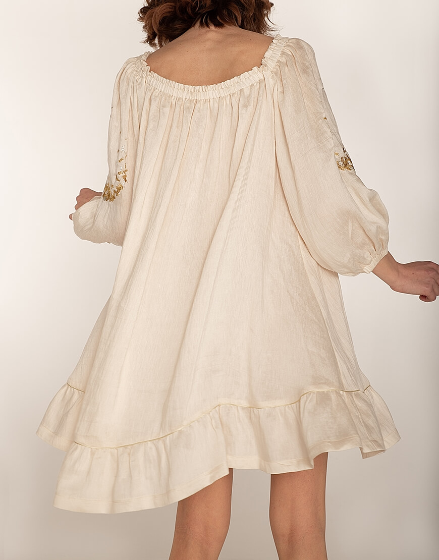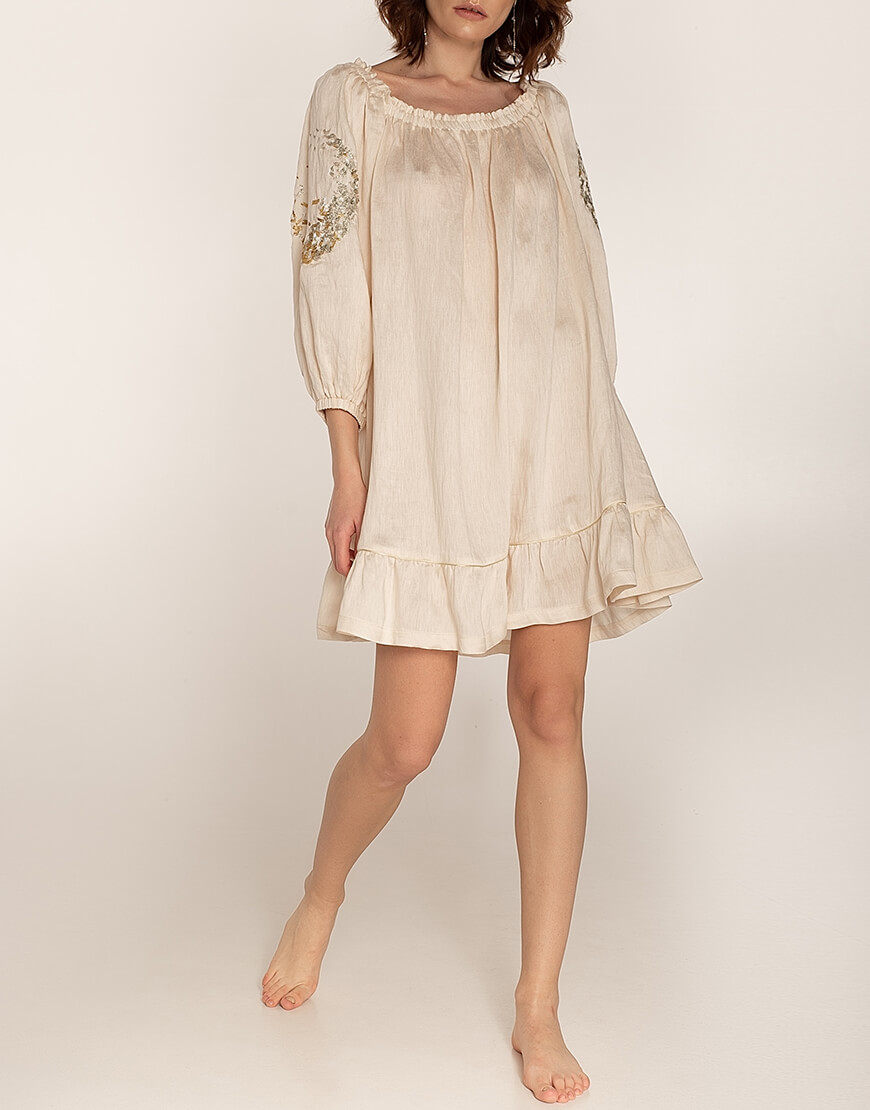 Сарафан на тонких бретелях з відкритою спиною. Знімний декор на спині виконаний з коралових намистин і барокових перлів. Бретелі регульовані – максимальна довжина 49 см. Склад: Льон – 86% Поліакрил – 14% Інструкція з догляду: машинне прання за температури 30 градусів. Режим – делікатне прання, без віджимання. Прасувати можна при низьких температурах до 110 градусів. Інформація про модель: 80-58-88 см. Зріст 172 см