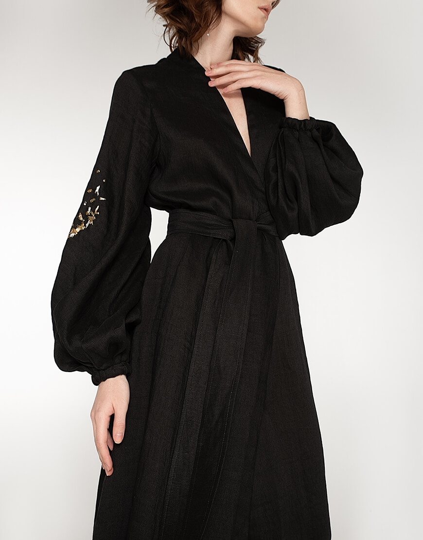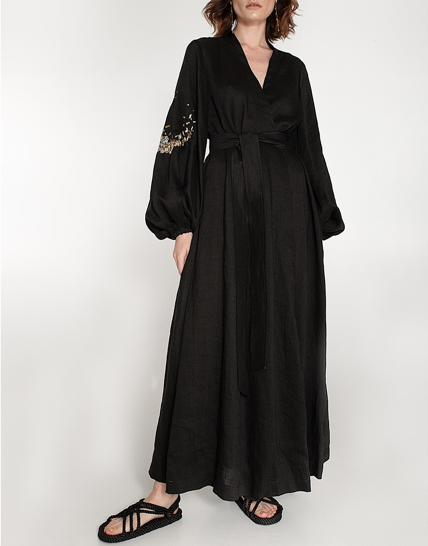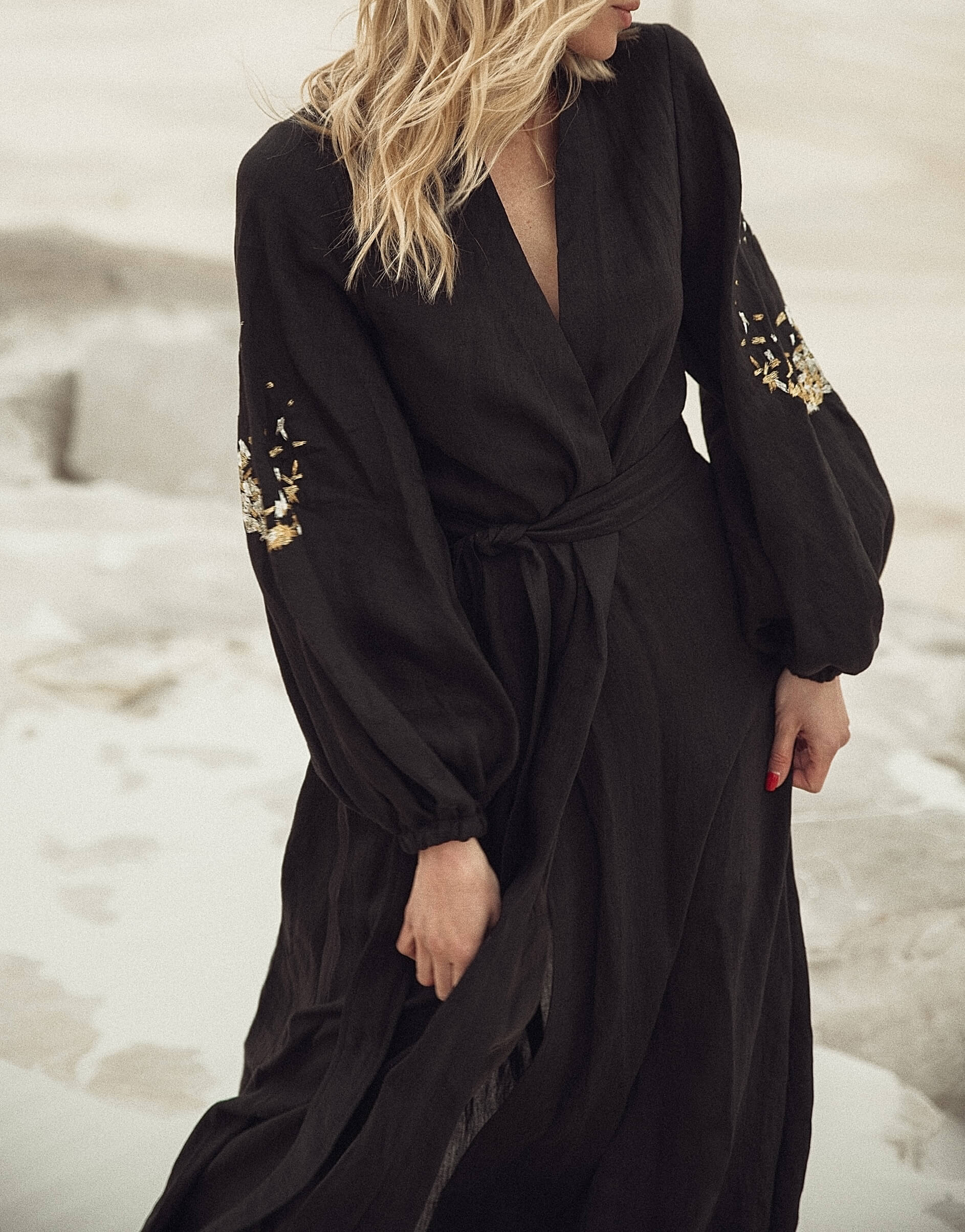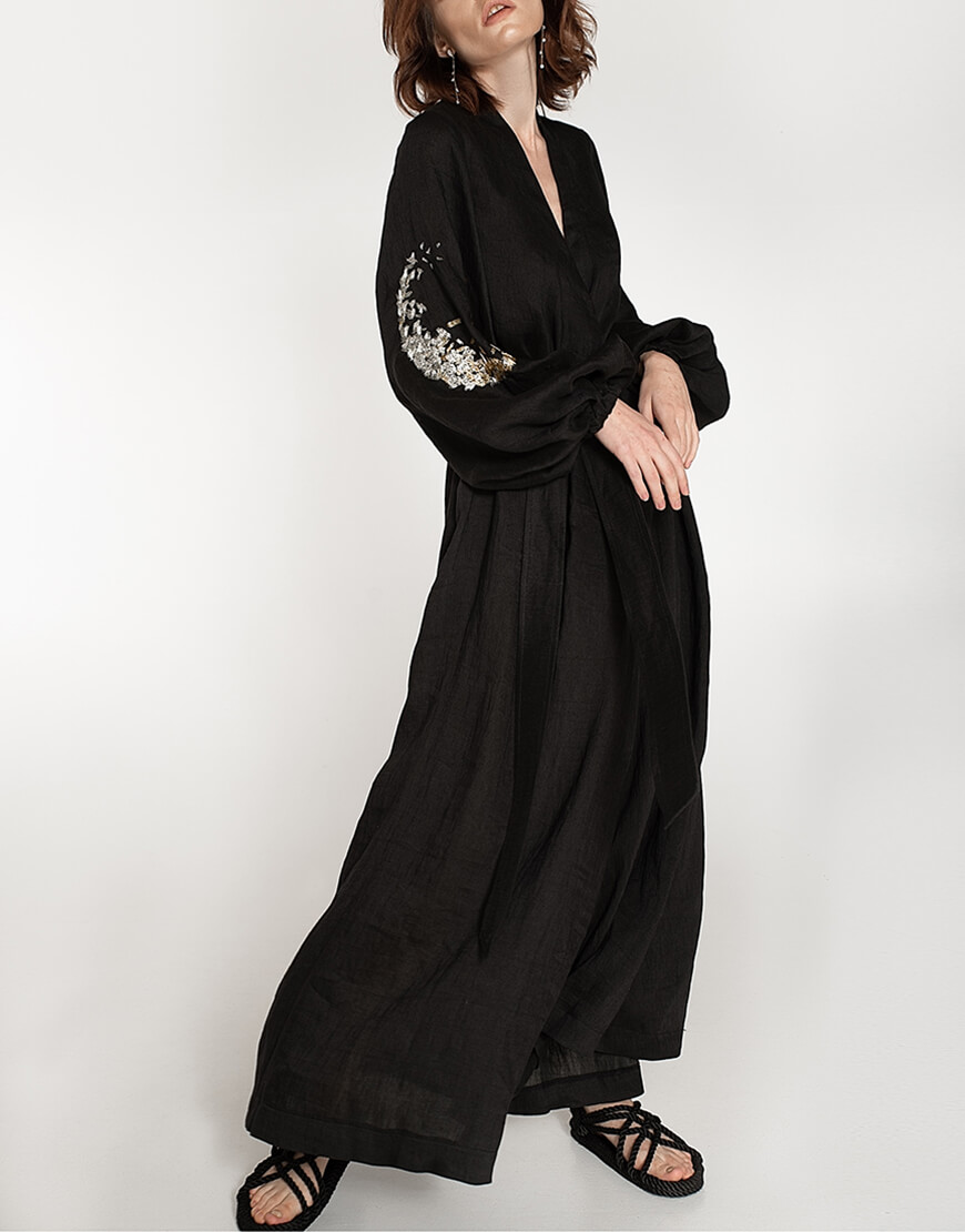 Сарафан на тонких бретелях з відкритою спиною. Знімний декор на спині виконаний з коралових намистин і барокових перлів. Бретелі регульовані – максимальна довжина 49 см. Склад: Льон – 86% Поліакрил – 14% Інструкція з догляду: машинне прання за температури 30 градусів. Режим – делікатне прання, без віджимання. Прасувати можна при низьких температурах до 110 градусів. Інформація про модель: 80-58-88 см. Зріст 172 см