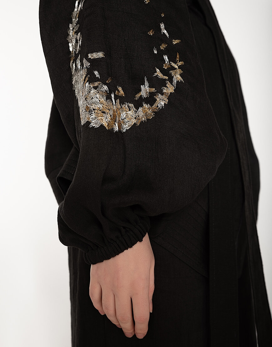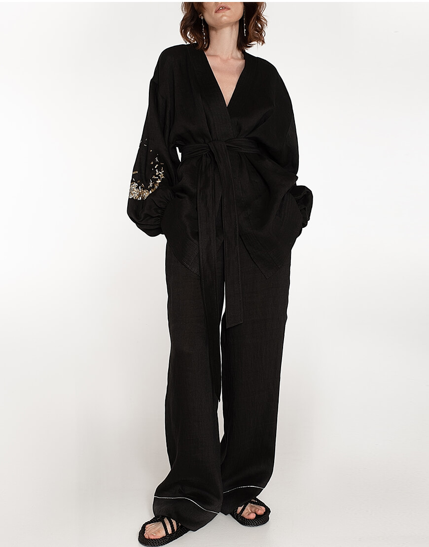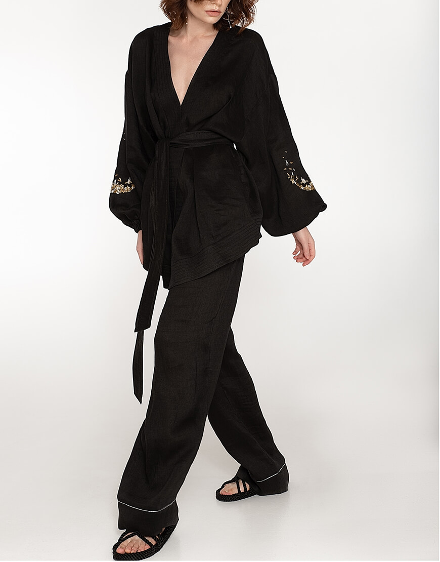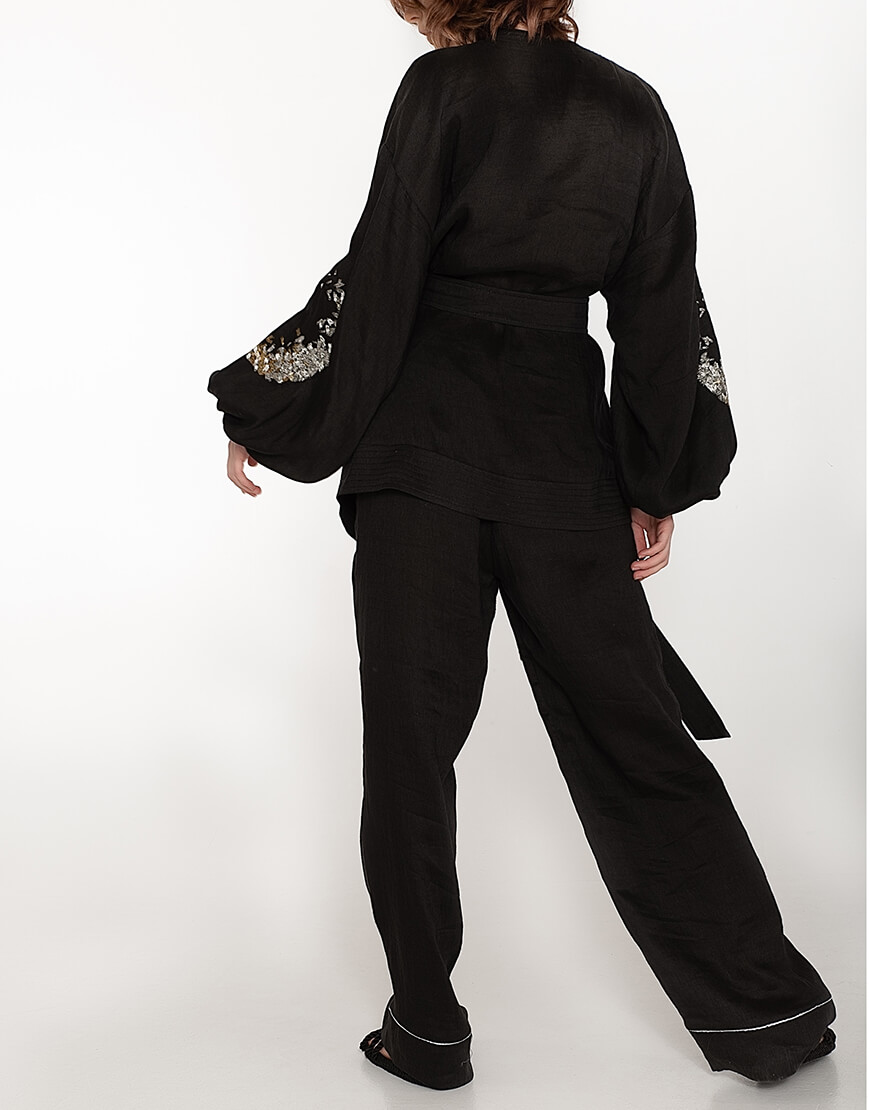 Костюм-двійка з дикого льону: укорочене кімоно і широкі штани. Рукава кімоно розшиті золотом і сріблом. Штани на поясі-гумці.