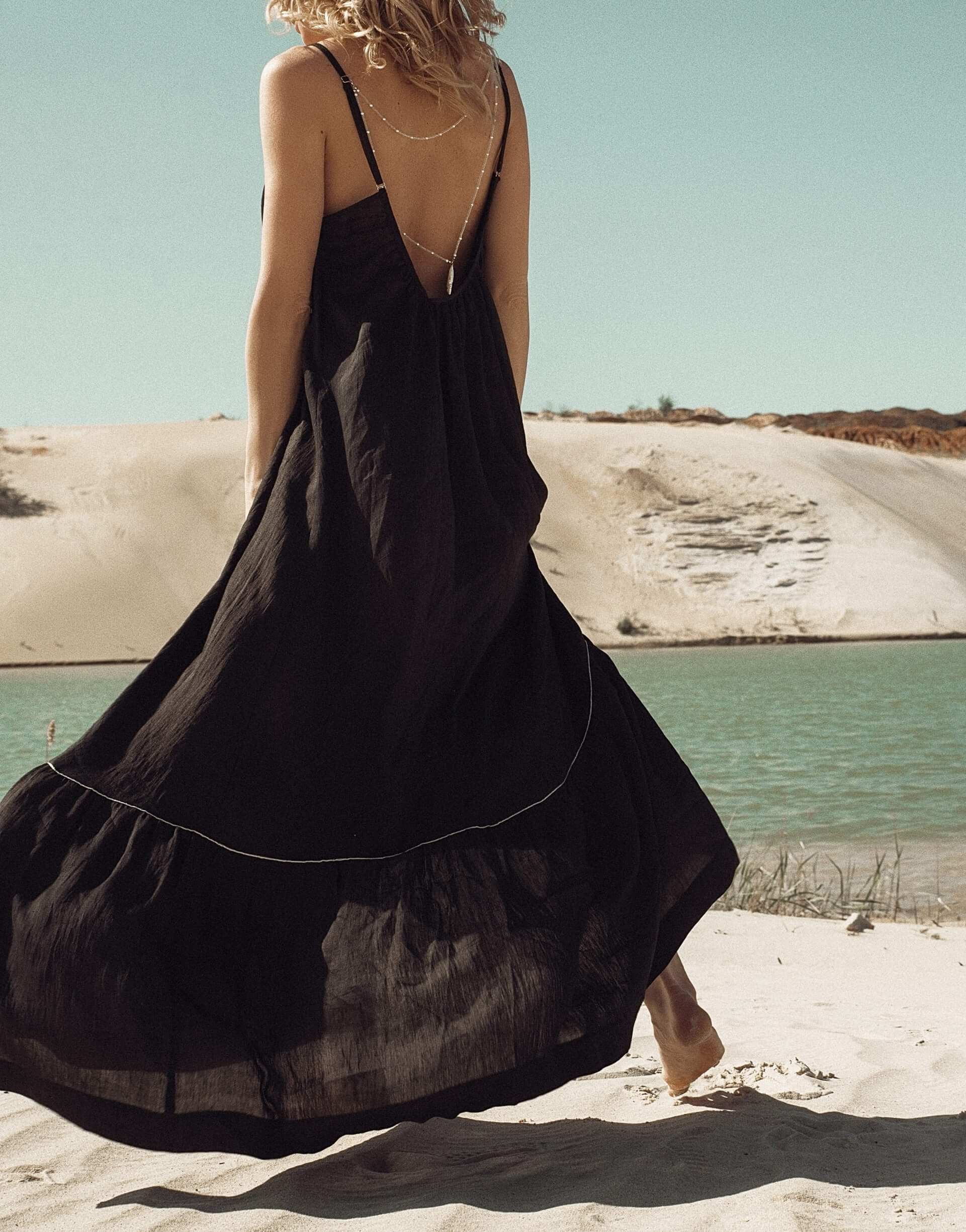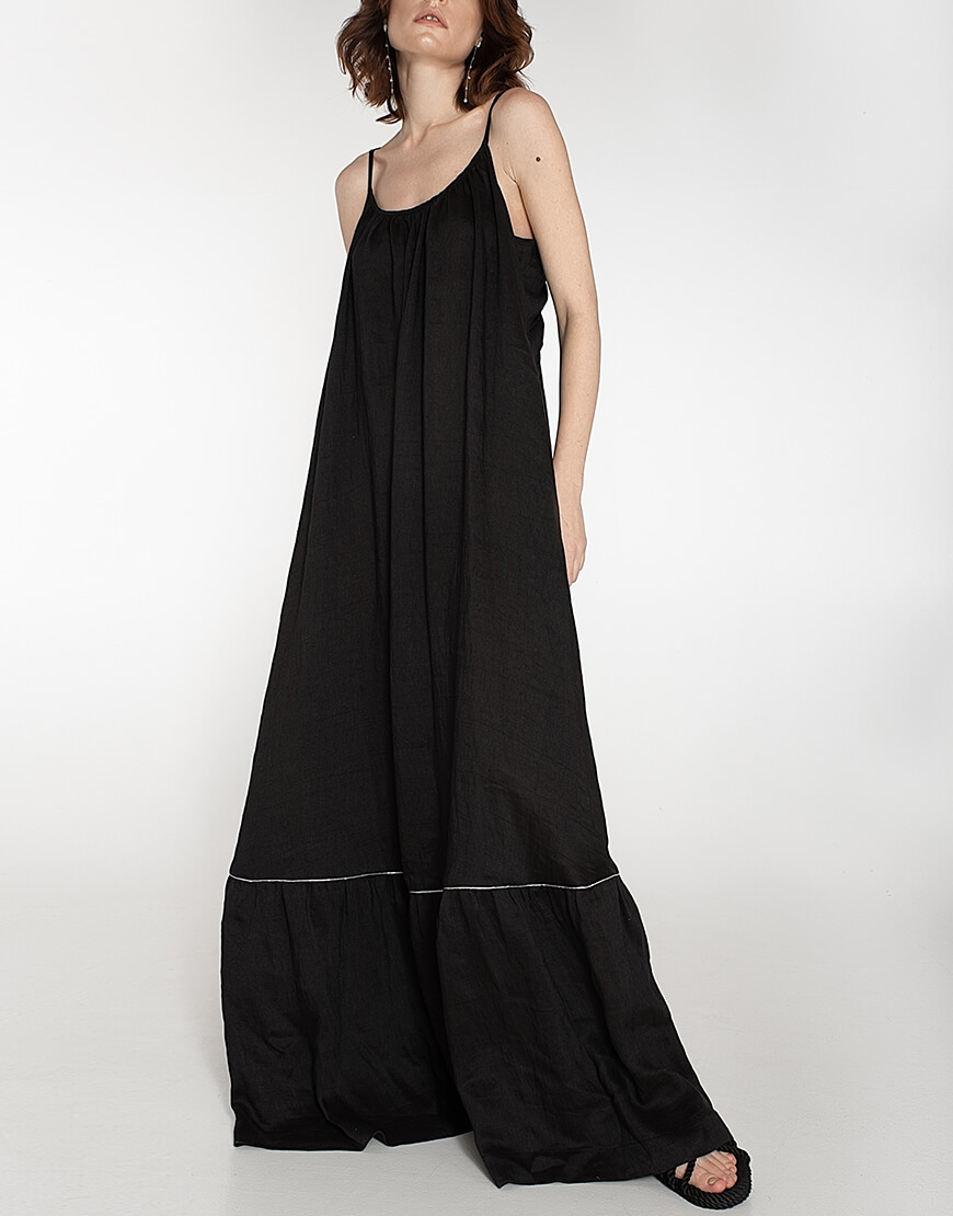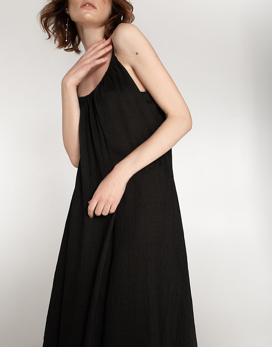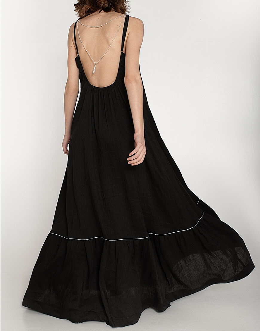 Сарафан на тонких бретелях з відкритою спиною. Знімний декор на спині виконаний з коралових намистин і барокових перлів. Бретелі регульовані – максимальна довжина 49 см. Склад: Льон – 86% Поліакрил – 14% Інструкція з догляду: машинне прання за температури 30 градусів. Режим – делікатне прання, без віджимання. Прасувати можна при низьких температурах до 110 градусів. Інформація про модель: 80-58-88 см. Зріст 172 см