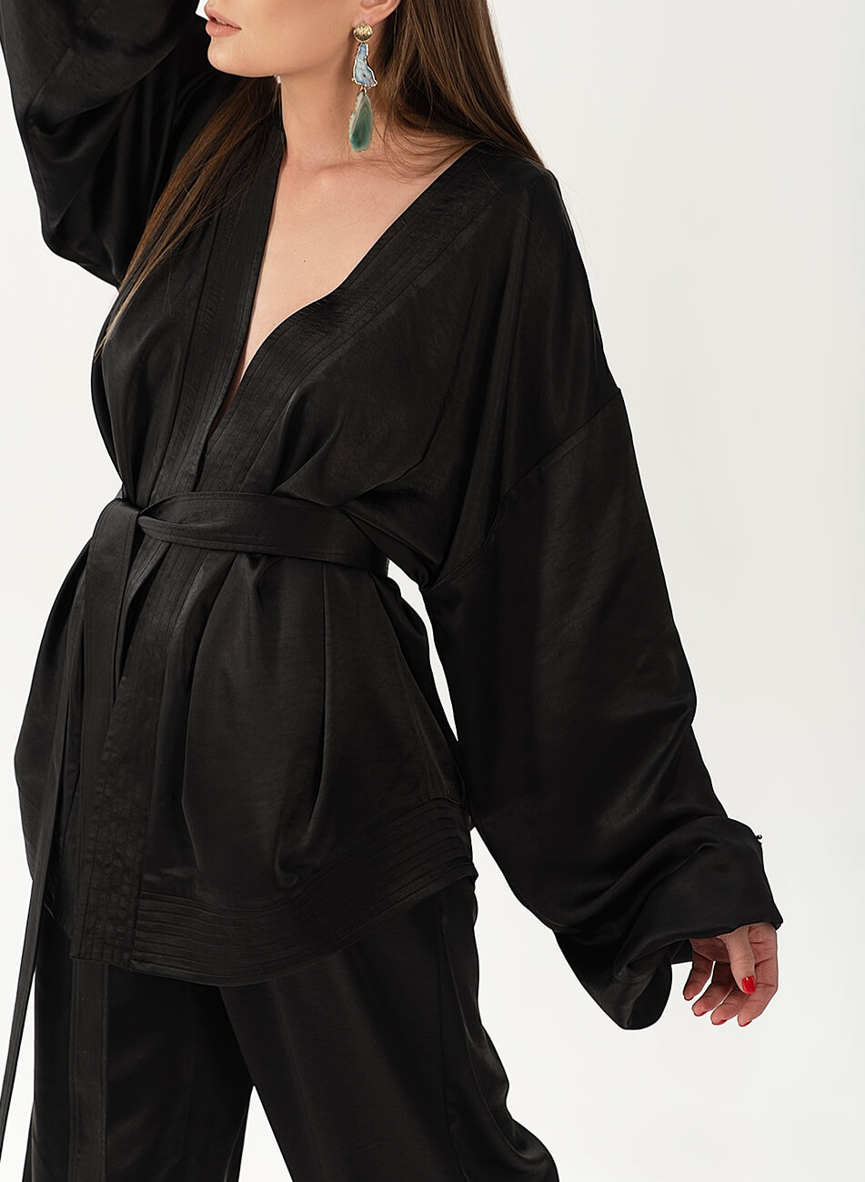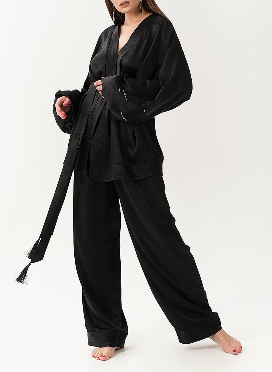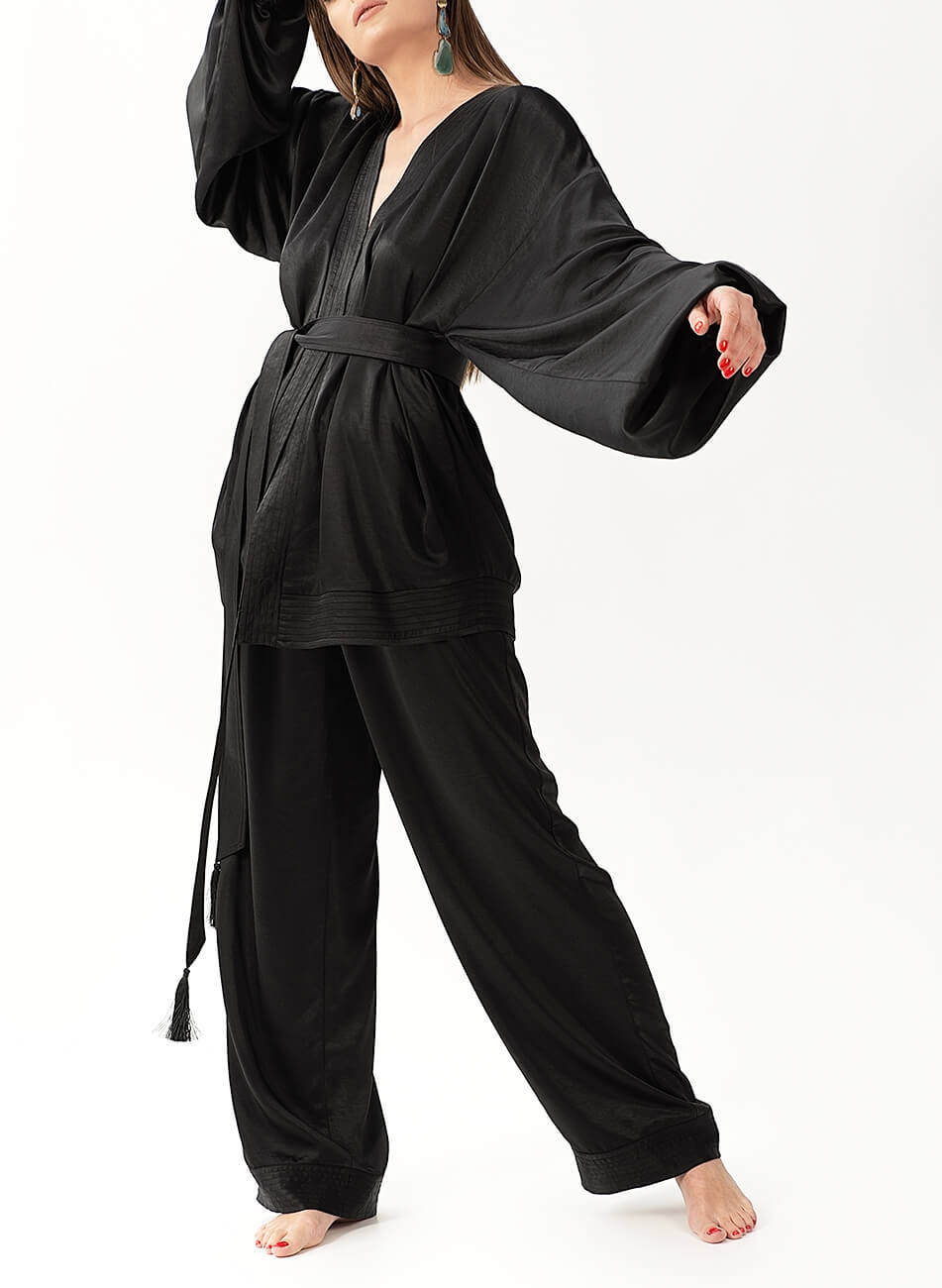 Струмливий сатиновий костюм. У комплекті кімоно з об’ємними рукавами і штани вільного крою, пояс на гумці. Рукава кімоно розшиті золотом і намистинами. У комплекті пояс із шовковими пензликами.