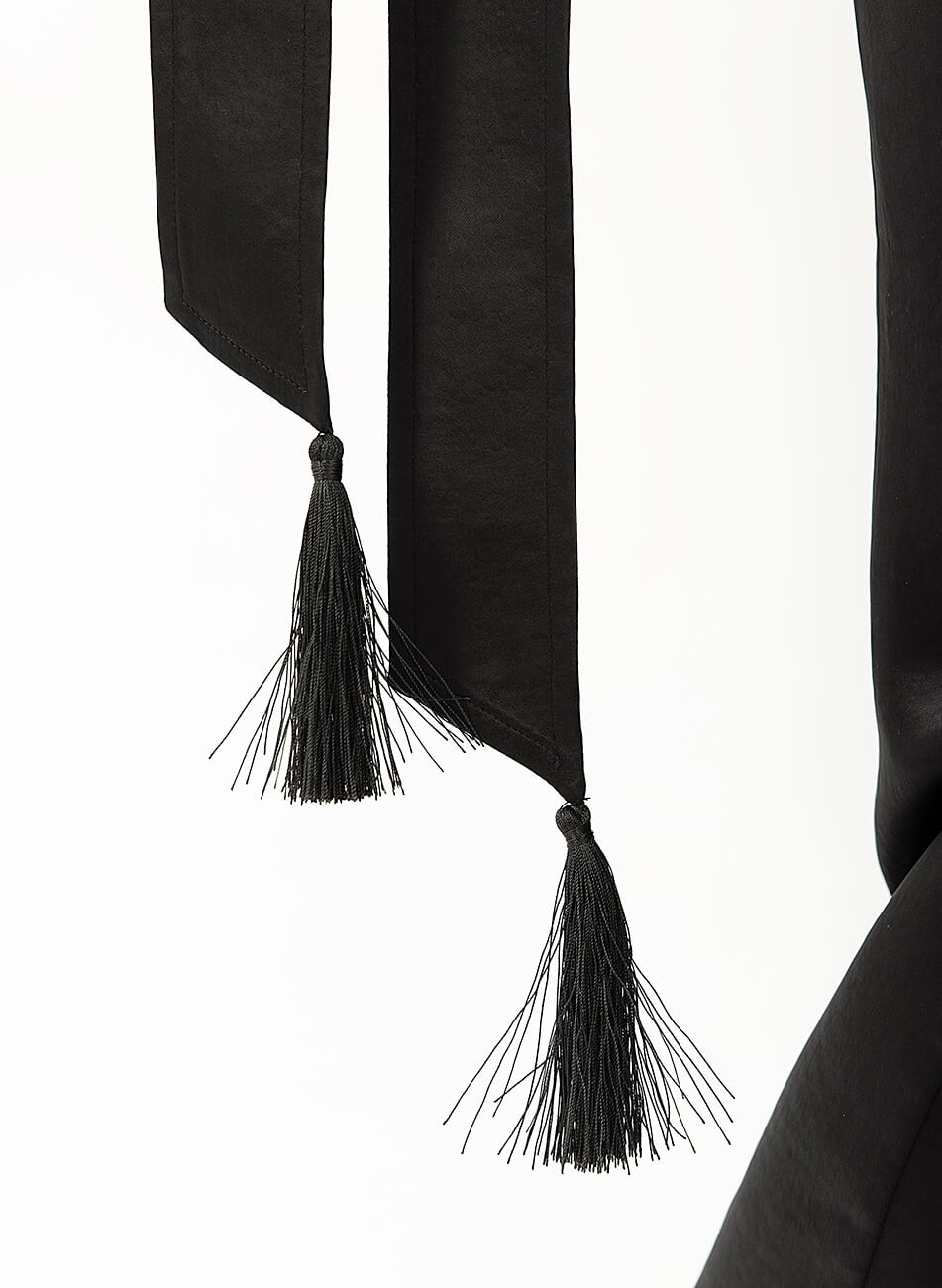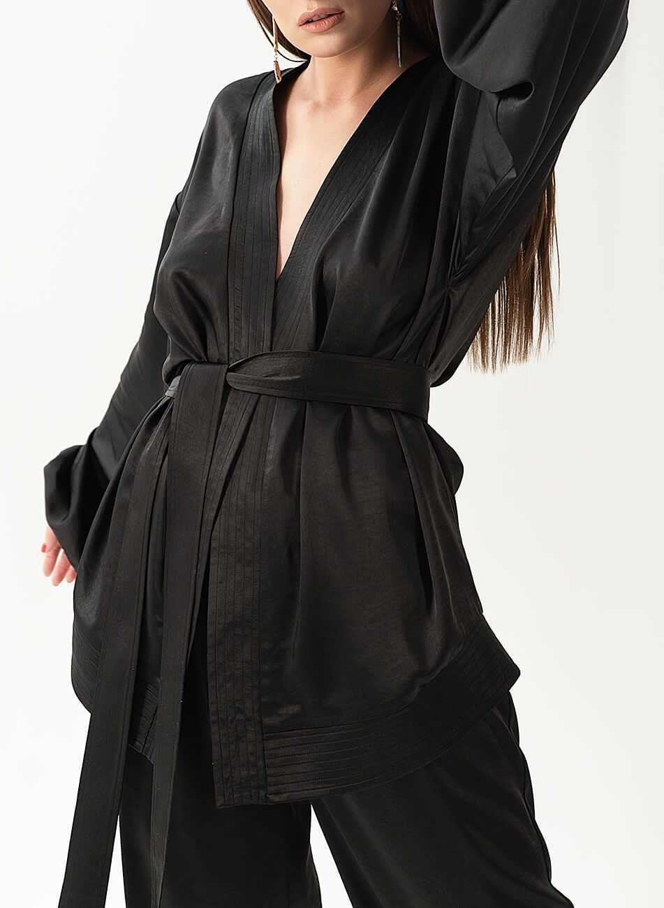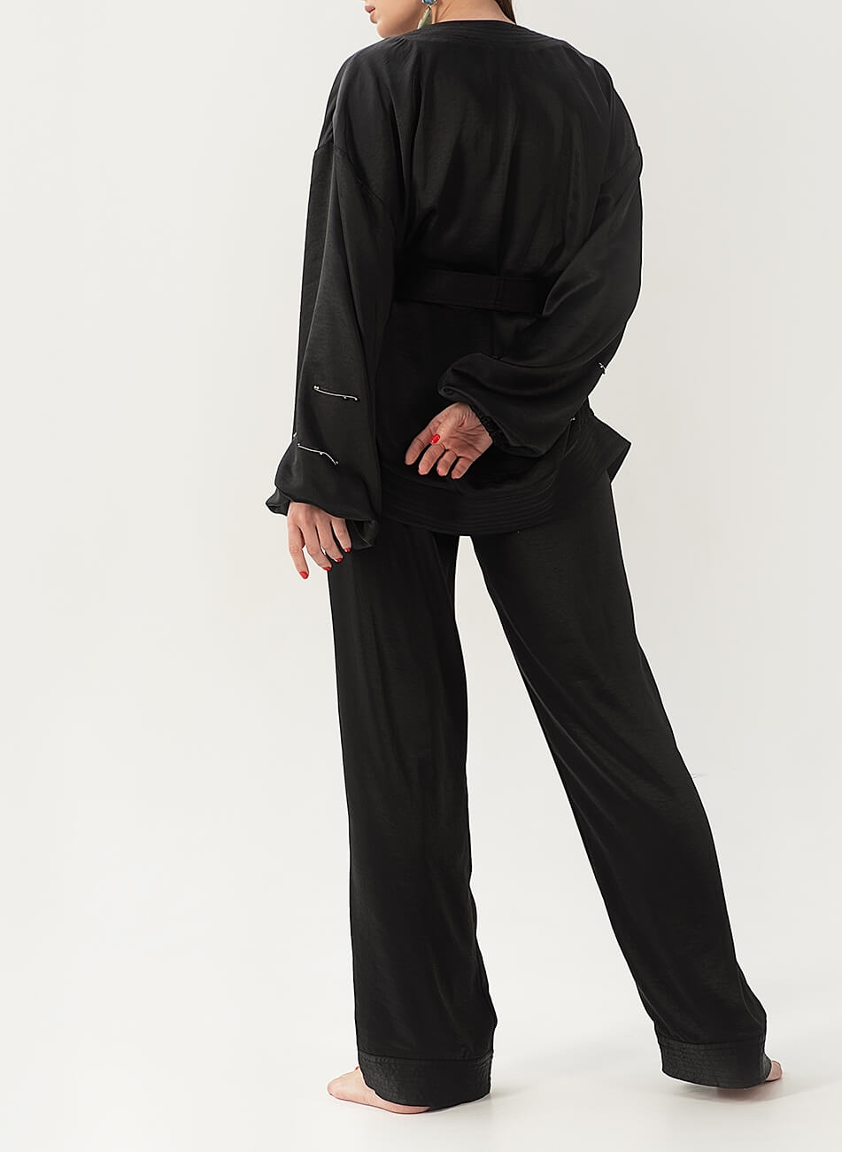 Струмливий сатиновий костюм. У комплекті кімоно з об’ємними рукавами і штани вільного крою, пояс на гумці. Рукава кімоно розшиті золотом і намистинами. У комплекті пояс із шовковими пензликами.