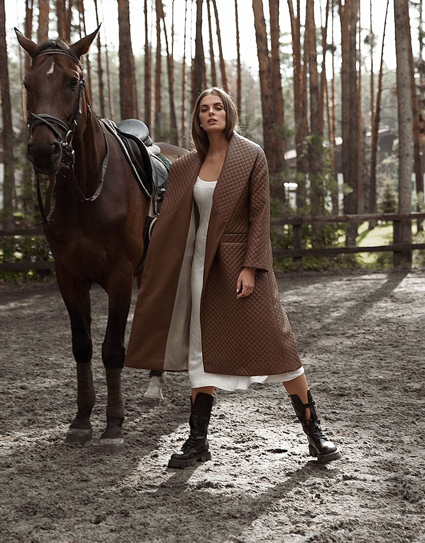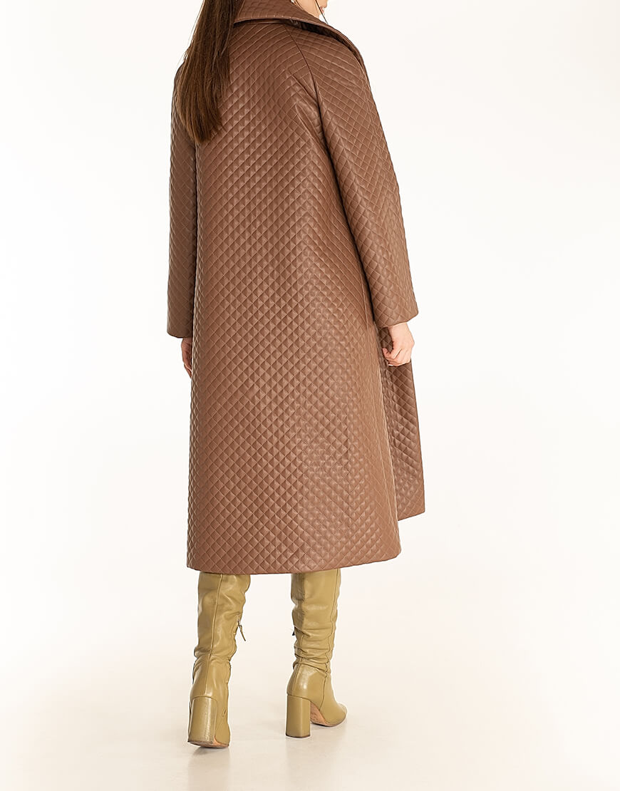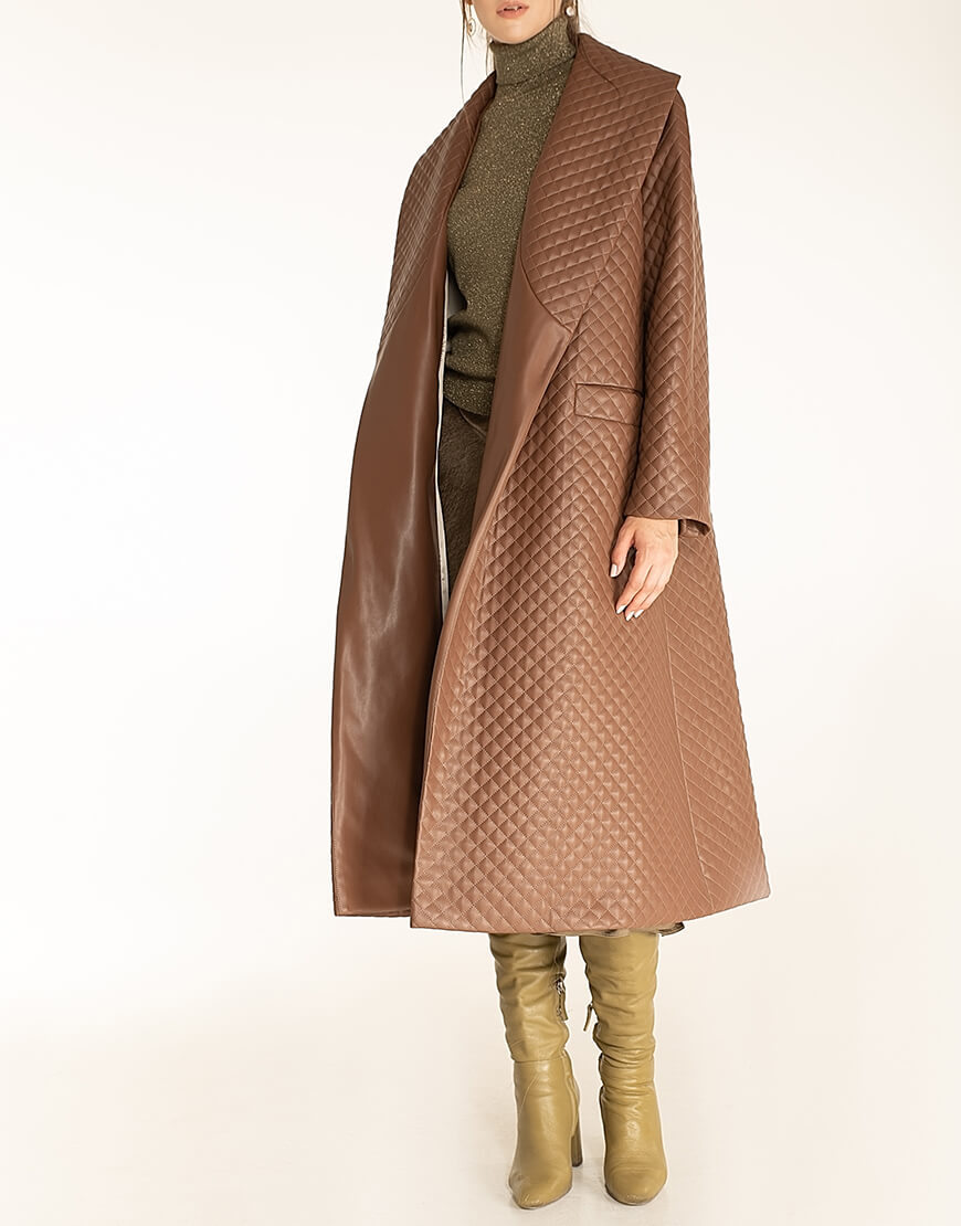 Стьобане пальто з еко-шкіри. Без застібки. У комплекті пояс із пряжкою. Для додаткової фіксації підлоги пальто передбачений полотримач. Еко-шкіра для виробництва пальто була протестована і показала високі показники зносостійкості та стійкості до впливу зовнішнього середовища. Гарантія на матеріал: до 5 років.