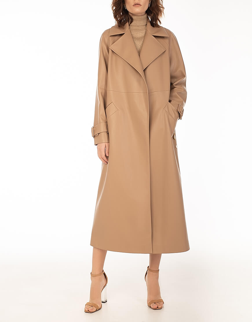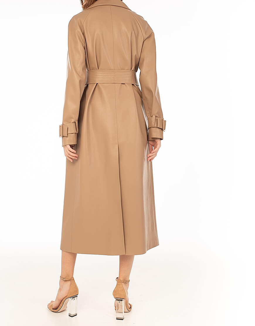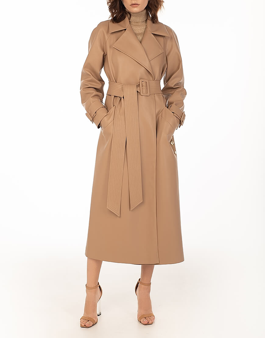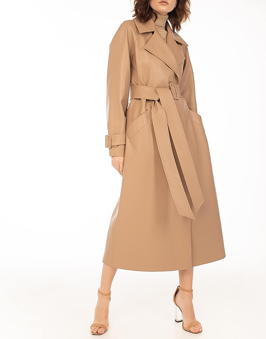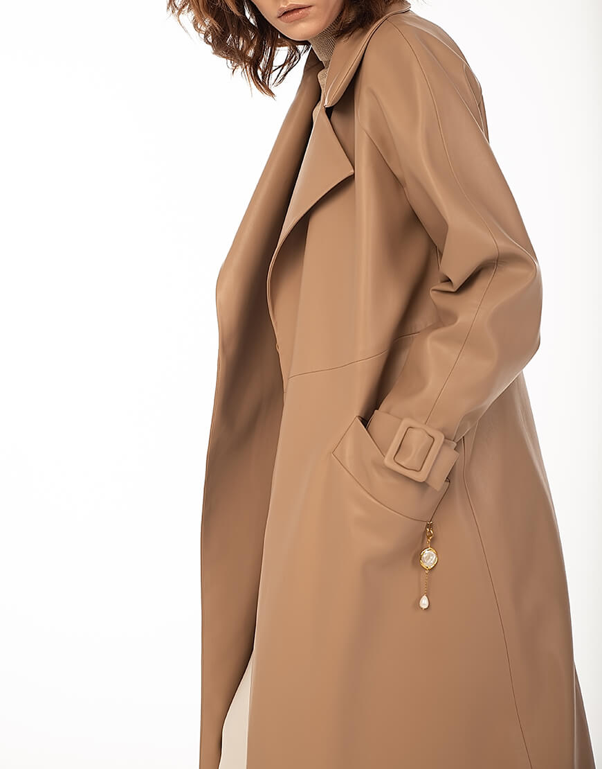 Тренч з еко-шкіри прямого крою. Без застібки. Тренч доповнений поясом із пряжкою. У комплект не входить знімний декор з натуральних перлів. Для додаткової фіксації підлоги тренча передбачений полотримач. Класична модель тренча дає змогу його комбінувати з образами в стилі casual, а також діловими та святковими look ‘ми. Еко-шкіра для виробництва тренча була протестована і показала високі показники зносостійкості та стійкості до впливу зовнішнього середовища. Гарантія на матеріал: до 5 років.