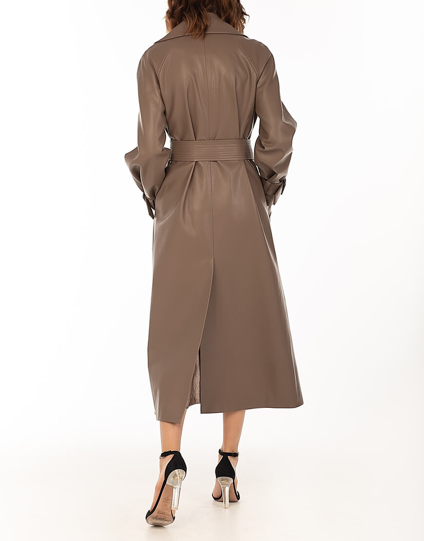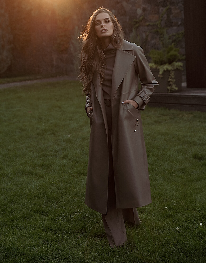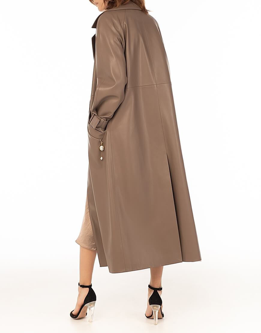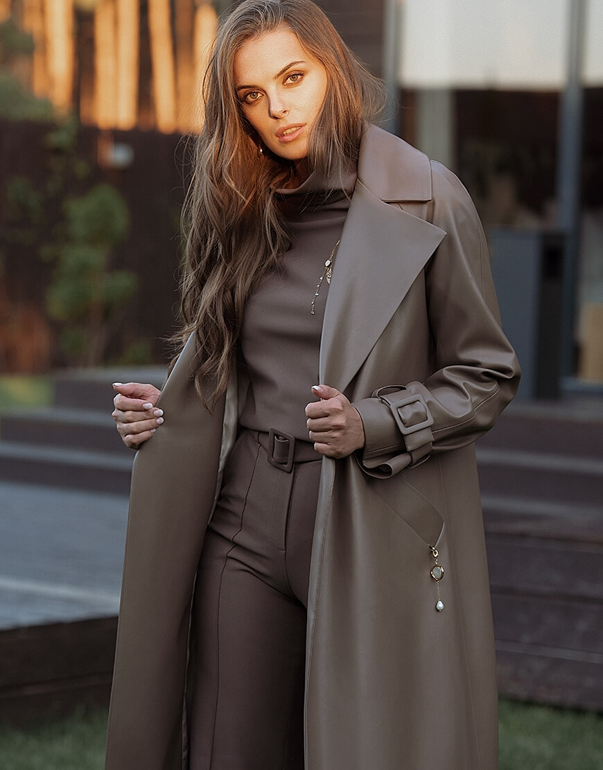 Тренч з еко-шкіри прямого крою. Без застібки. Тренч доповнений поясом із пряжкою. У комплект не входить знімний декор з натуральних перлів. Для додаткової фіксації підлоги тренча передбачений полотримач. Класична модель тренча дає змогу його комбінувати з образами в стилі casual, а також діловими та святковими look ‘ми. Еко-шкіра для виробництва тренча була протестована і показала високі показники зносостійкості та стійкості до впливу зовнішнього середовища. Гарантія на матеріал: до 5 років.