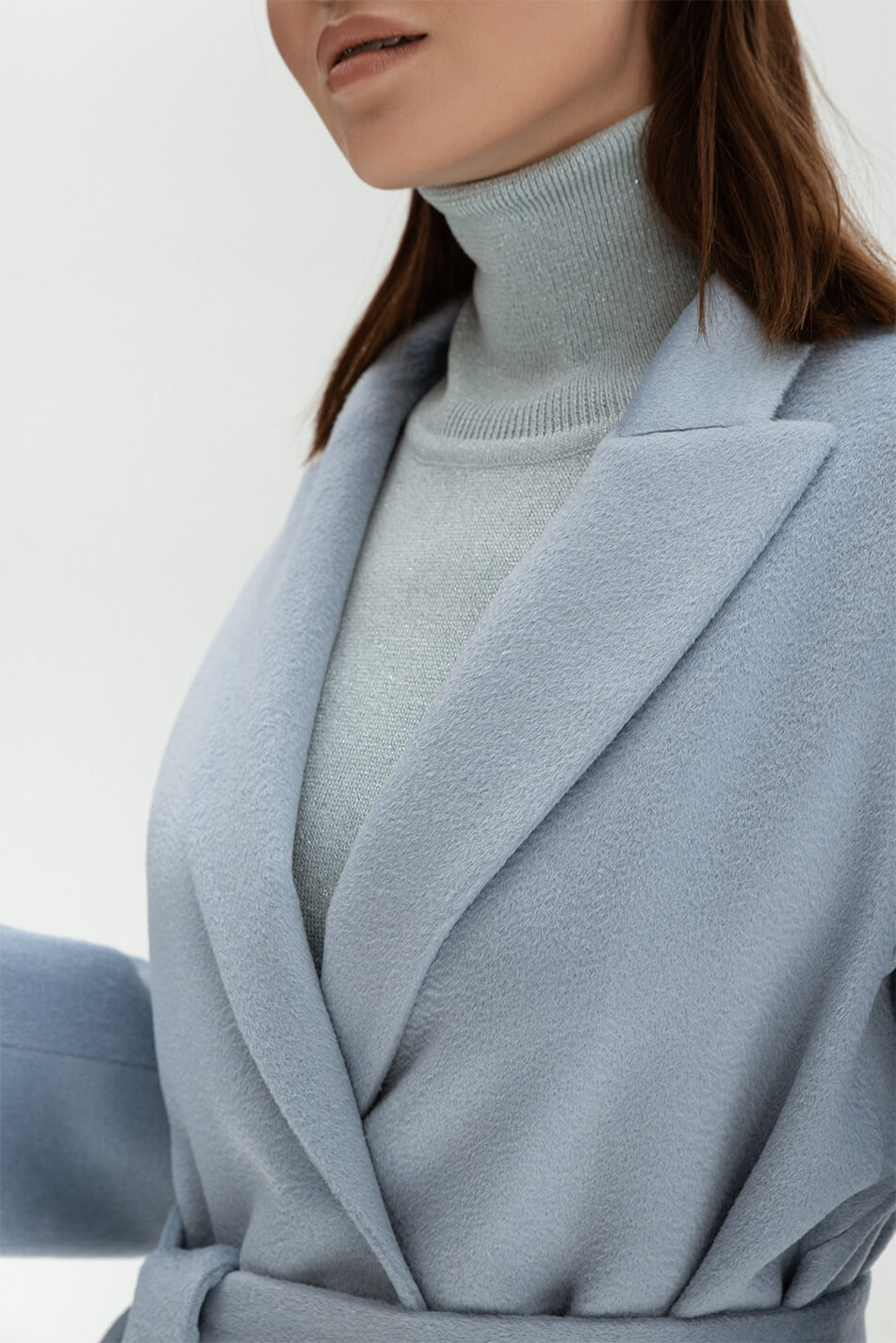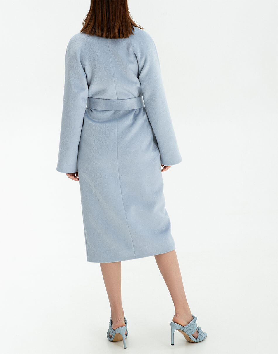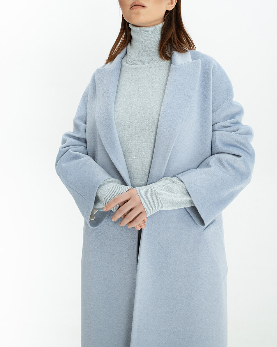 Кашемірове пальто з рукавом реглан і відстрочкою “ручний стібок”. У комплекті пояс.