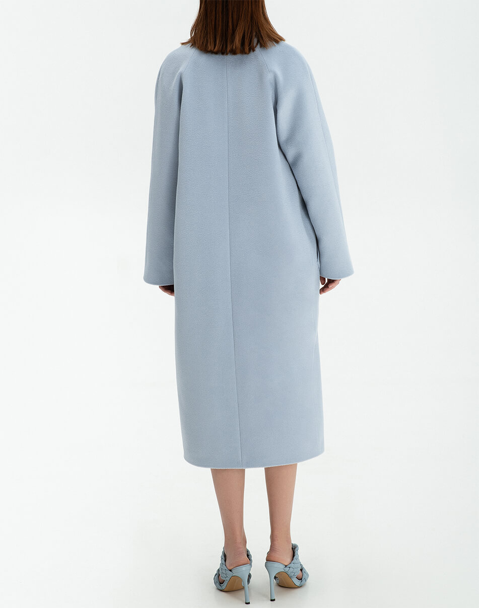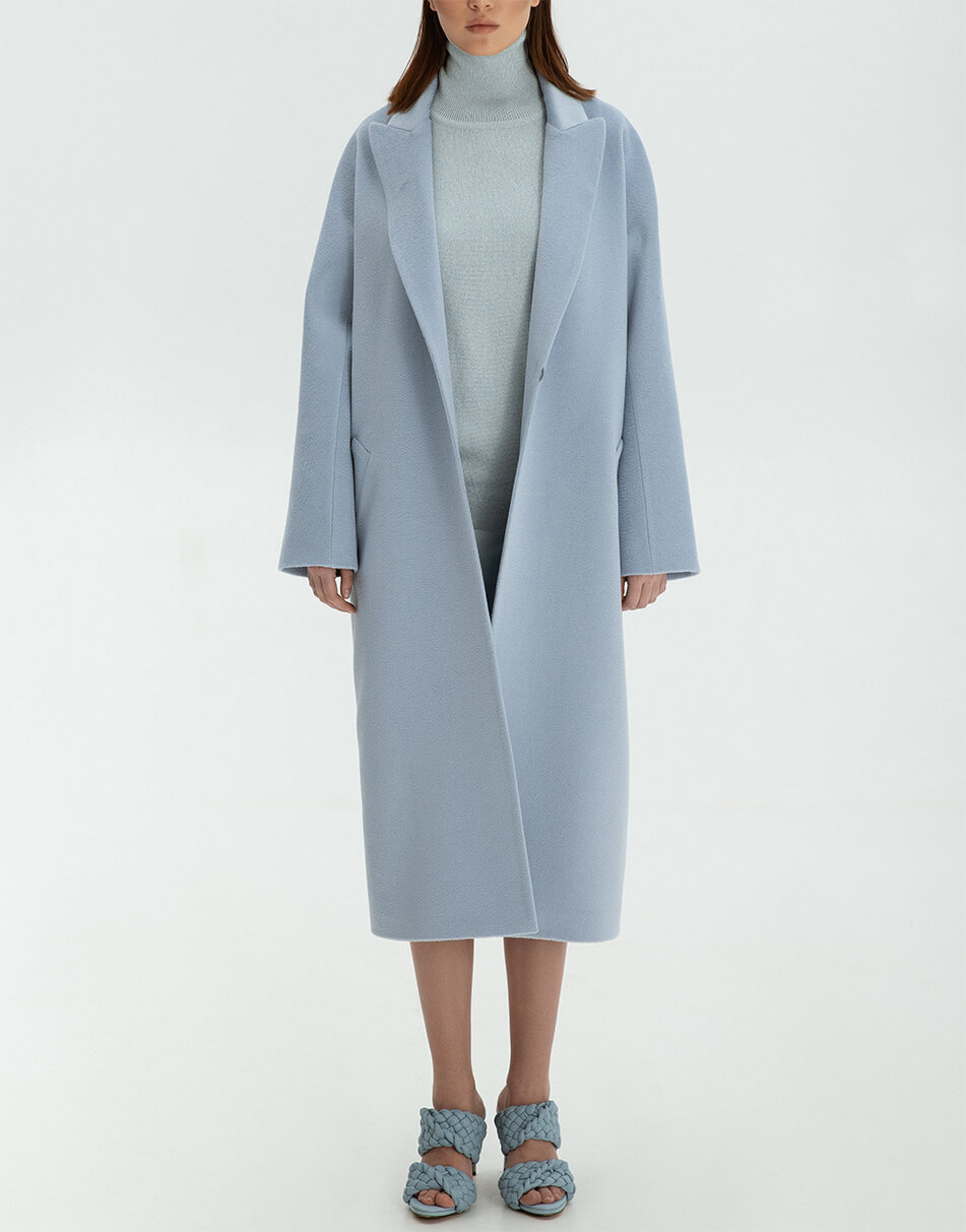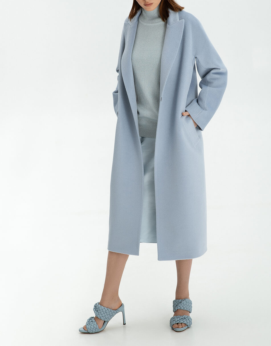 Кашемірове пальто з рукавом реглан і відстрочкою “ручний стібок”. У комплекті пояс.