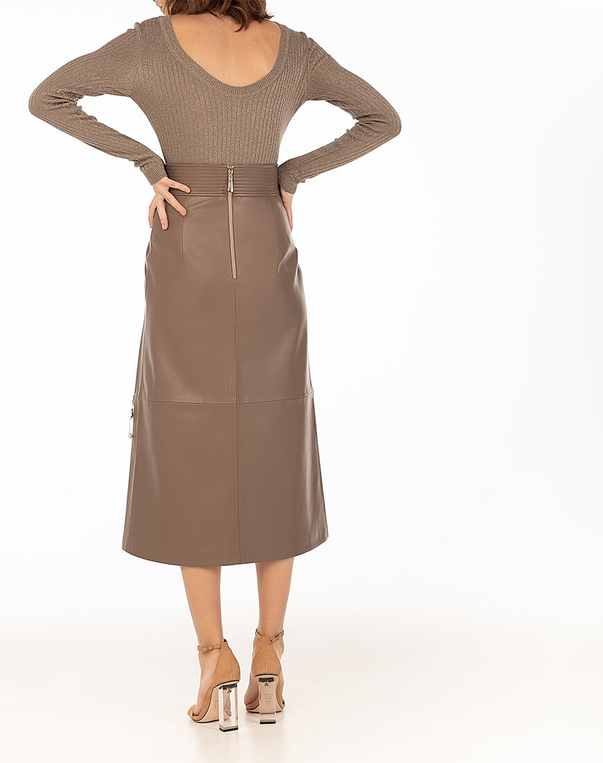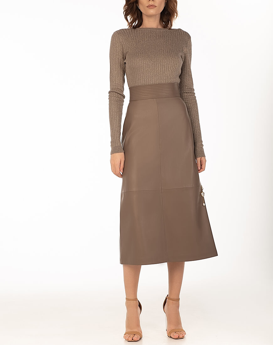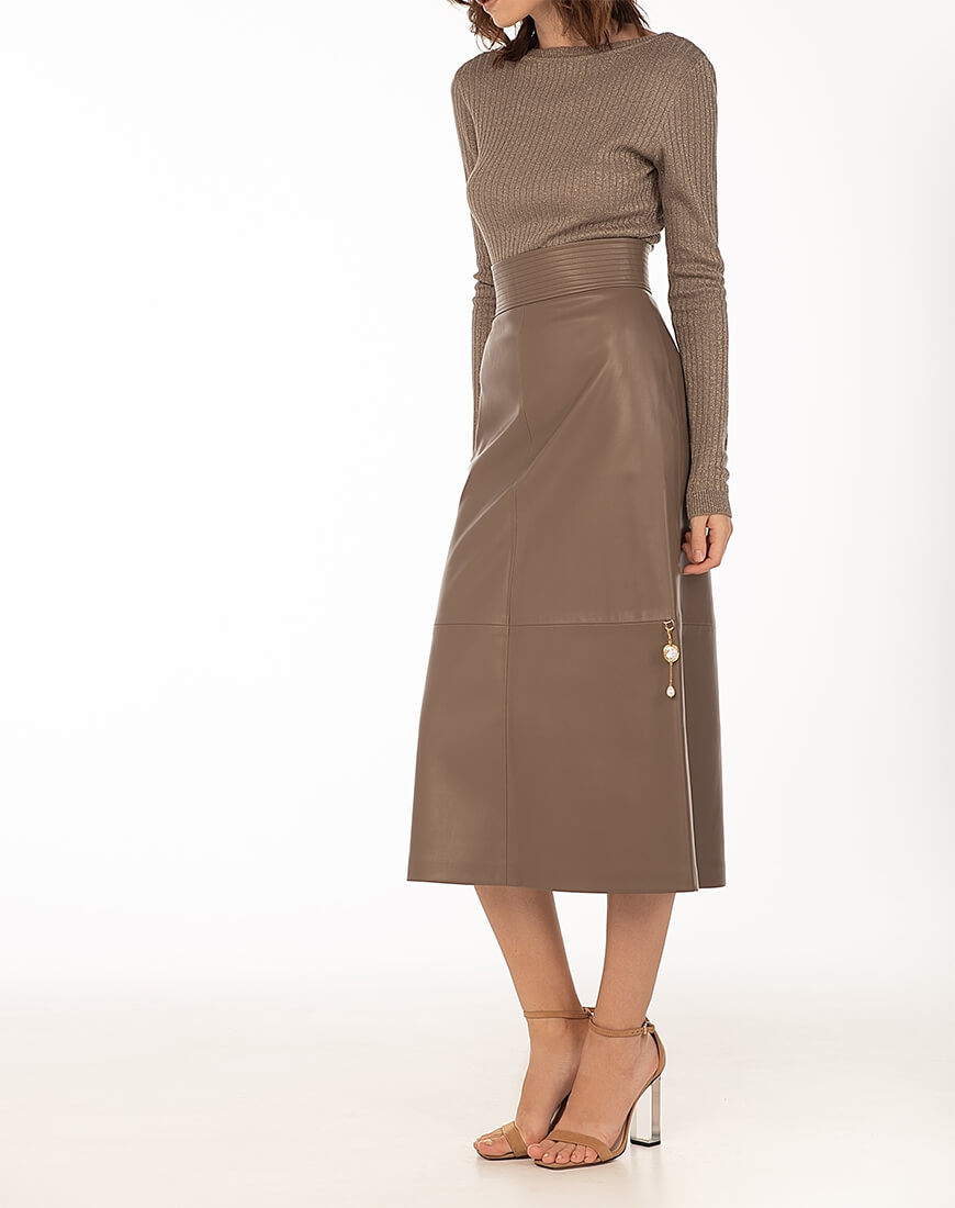 Спідниця-трапеція з широким поясом з еко-шкіри. Знімний декор з натуральних перлів не входить до комплекту. Еко-шкіра для виробництва спідниці була протестована і показала високі показники зносостійкості та стійкості до впливу зовнішнього середовища. Гарантія на матеріал: до 5 років.