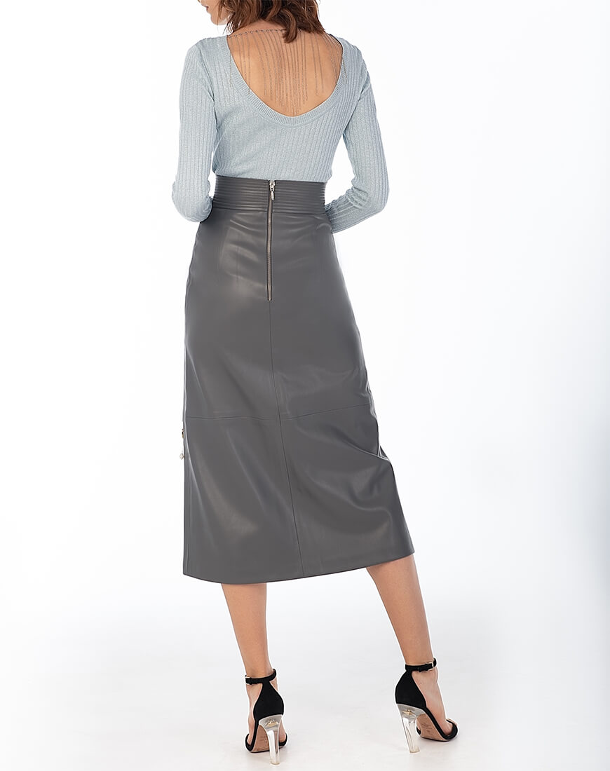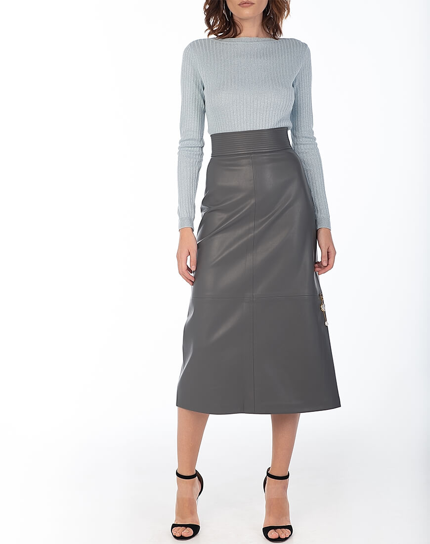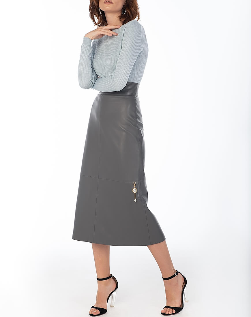 Спідниця-трапеція з широким поясом з еко-шкіри. Знімний декор з натуральних перлів не входить до комплекту. Еко-шкіра для виробництва спідниці була протестована і показала високі показники зносостійкості та стійкості до впливу зовнішнього середовища. Гарантія на матеріал: до 5 років.
