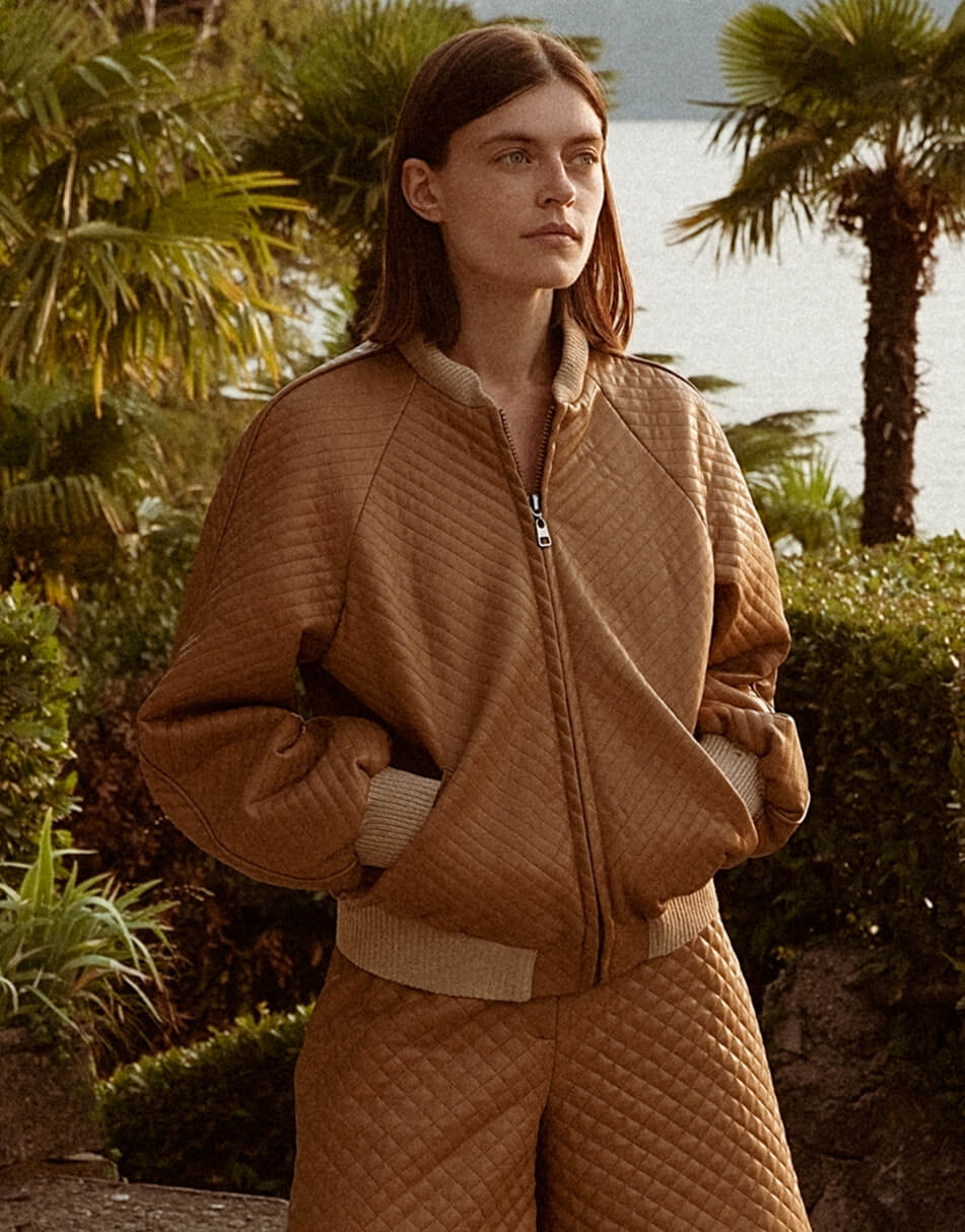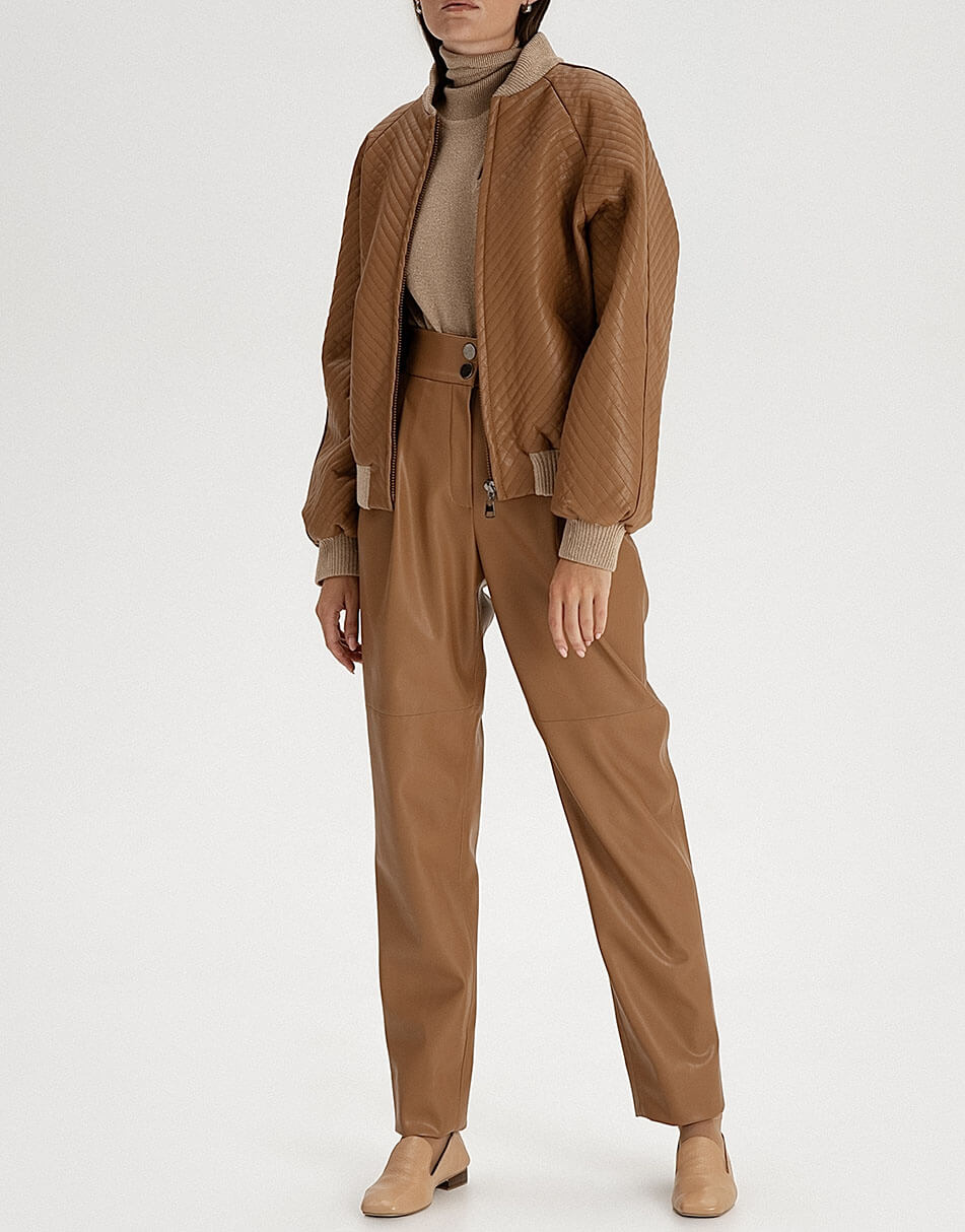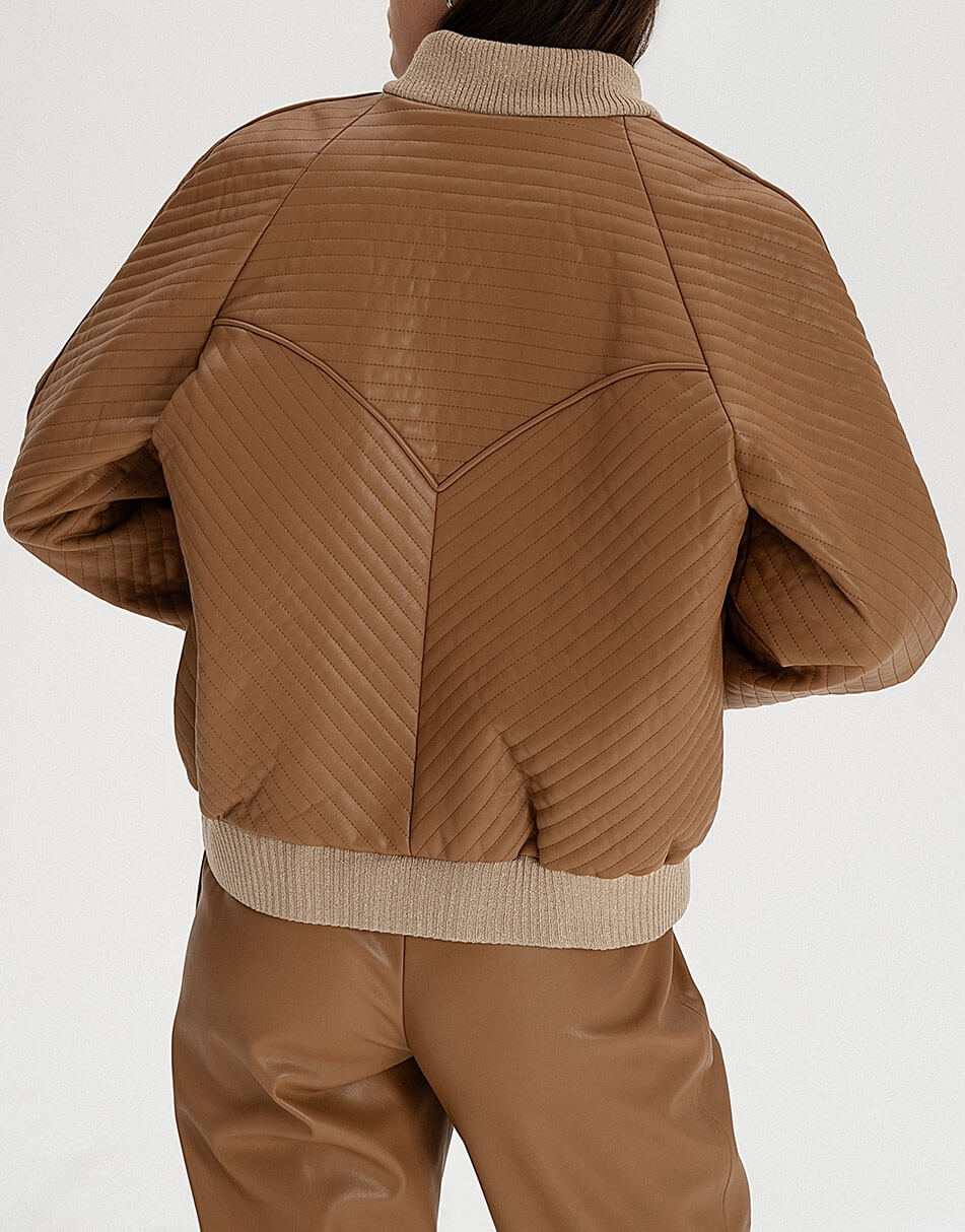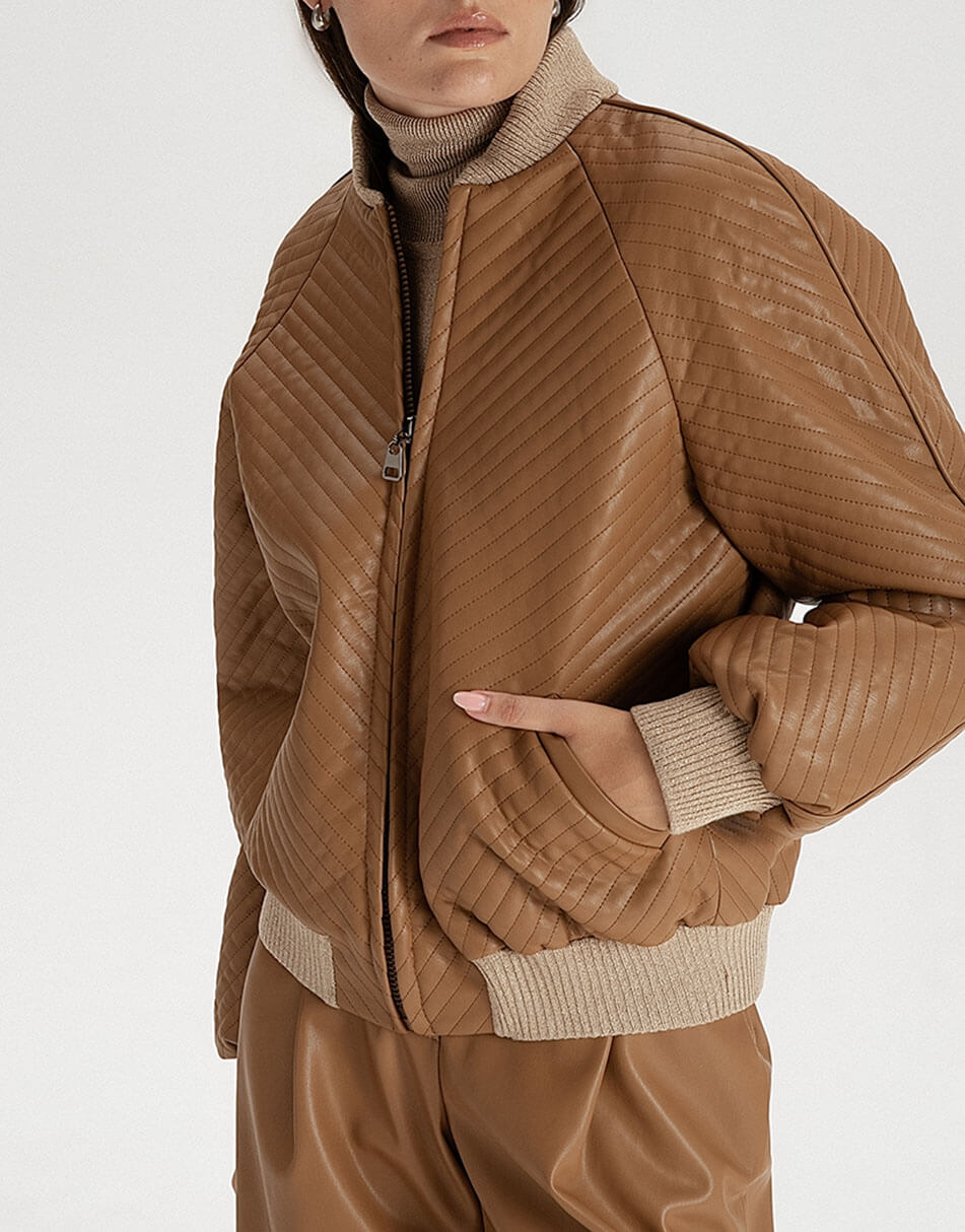 Стьобаний бомбер з еко-шкіри. Низ бомбера, комір і манжети – дов’язані з італійського трикотажу. Застібка: блискавка. Модель на підкладці зі 100% віскози.