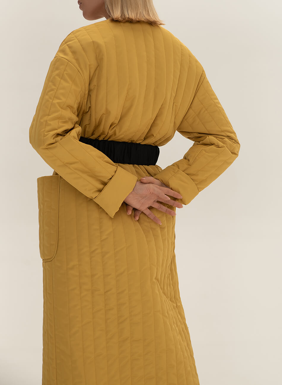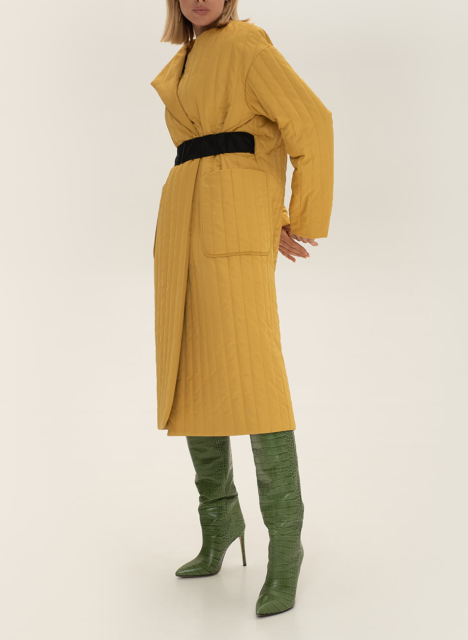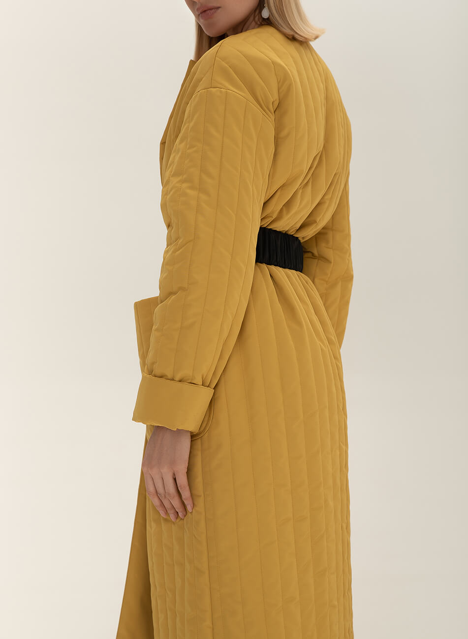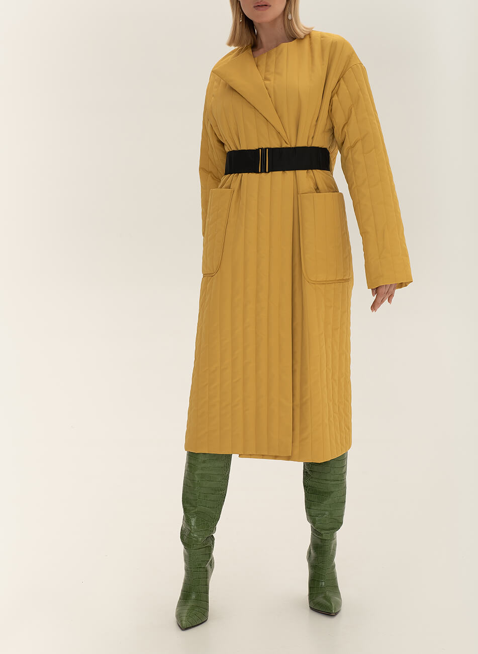 Пряме стьобане пальто з плащової тканини. У комплекті пояс чорного кольору з пряжкою.