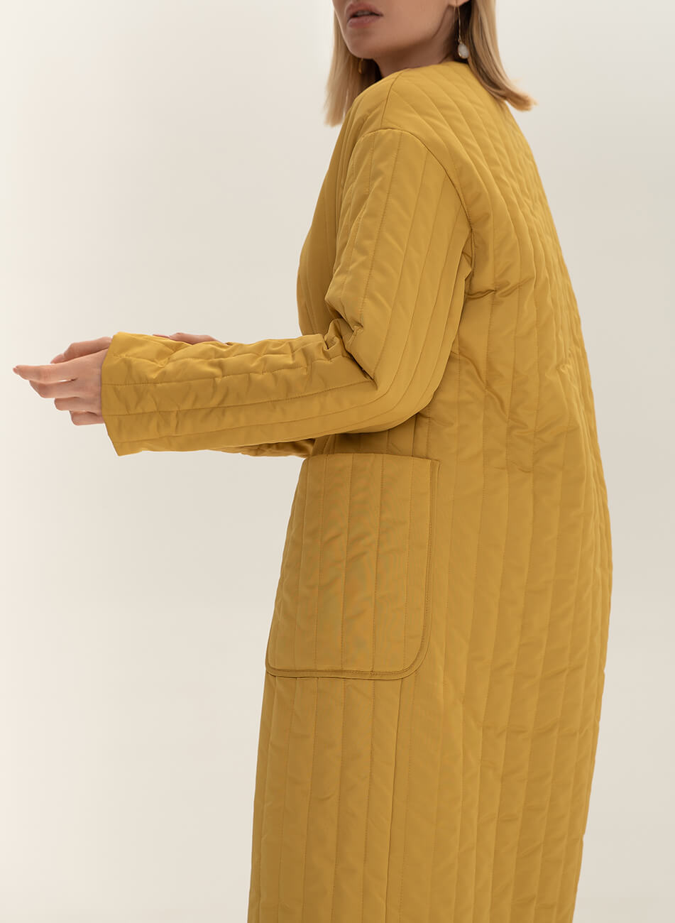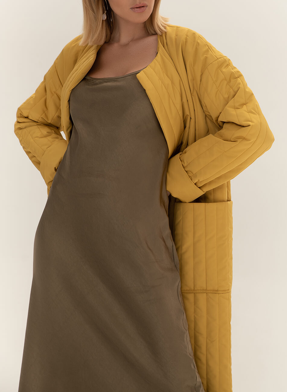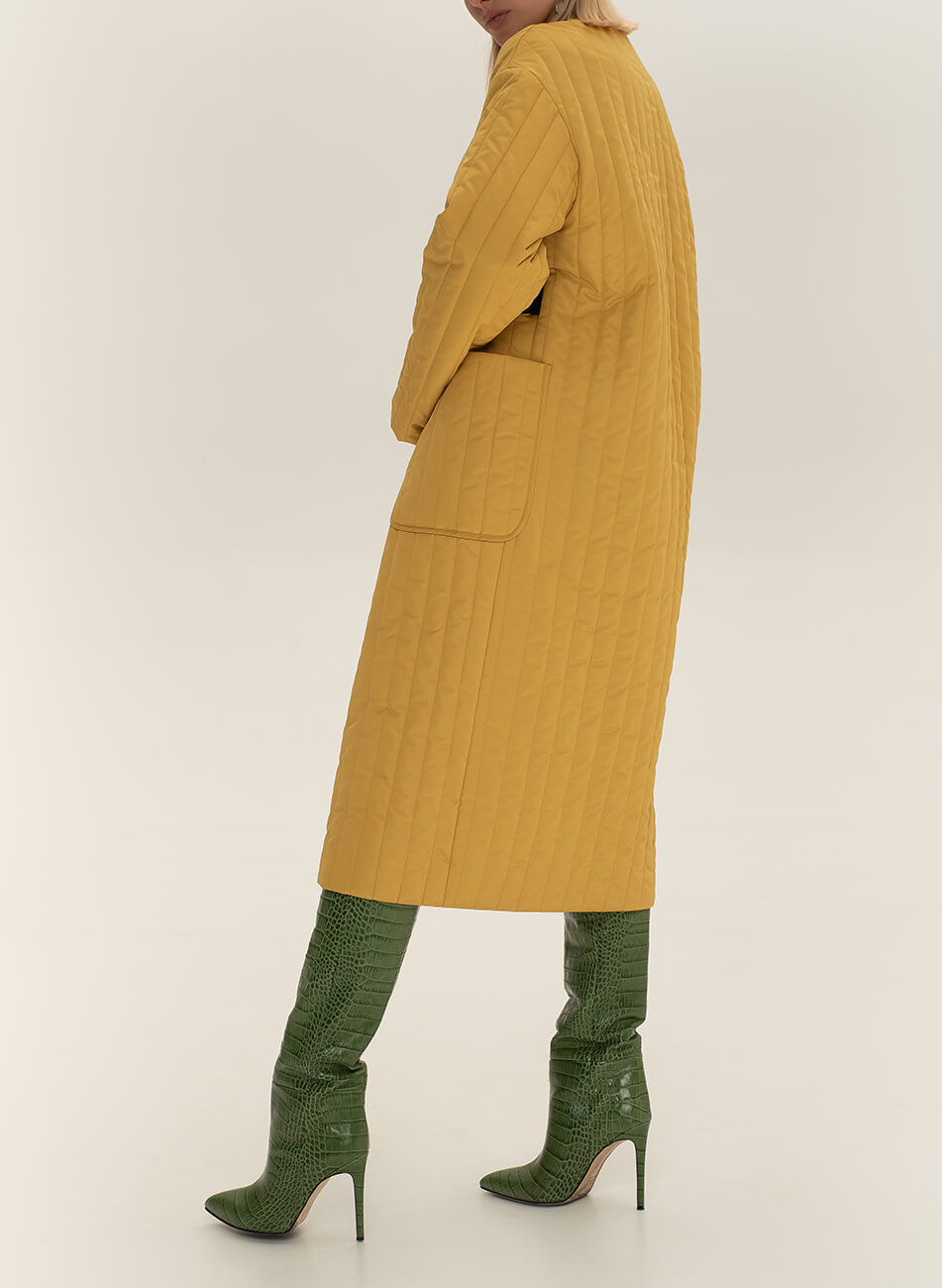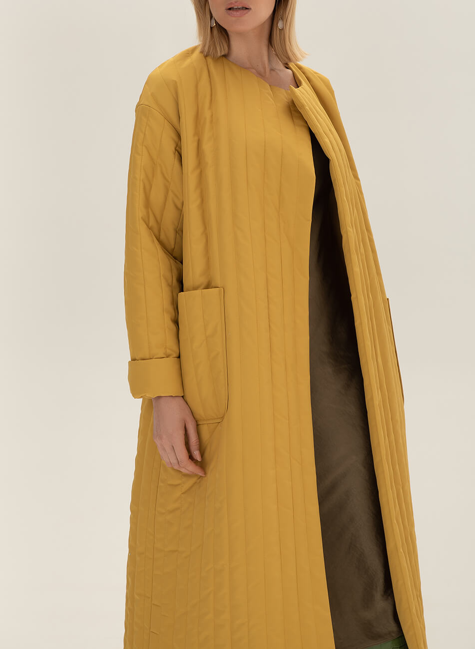 Пряме стьобане пальто з плащової тканини. У комплекті пояс чорного кольору з пряжкою.