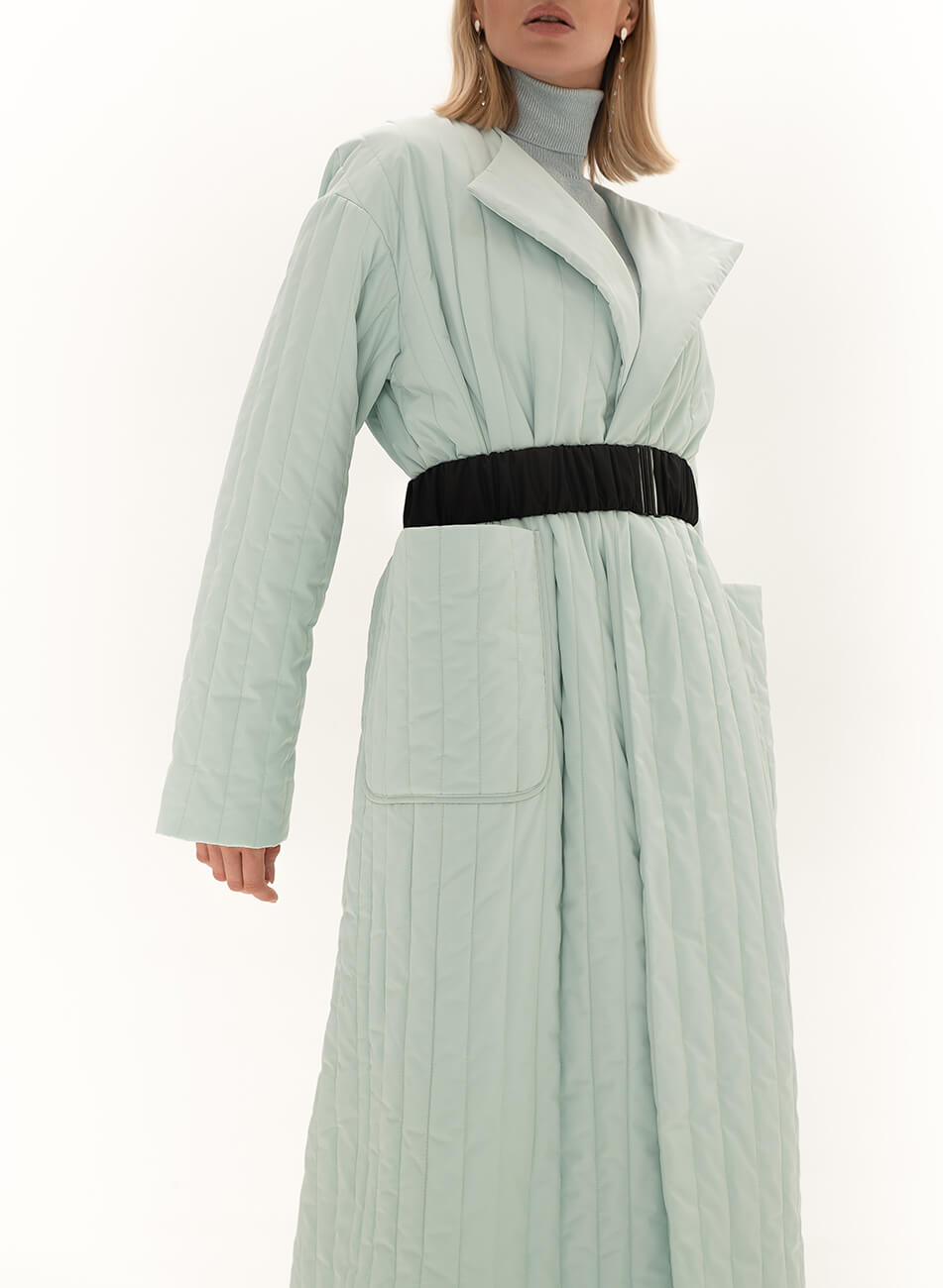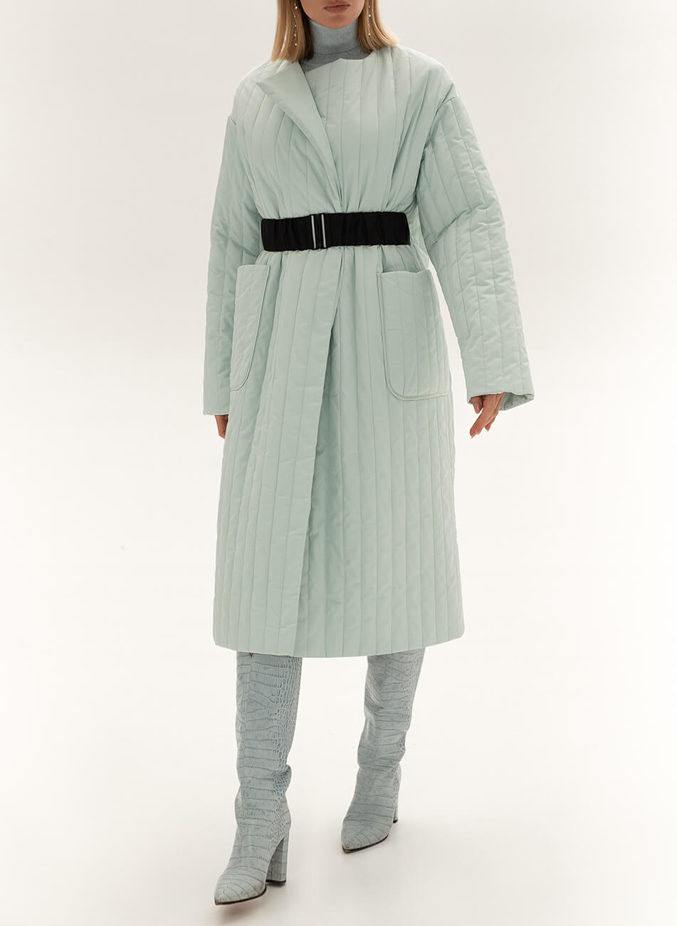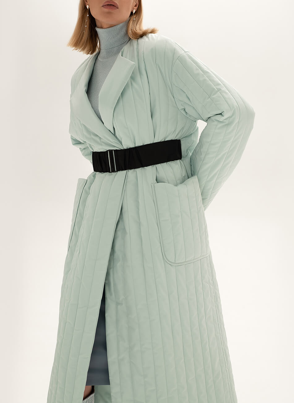 Пряме стьобане пальто з плащової тканини. У комплекті пояс чорного кольору з пряжкою.