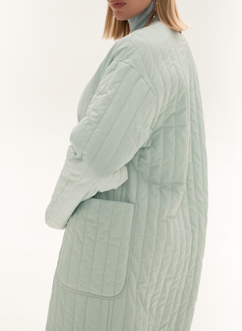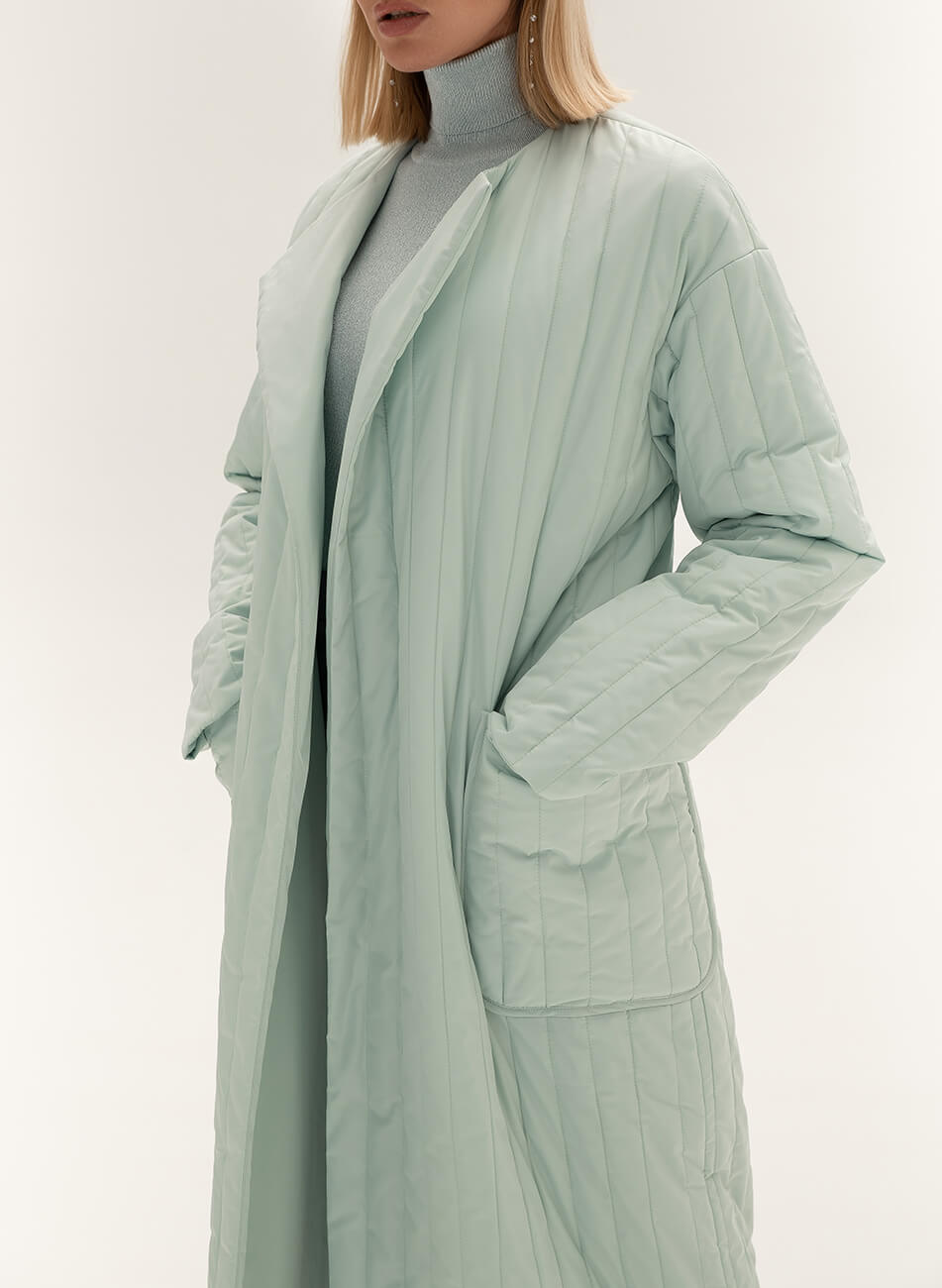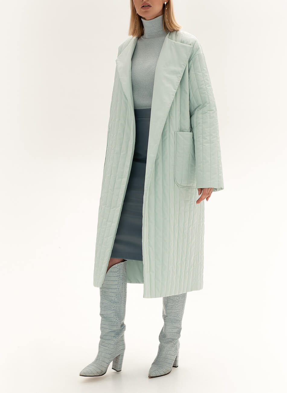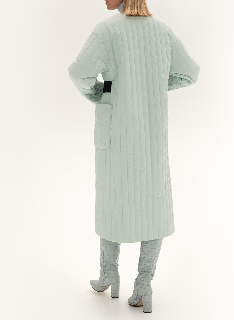 Пряме стьобане пальто з плащової тканини. У комплекті пояс чорного кольору з пряжкою.