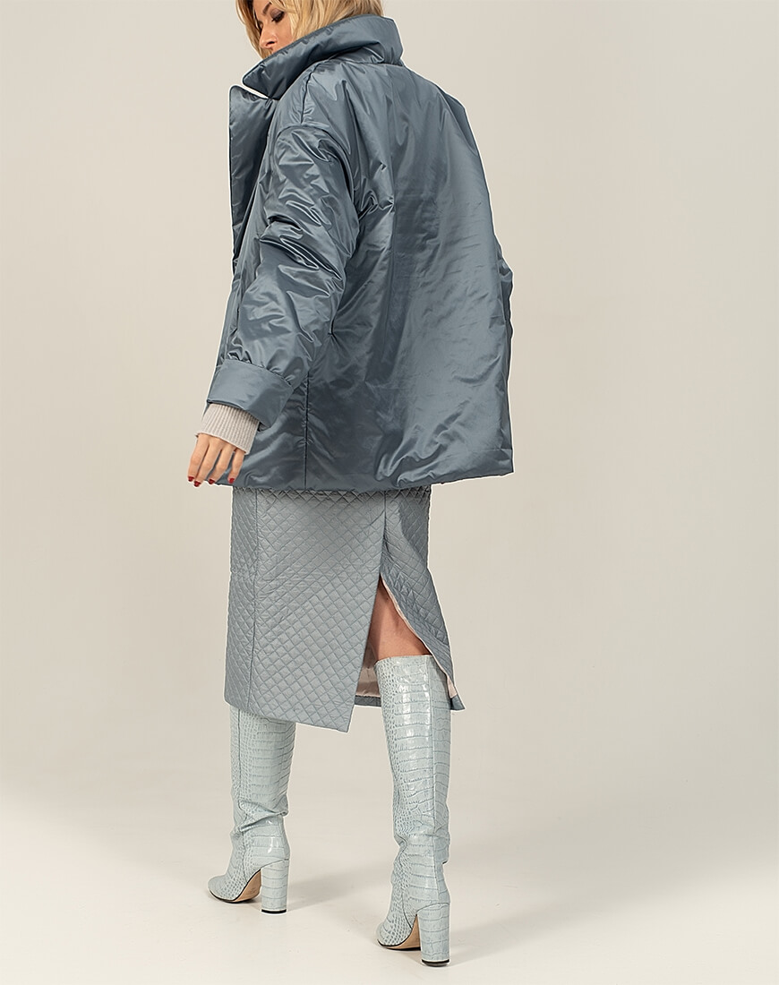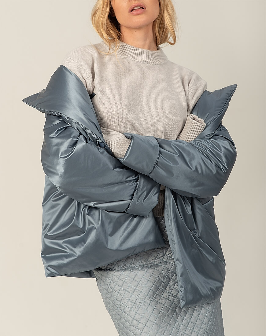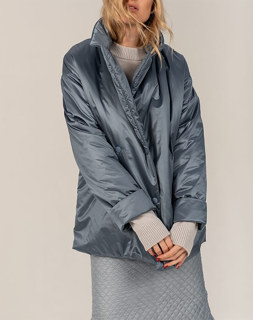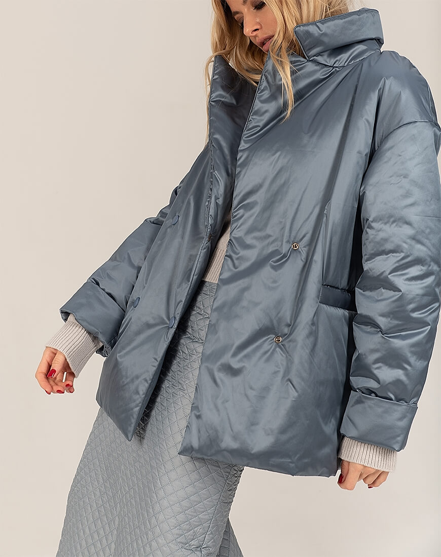 Короткий зимовий пуховик на кнопках із класичною формою коміра. У комплекті пояс із пряжкою. Температурний режим: до мінус 15С.
