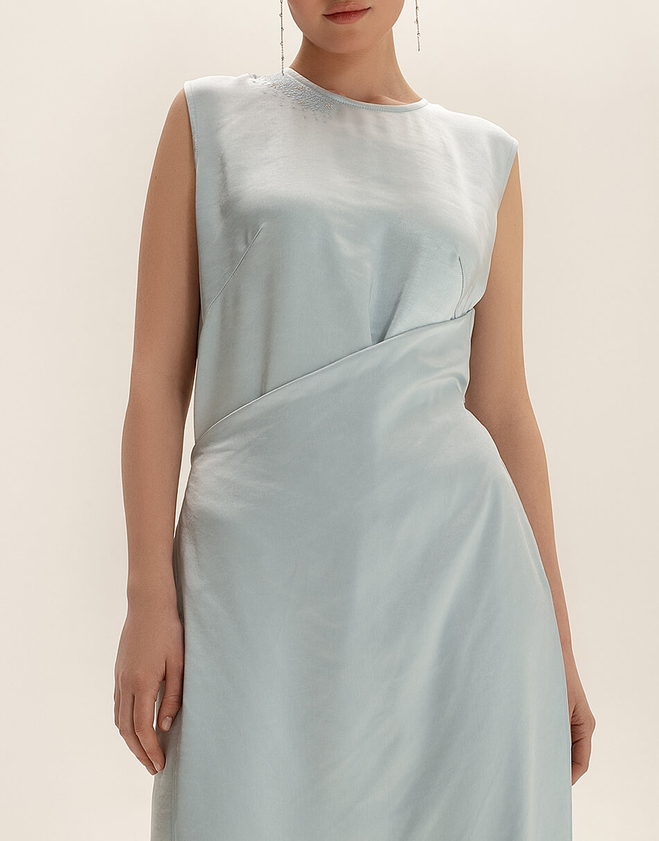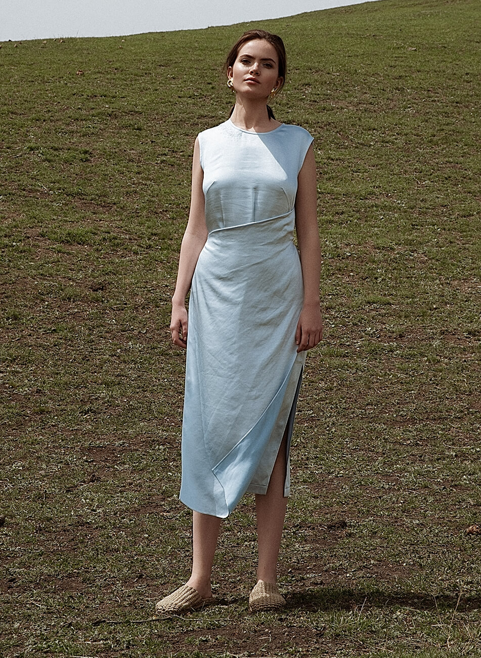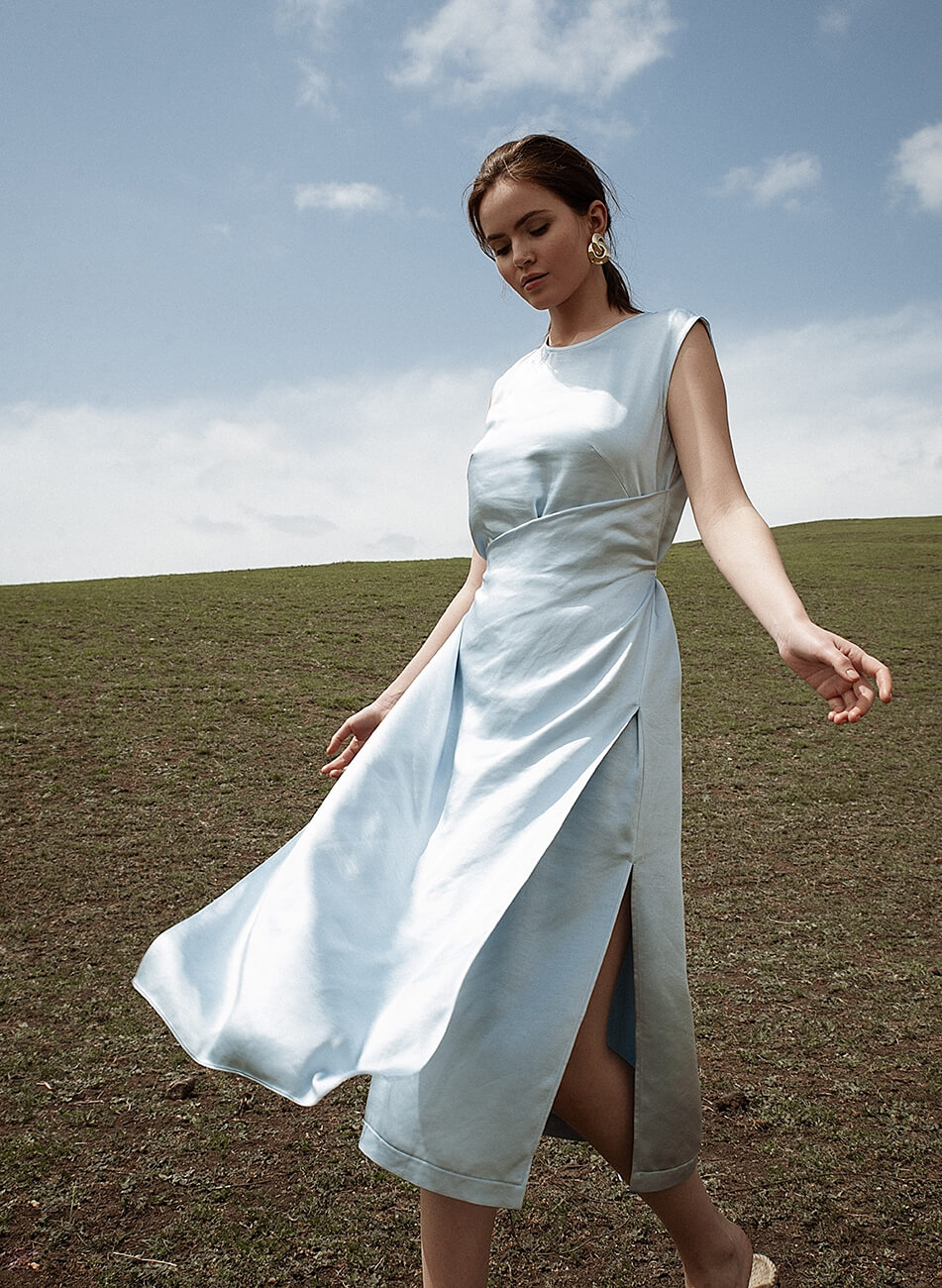 Сатинова сукня міді. Права верхня сторона сукні декорована вишивкою. Особливість моделі – відлітна деталь, яка заходить зліва на право і фіксується тонким поясом. Бічний шов з лівого боку закінчується розрізом. З правого боку розріз відсутній.