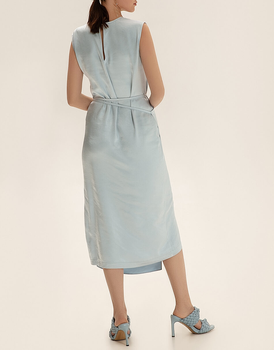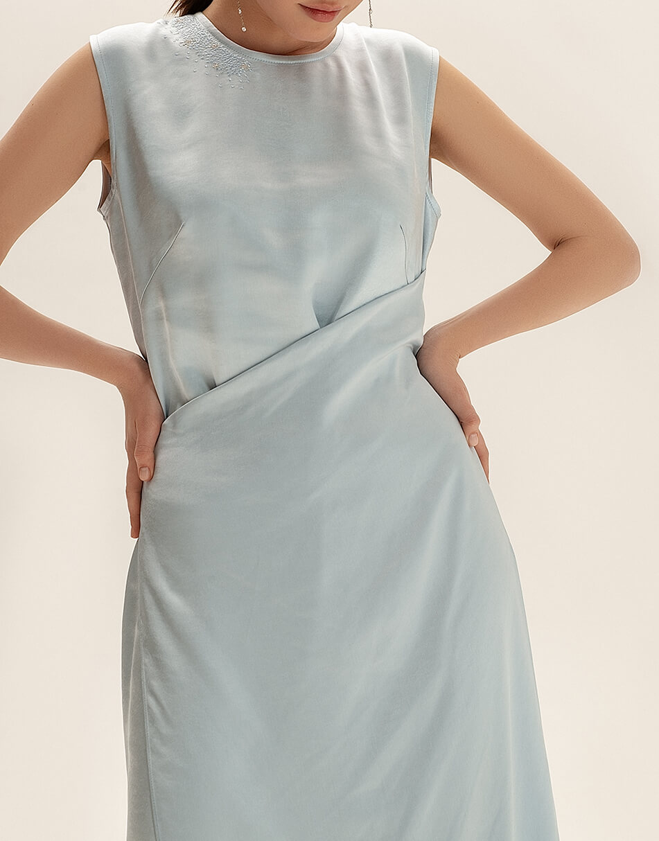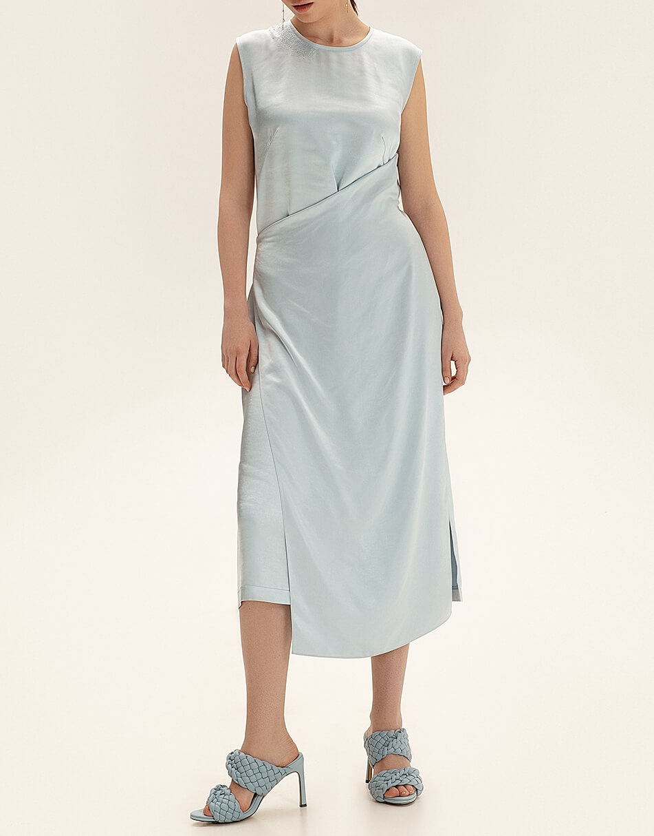 Сатинова сукня міді. Права верхня сторона сукні декорована вишивкою. Особливість моделі – відлітна деталь, яка заходить зліва на право і фіксується тонким поясом. Бічний шов з лівого боку закінчується розрізом. З правого боку розріз відсутній.