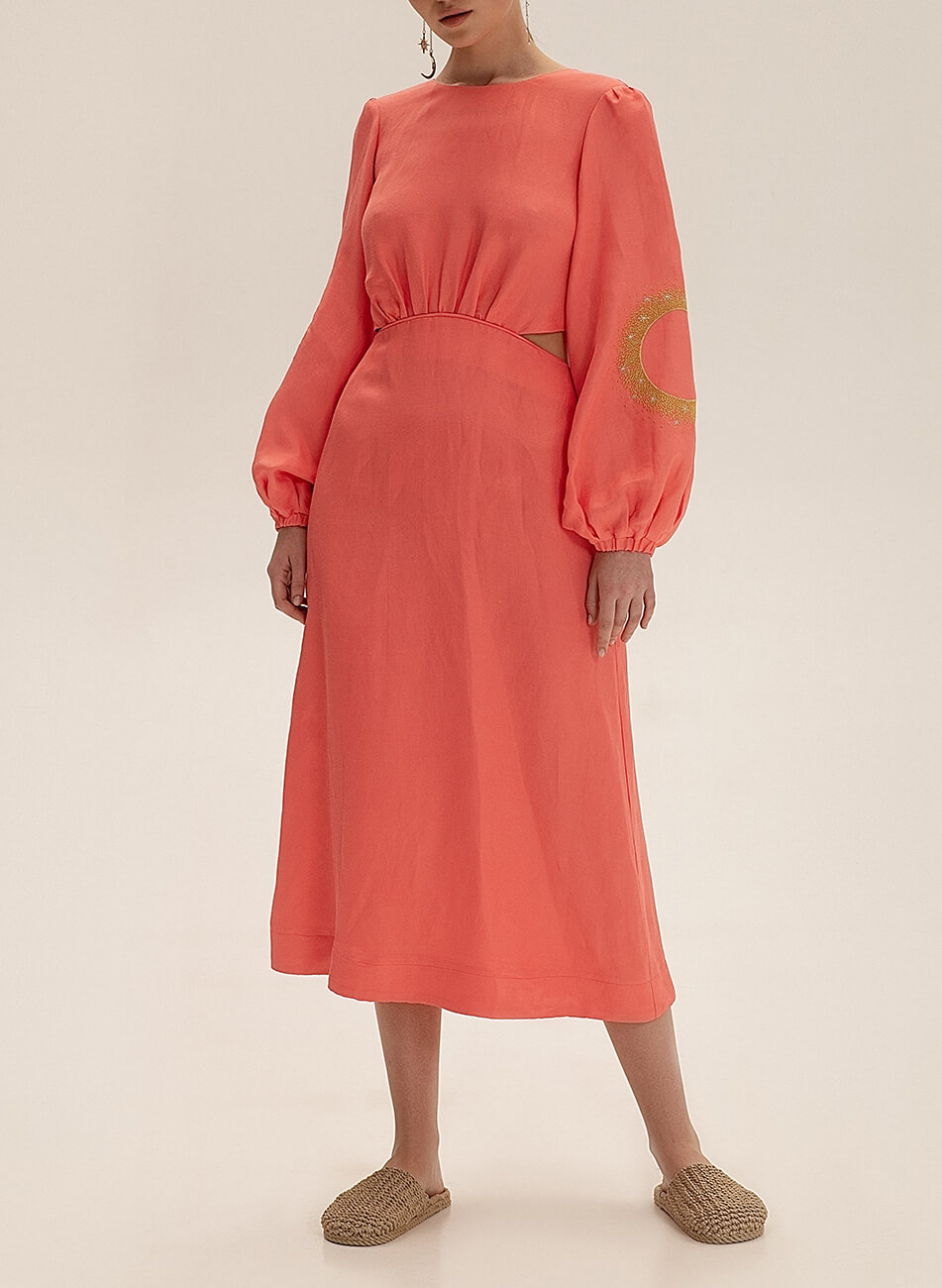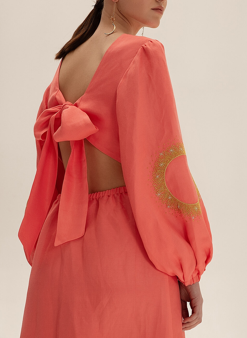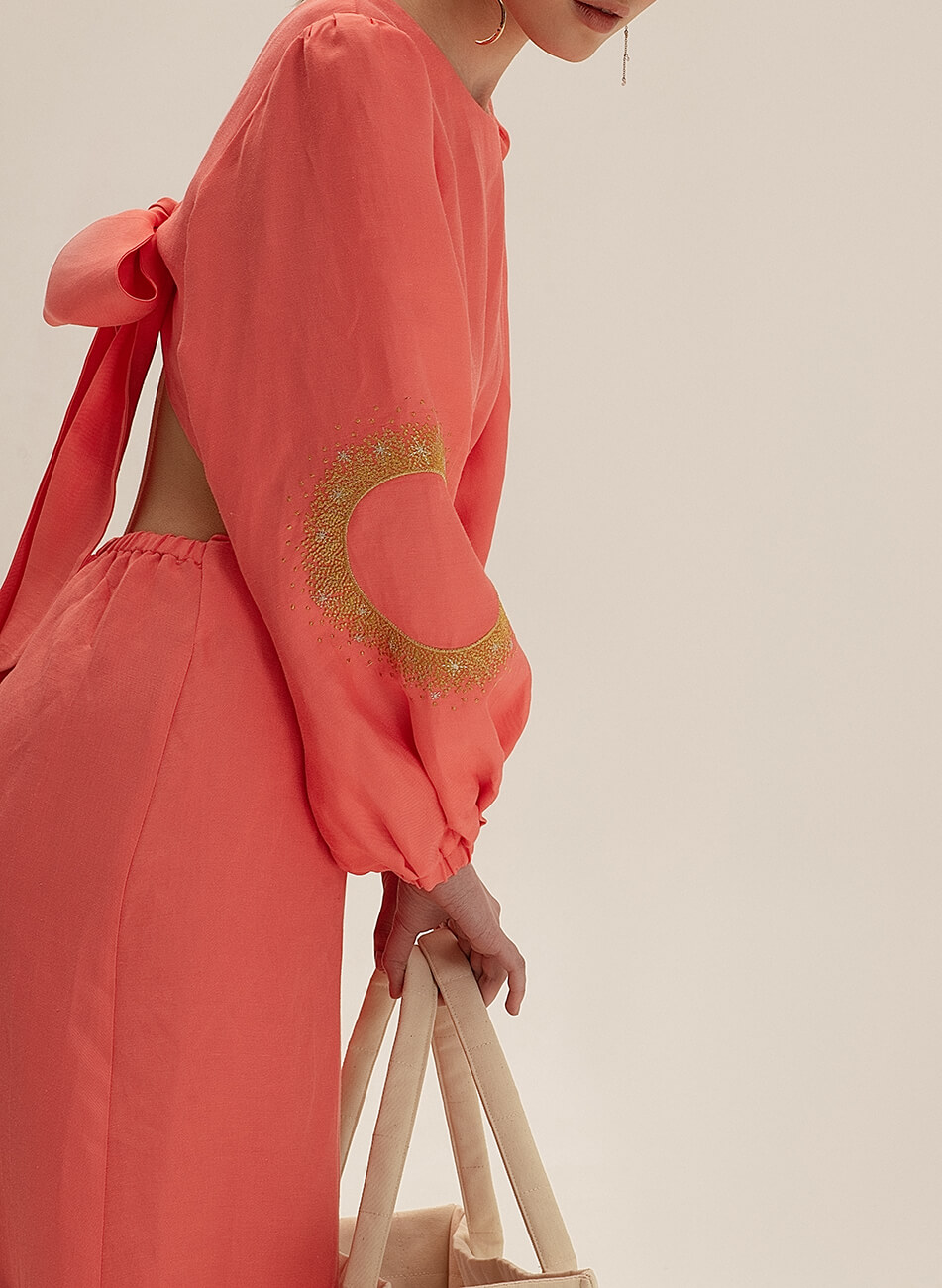 Лляна сукня міді з вирізами. Рукава сукні розшиті орнаментом “Затемнення”. На спині декоративний бант.