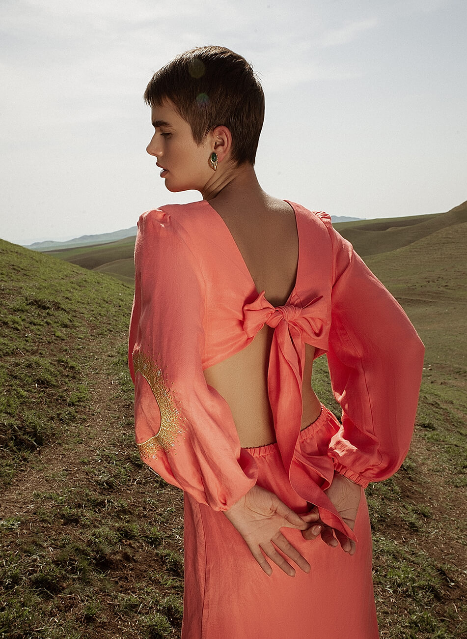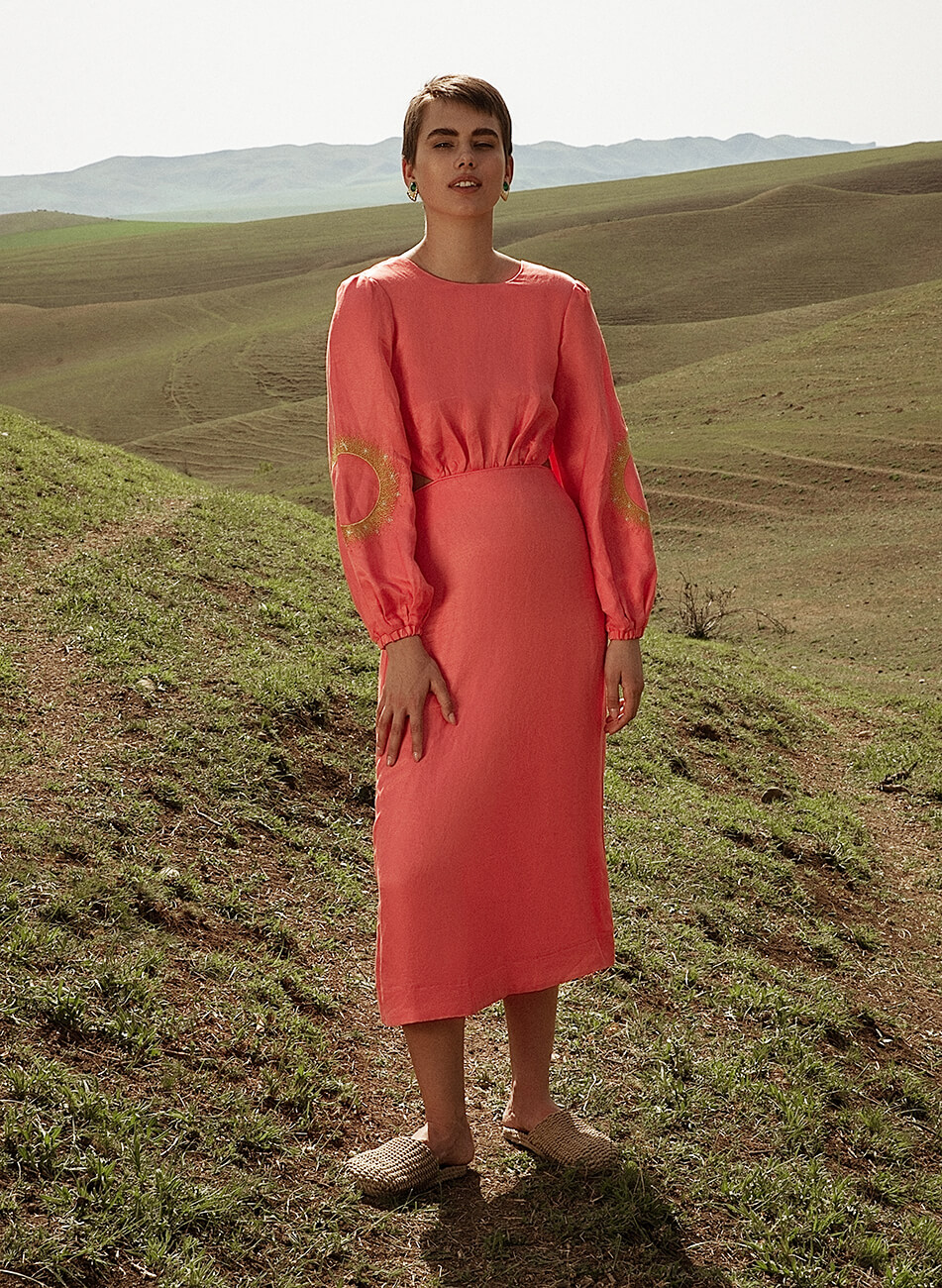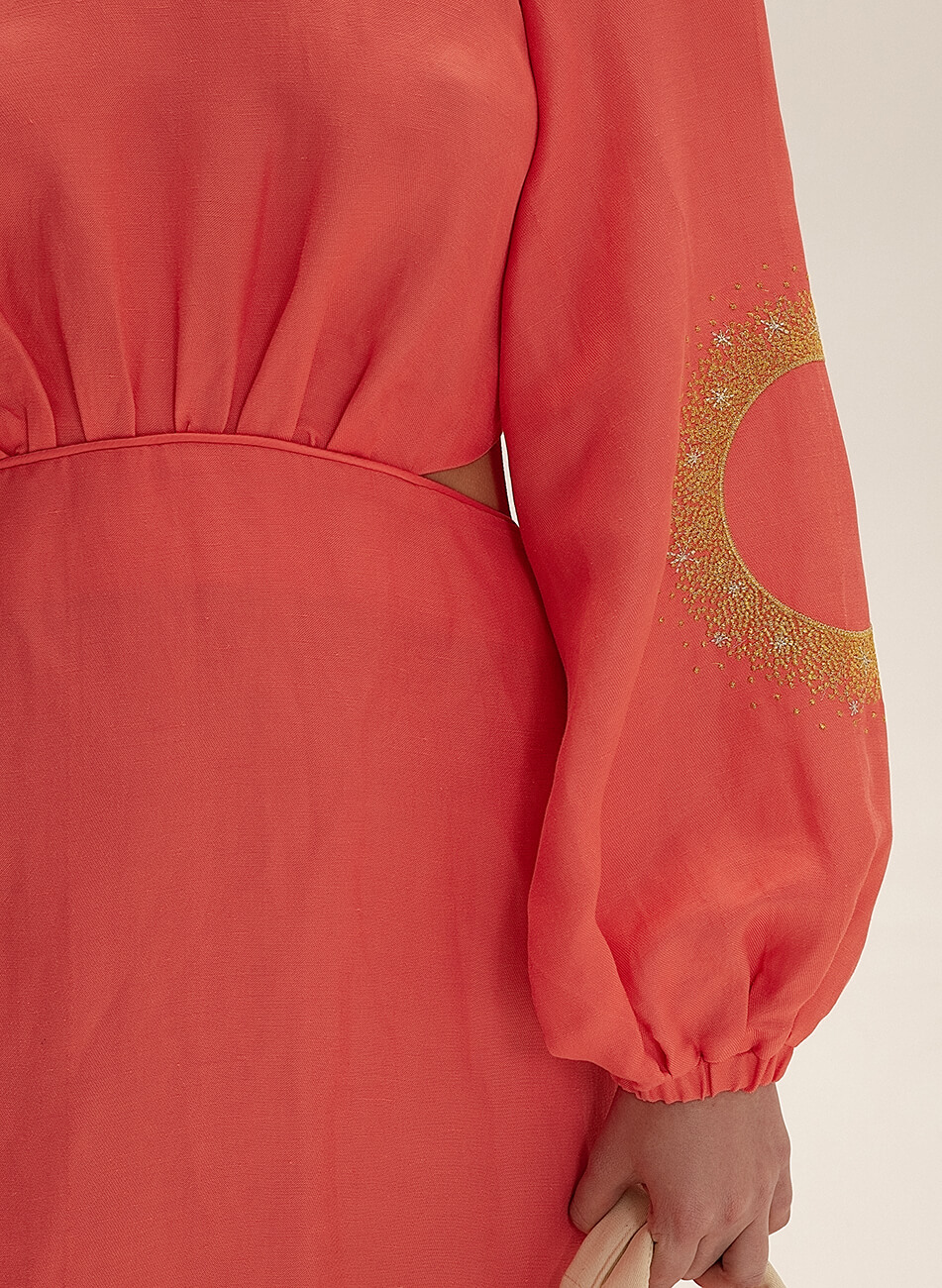 Лляна сукня міді з вирізами. Рукава сукні розшиті орнаментом “Затемнення”. На спині декоративний бант.
