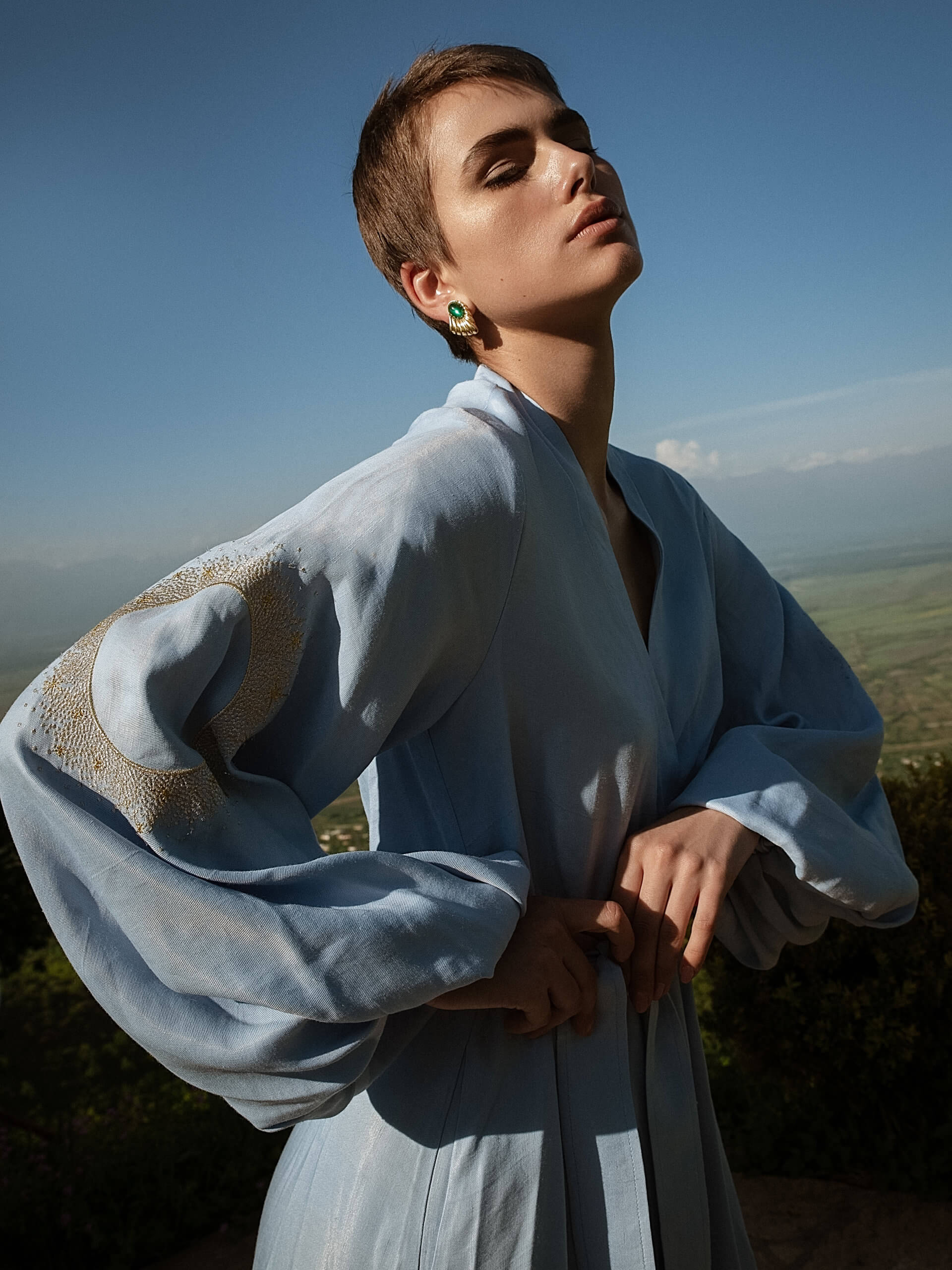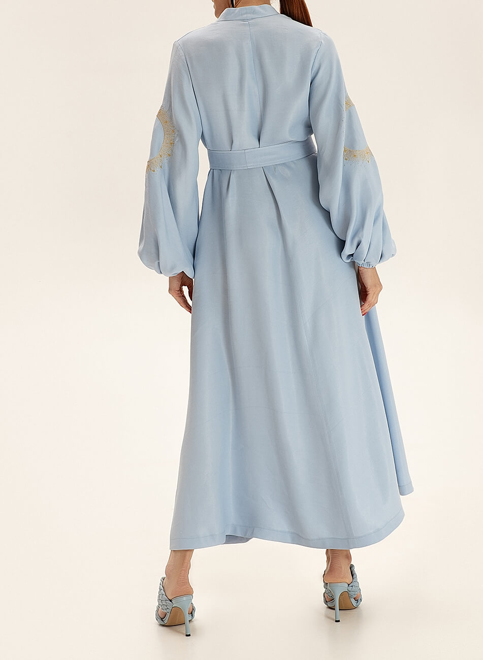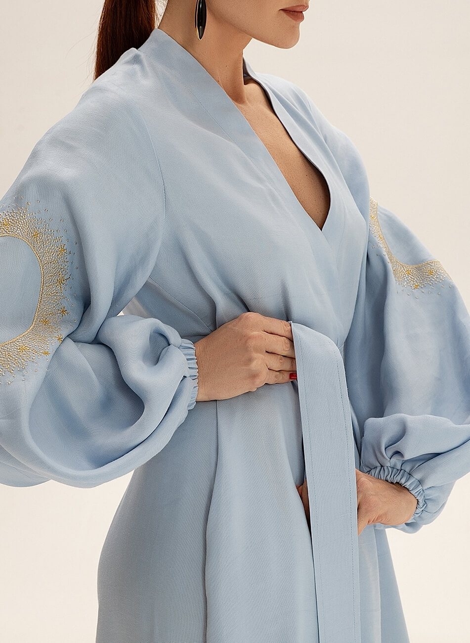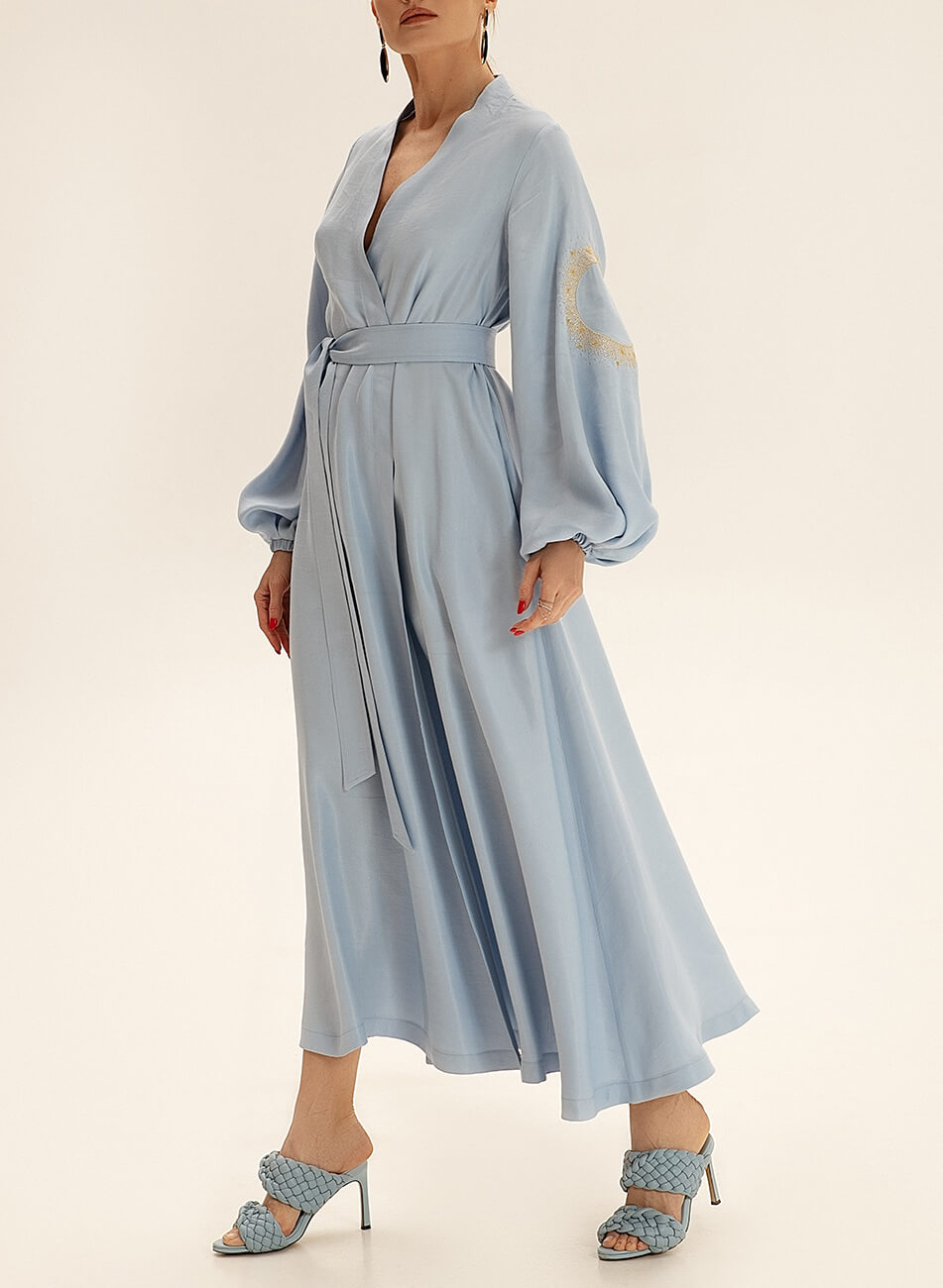 Довга сукня на запах з кишенями в бічних швах. Рукава сукні розшиті орнаментом “Затемнення”. У комплекті пояс.