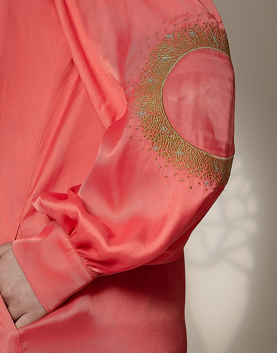 Легка сукня-сорочка. Рукава сукні розшиті орнаментом “Затемнення”. У бічних швах – кишені.