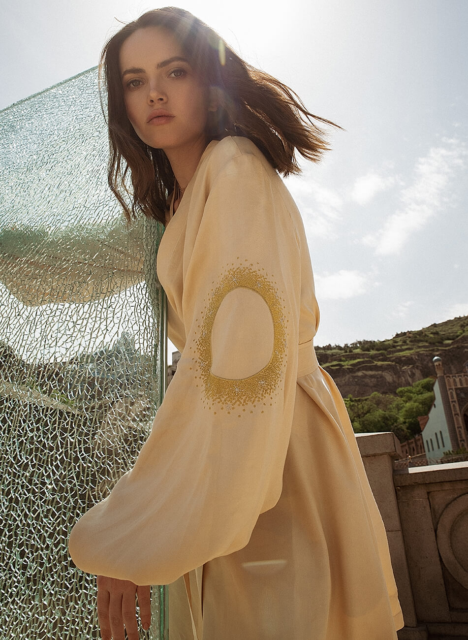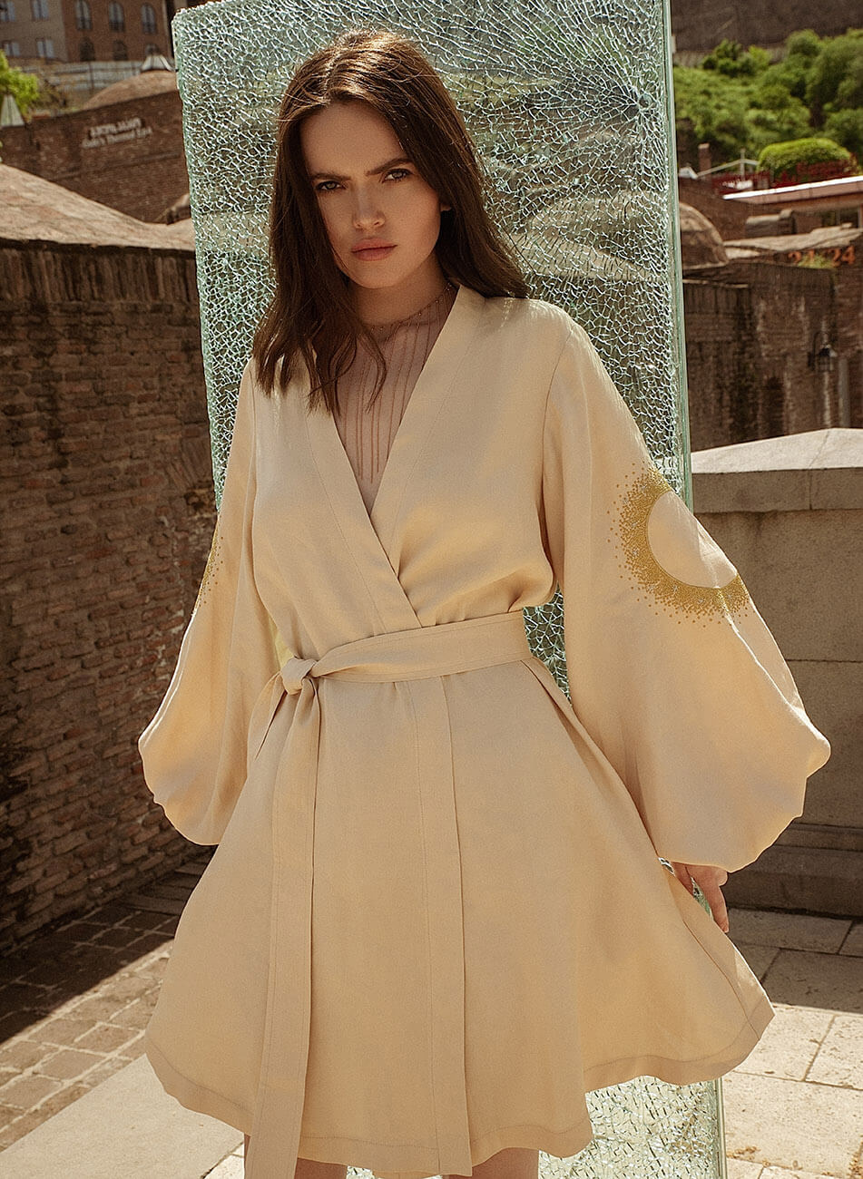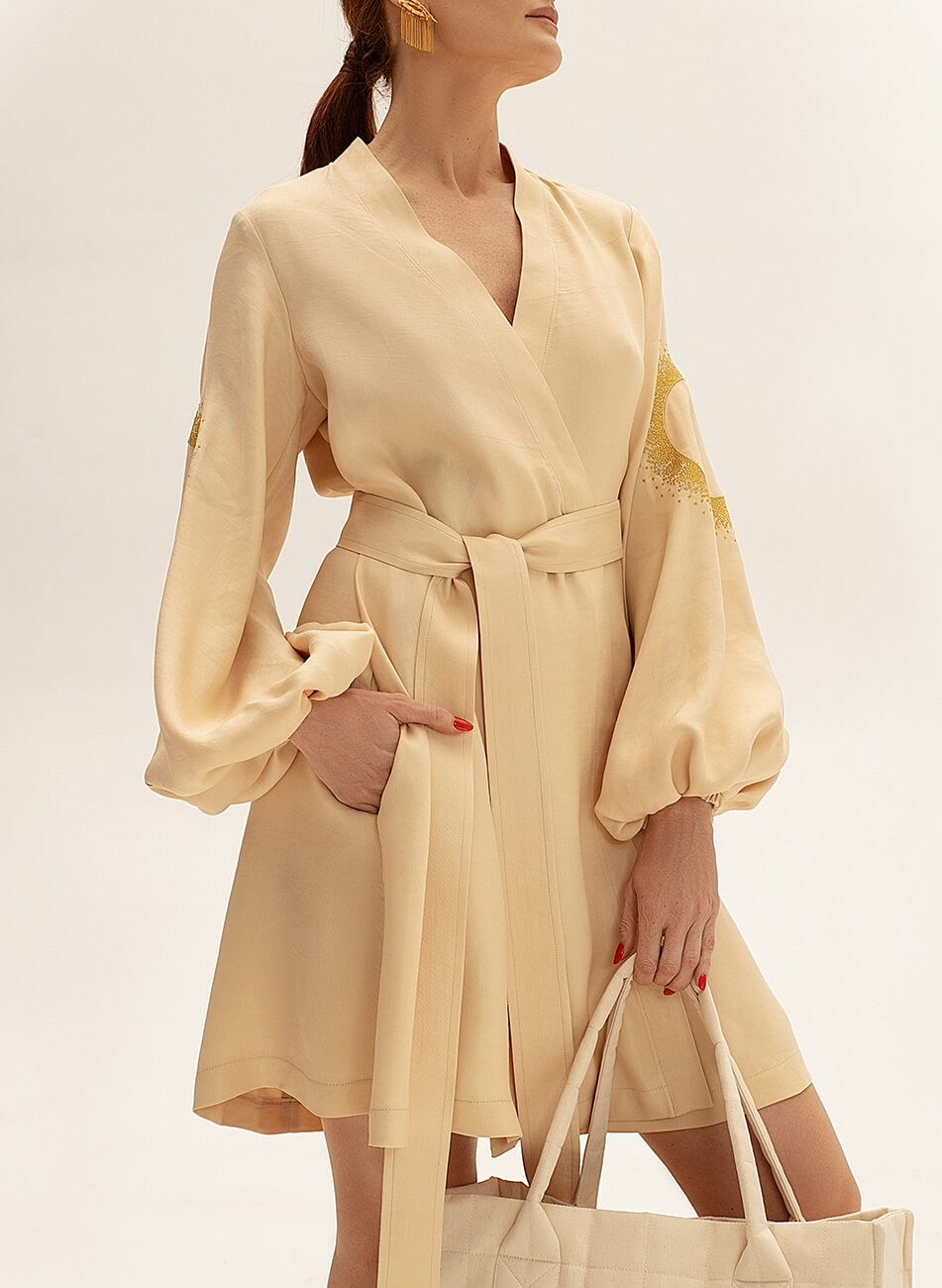 Коротка сукня на запах із кишенями в бічних швах. Рукава сукні розшиті орнаментом “Затемнення”. У комплекті пояс.