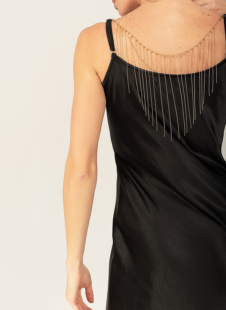 Струмлива сатинова sleep dress на тонких бретелях. Структура і щільність матеріалу допомагає підкреслювати і коригувати фігуру. Додатково в комплекті знімний декор “дощ”. Sleep dress можливо використовувати, як в образах у стилі casual, а так і у вечірніх завдяки знімному декору.