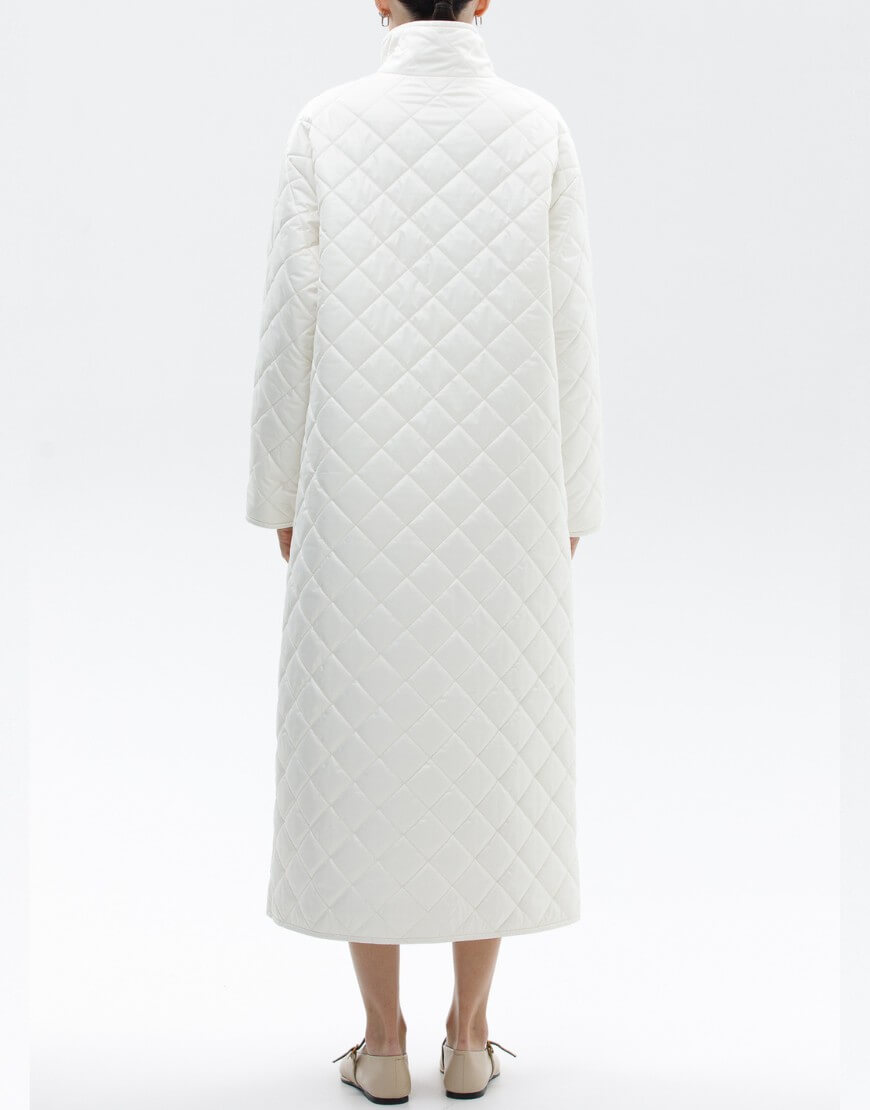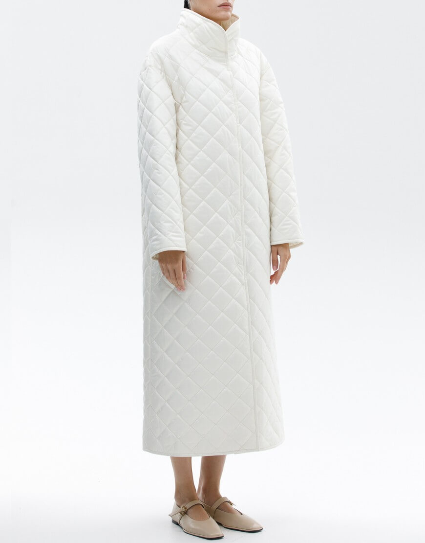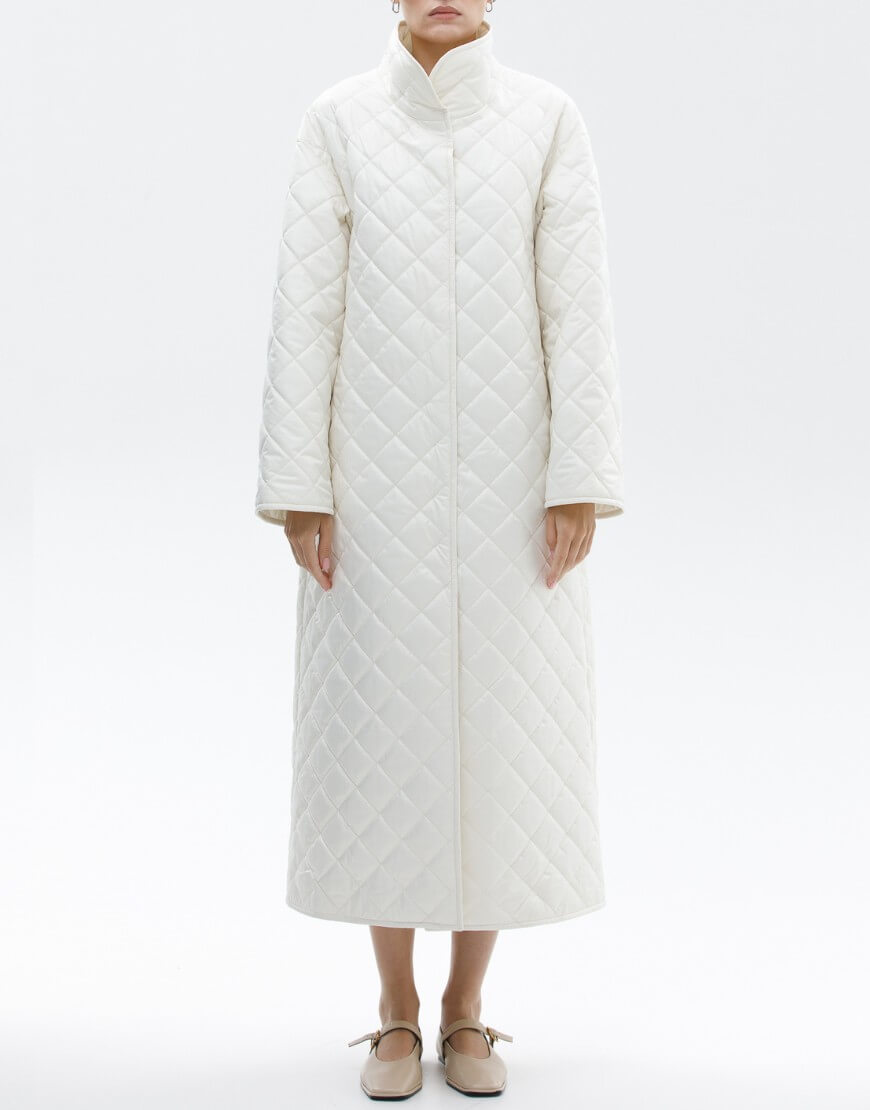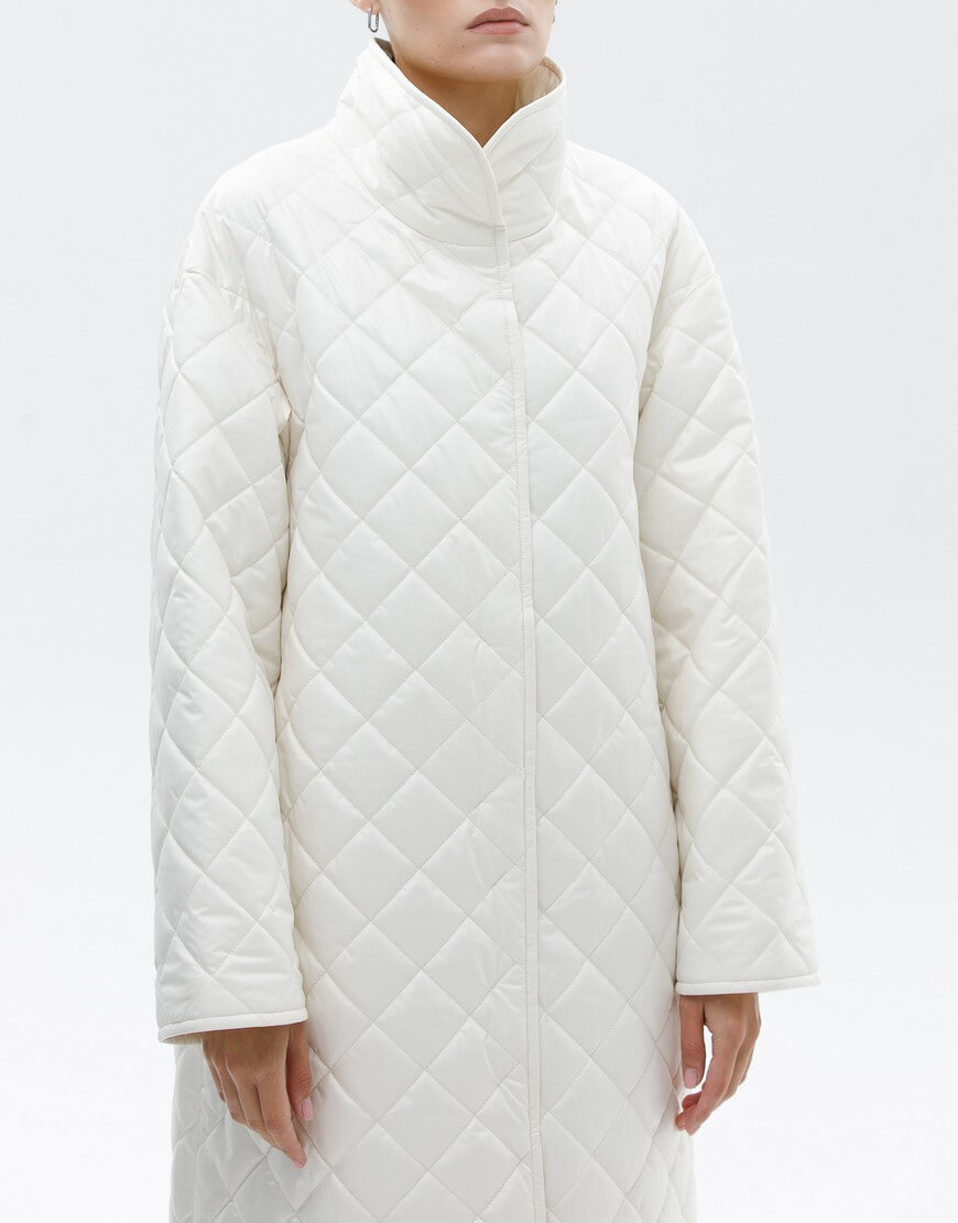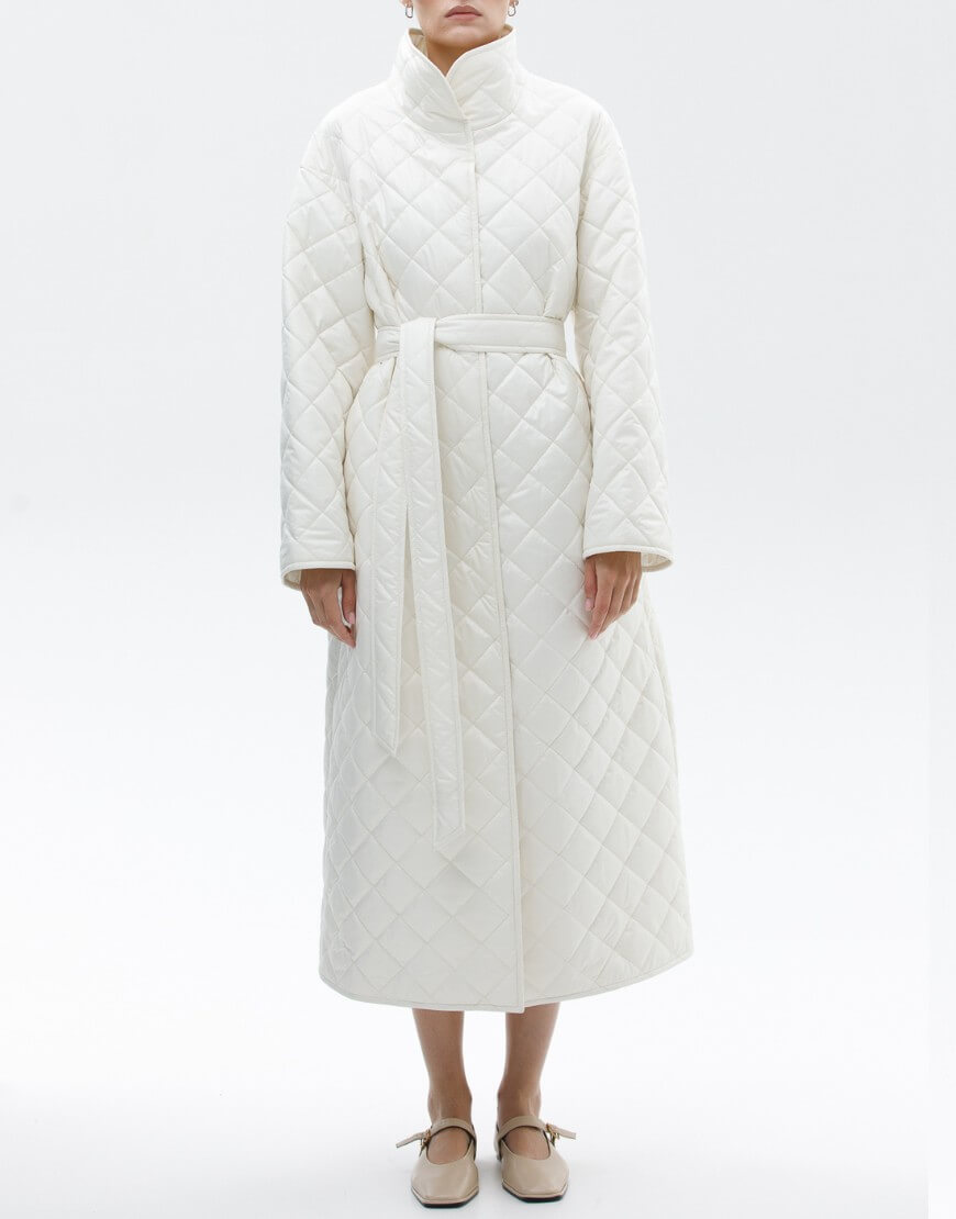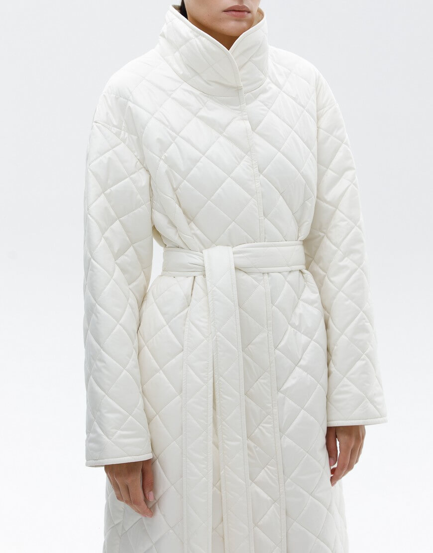 Пряме стьобане пальто з плащової тканини з коміром-стійкою. Фіксація пальто: потаємні кнопки. У комплекті пояс.