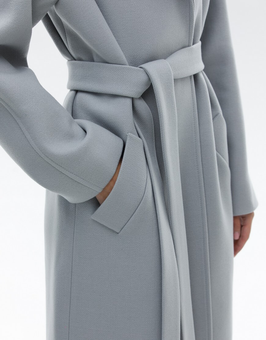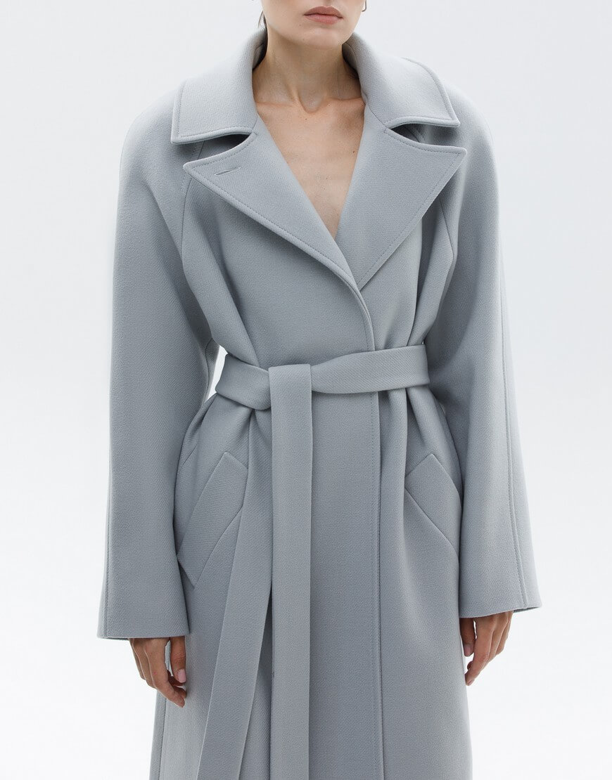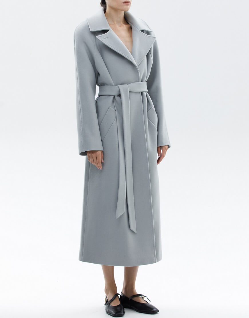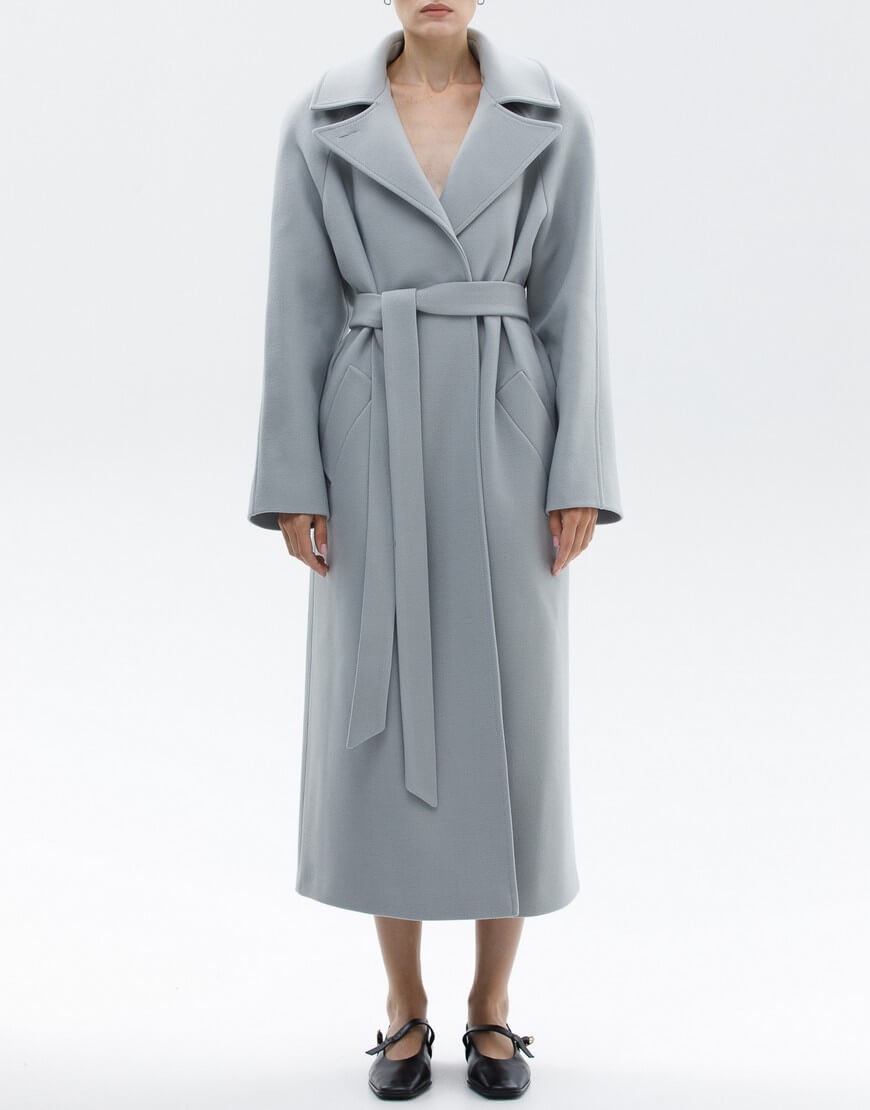 Пальто на запах з італійської вовни преміум якості. Особливість моделі: комір-трансформер. Пальто може бути, як з широким лацканом, так і з застебнутим. В застебнутому вигляді пальто має стриманий, мінімалістичний силует без зайвих деталей. У комплекті пояс.