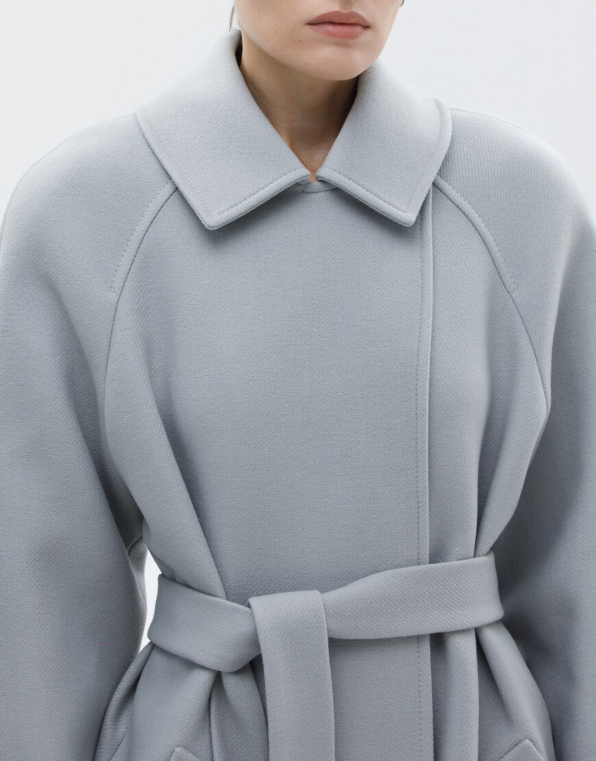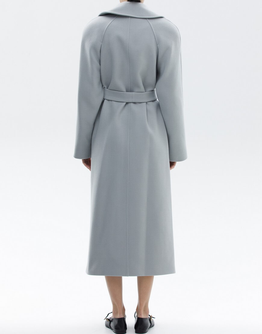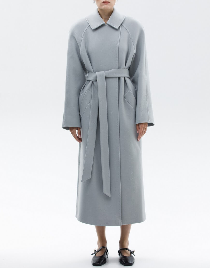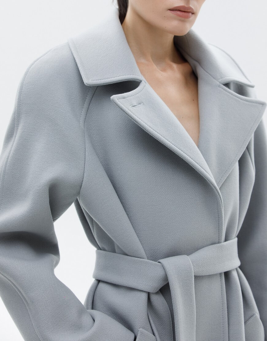 Пальто на запах з італійської вовни преміум якості. Особливість моделі: комір-трансформер. Пальто може бути, як з широким лацканом, так і з застебнутим. В застебнутому вигляді пальто має стриманий, мінімалістичний силует без зайвих деталей. У комплекті пояс.