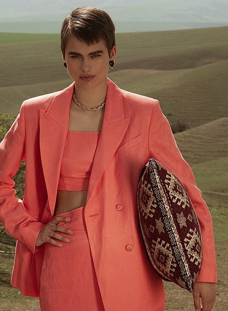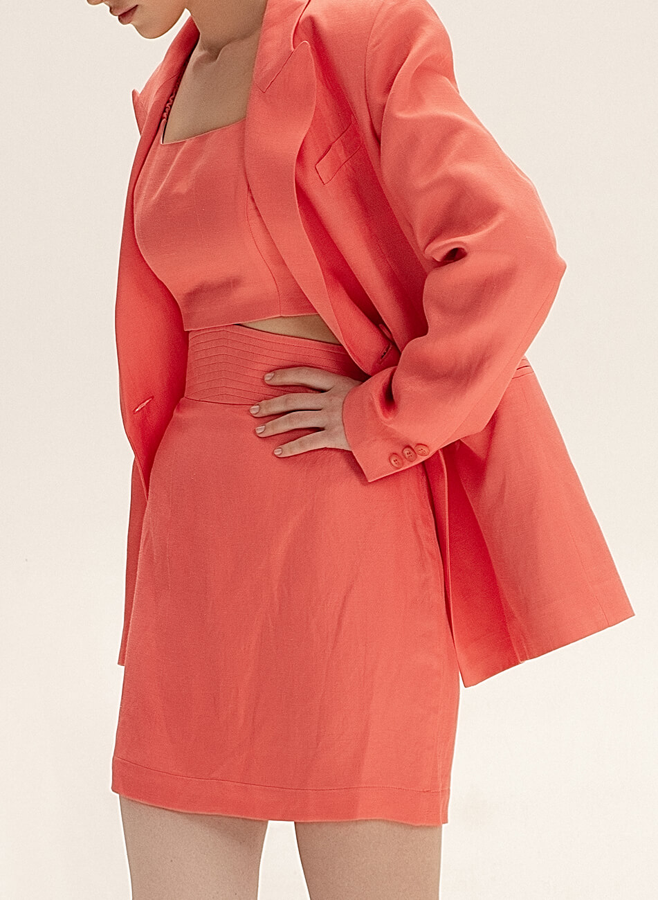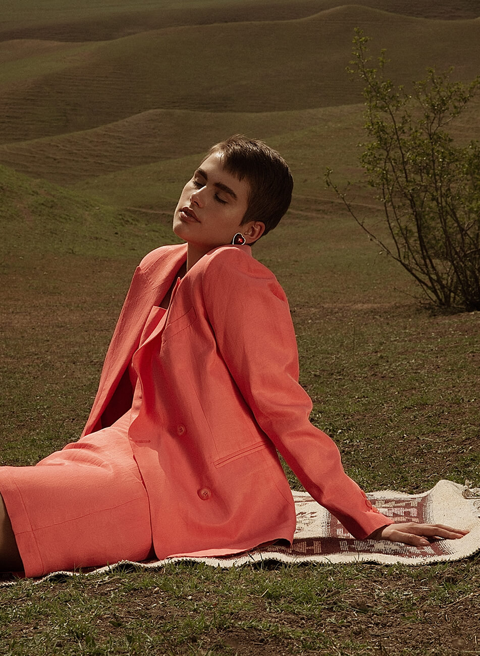 Базовий лляний піджак чоловічого крою. Модель із підкладкою. Фурнітура (ґудзики) пофарбована в тон основної тканини. Модель комплектується штанами, топами і спідницею з колекції SS21.