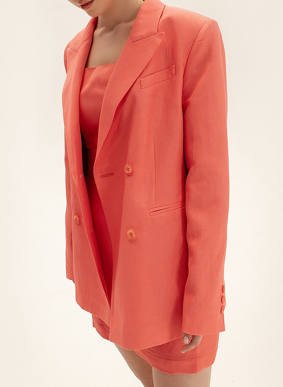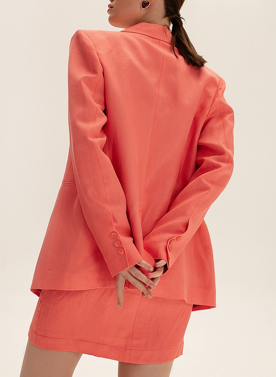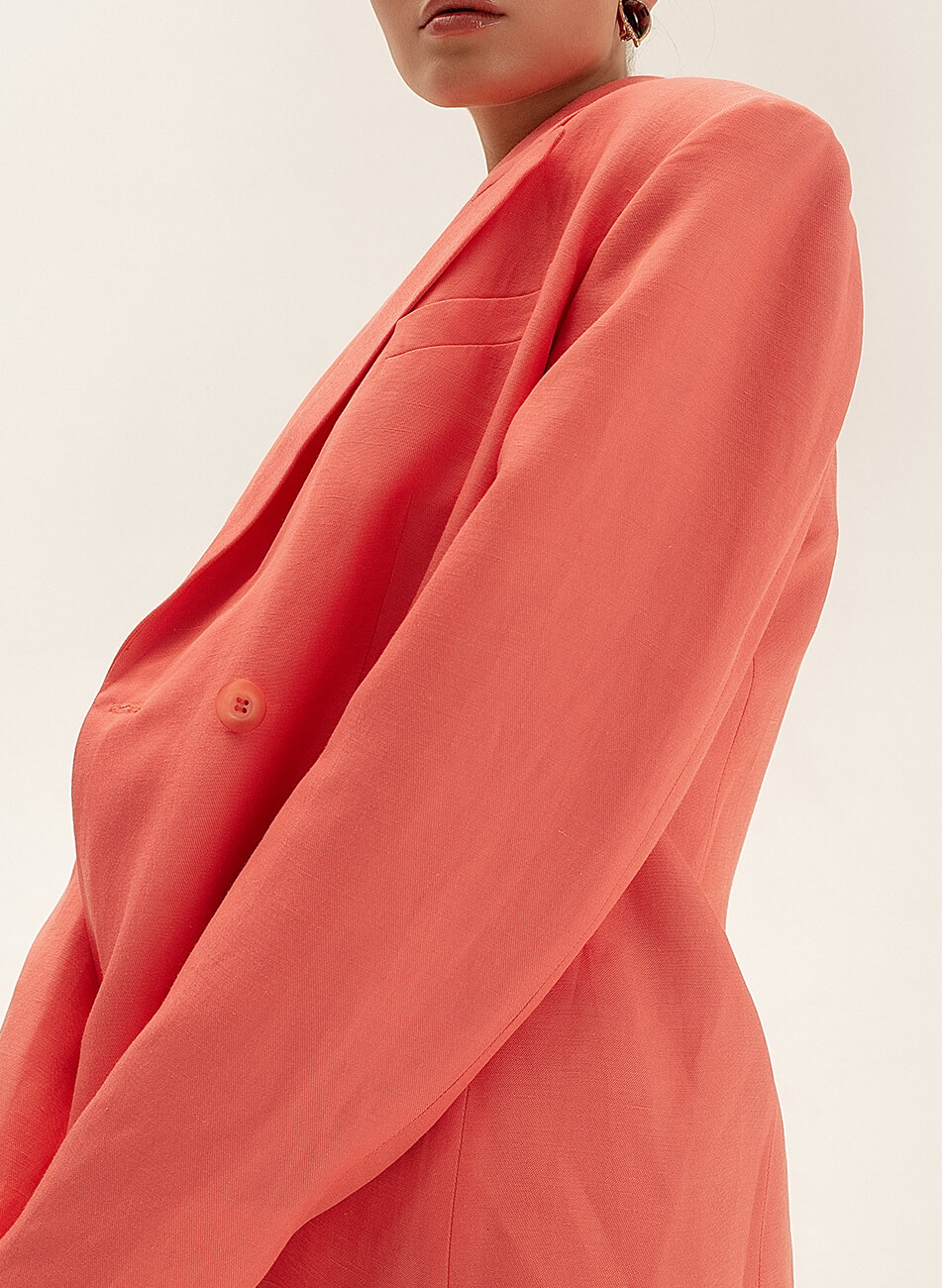 Базовий лляний піджак чоловічого крою. Модель із підкладкою. Фурнітура (ґудзики) пофарбована в тон основної тканини. Модель комплектується штанами, топами і спідницею з колекції SS21.