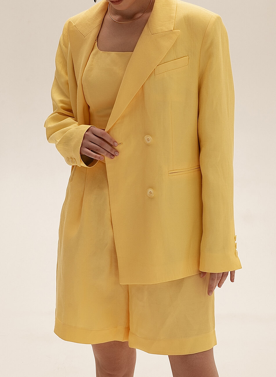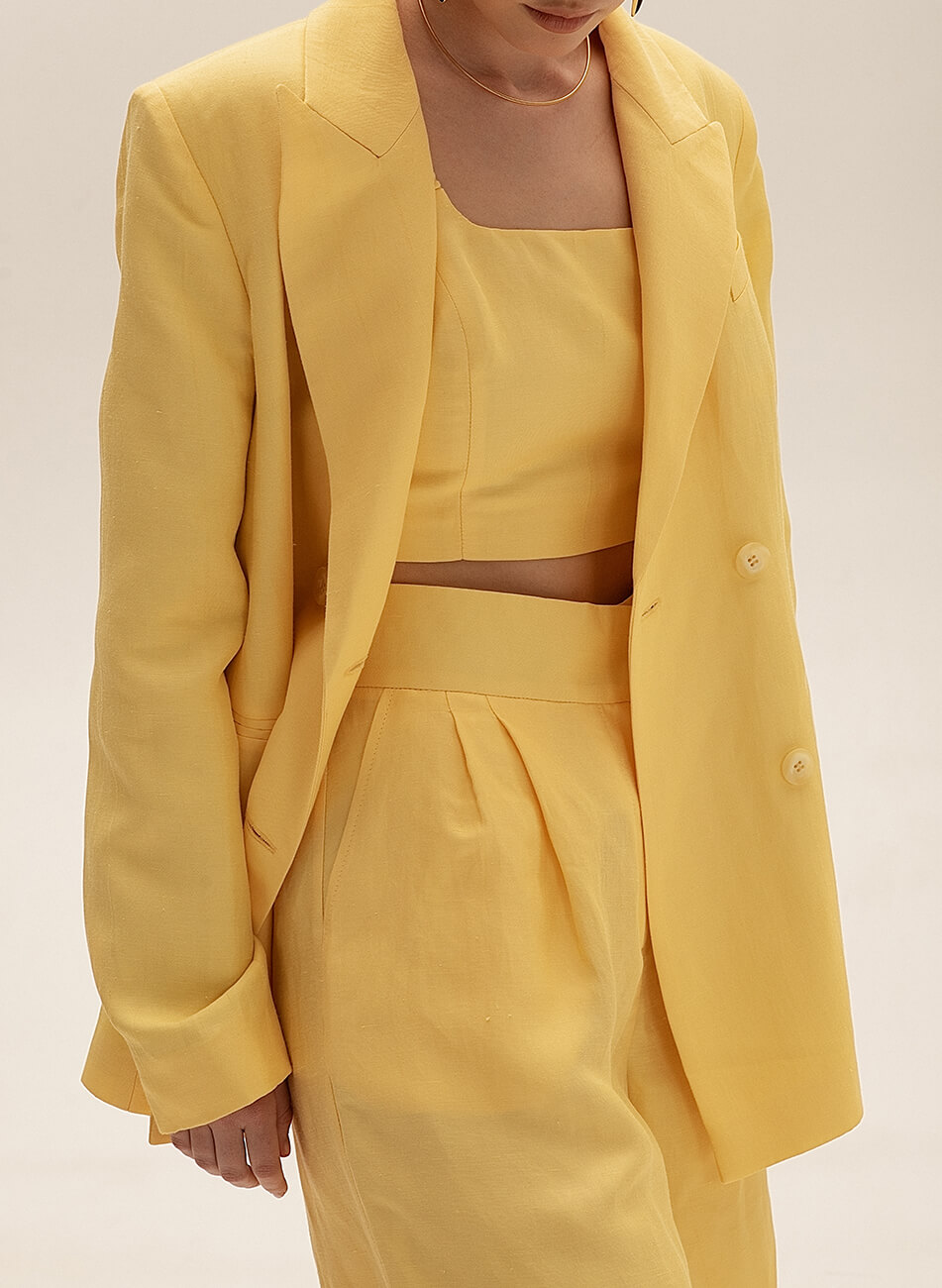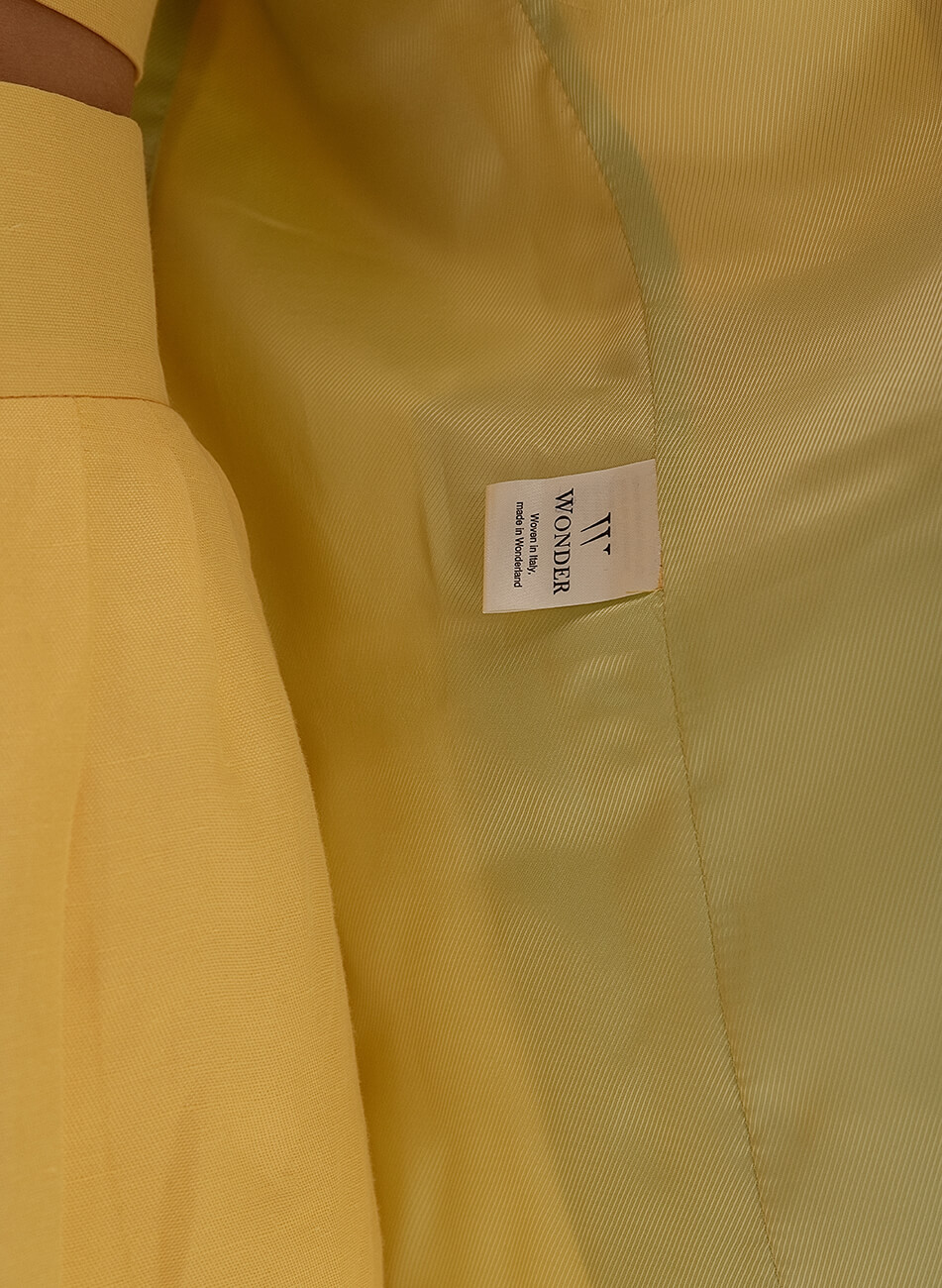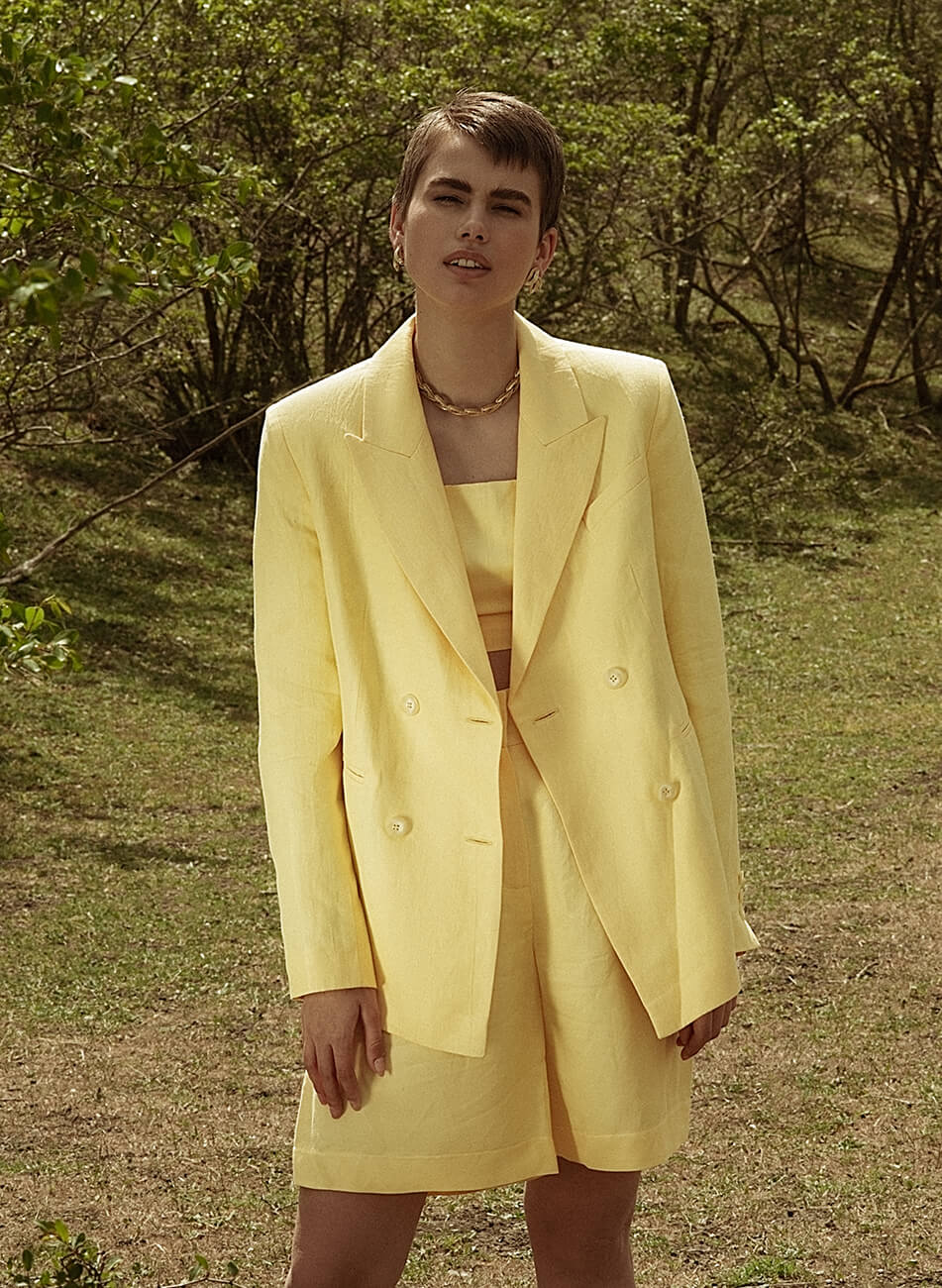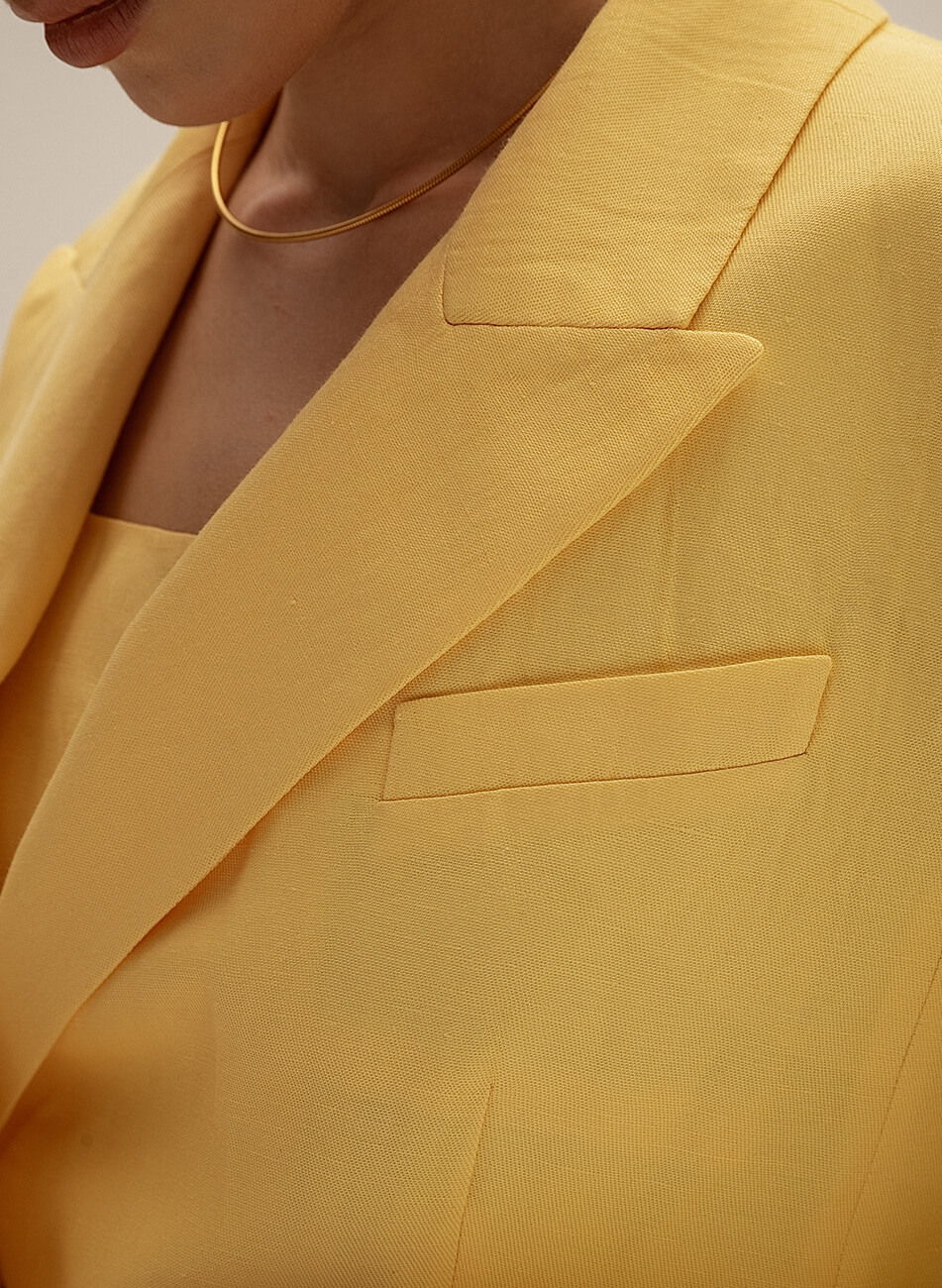 Базовий лляний піджак чоловічого крою. Модель із підкладкою. Фурнітура (ґудзики) пофарбована в тон основної тканини. Модель комплектується штанами, топами і спідницею з колекції SS21.