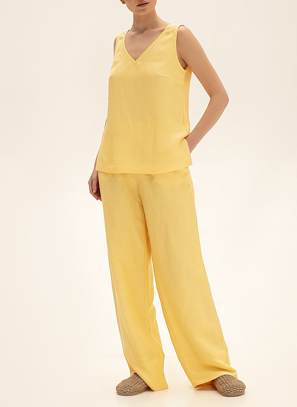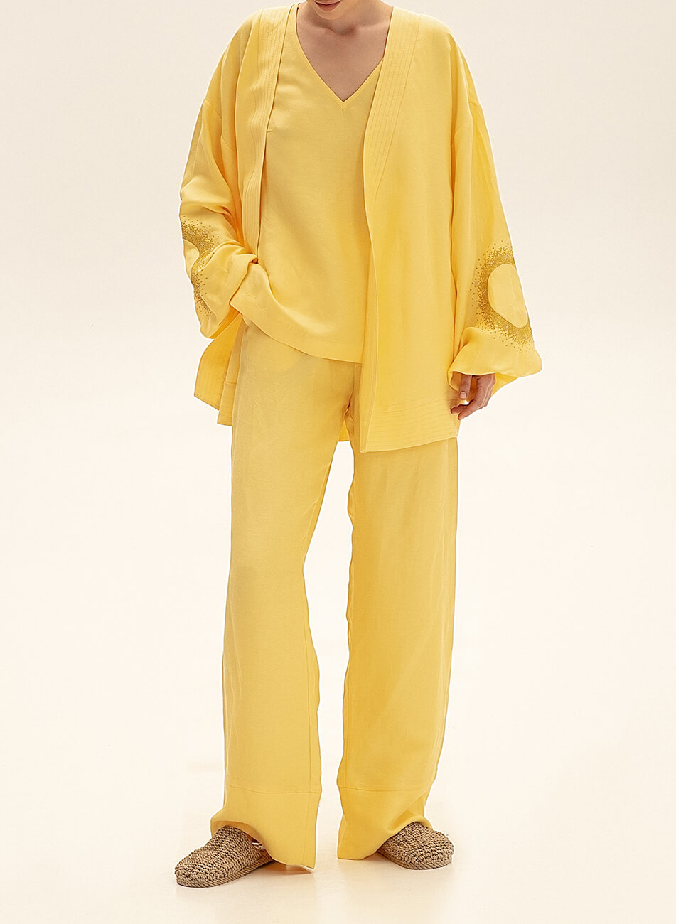 Лляні штани вільного крою. Пояс штанів – гумка. Модель з кишенями і широкими манжетами. Модель комплектується топами, піджаком, а також кімоно з колекції SS21.