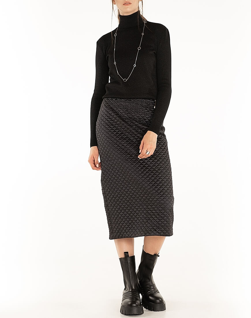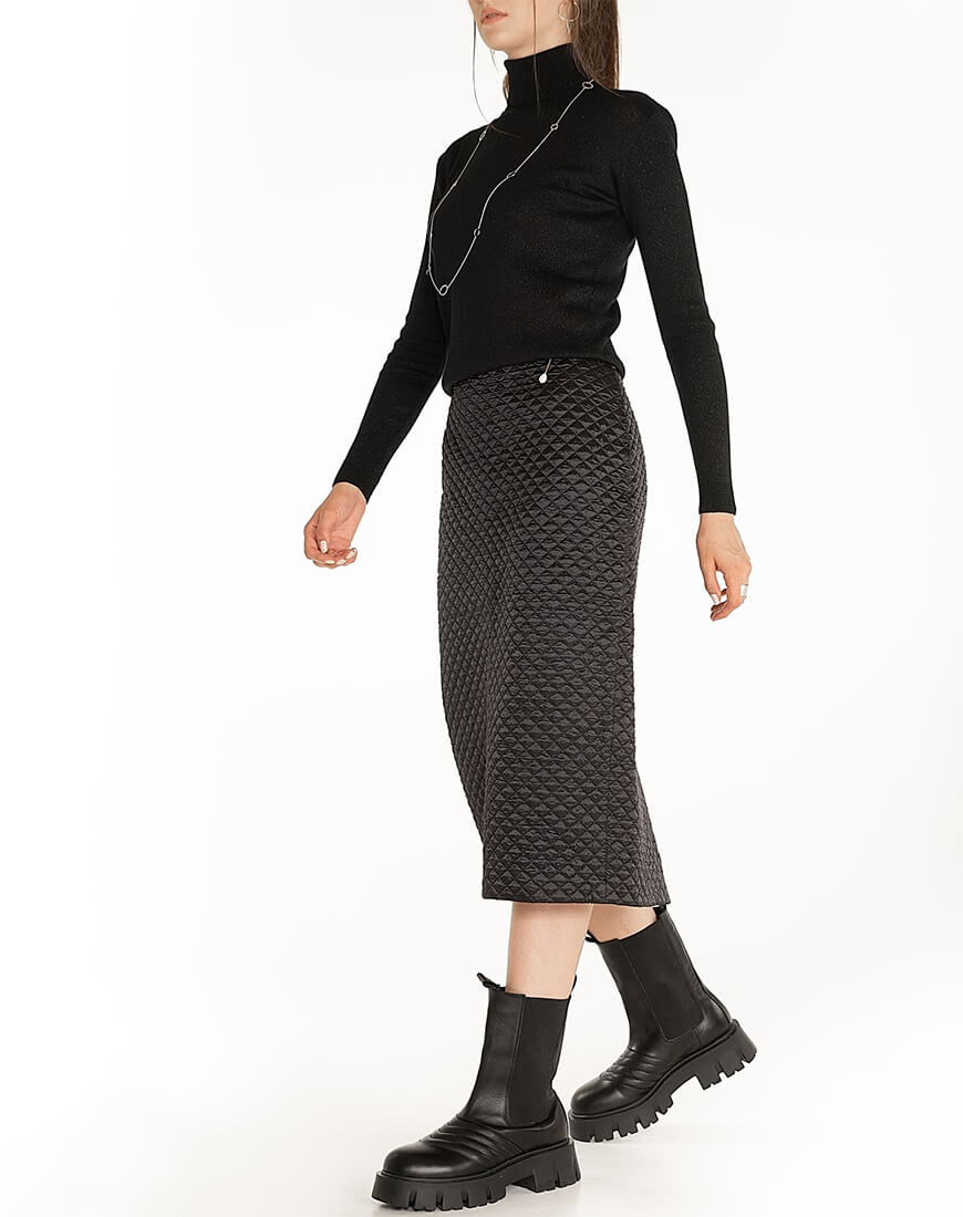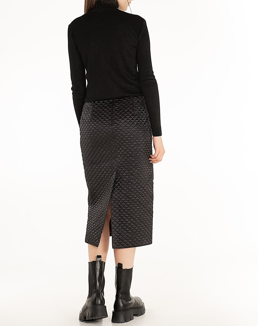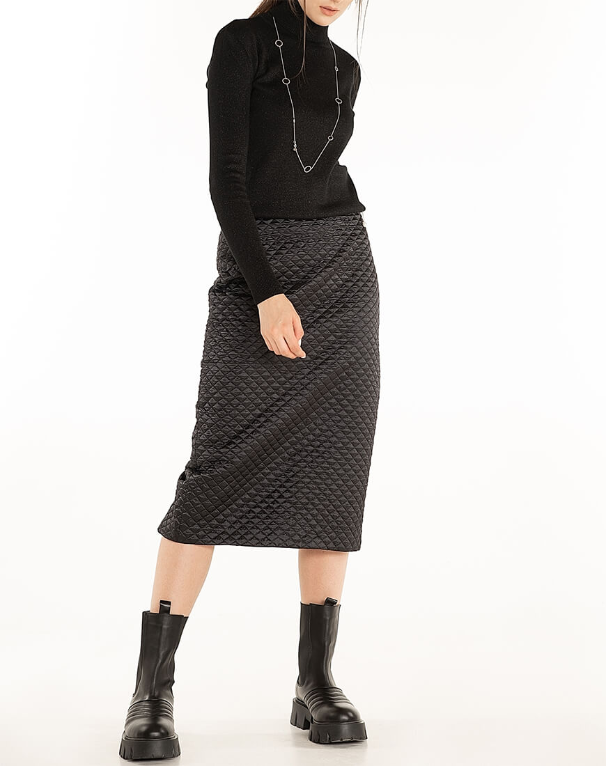 Стьобана спідниця прямого крою з кишенями. Знімний декор із натуральних перлів не входить до комплекту.