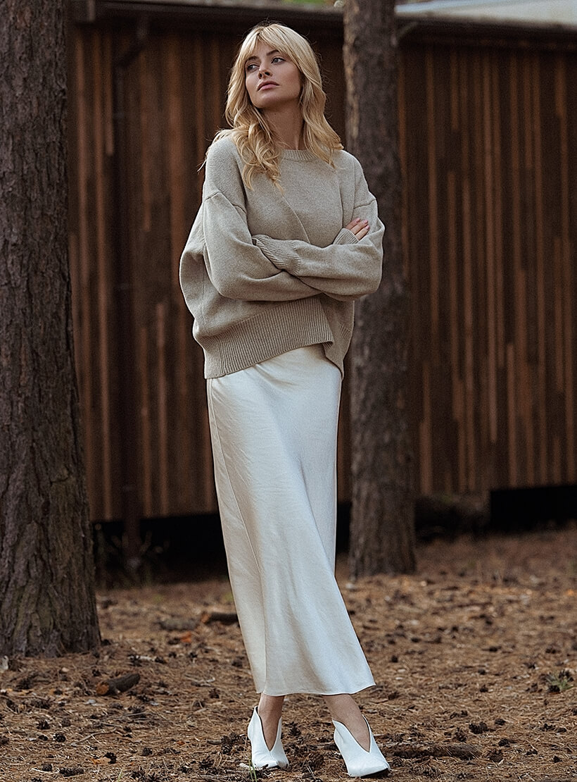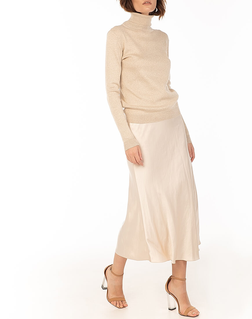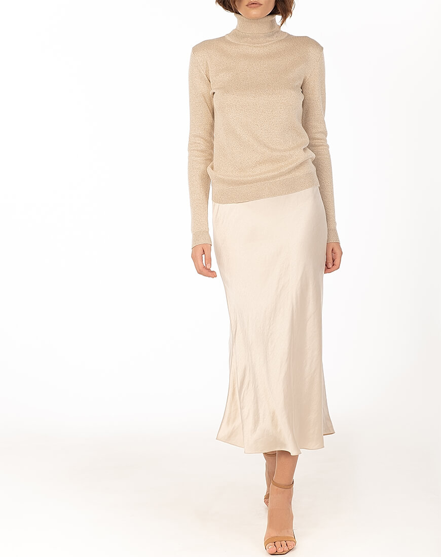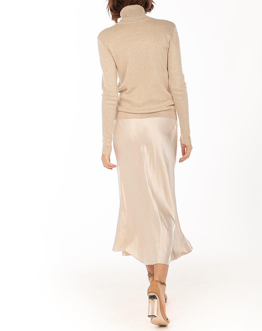 Струмлива сатинова спідниця. Структура і щільність матеріалу допомагає підкреслювати і коригувати фігуру. Пояс спідниці – гумка.