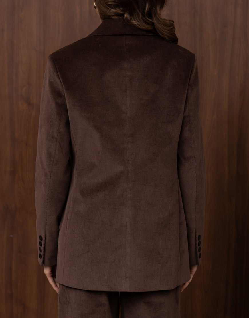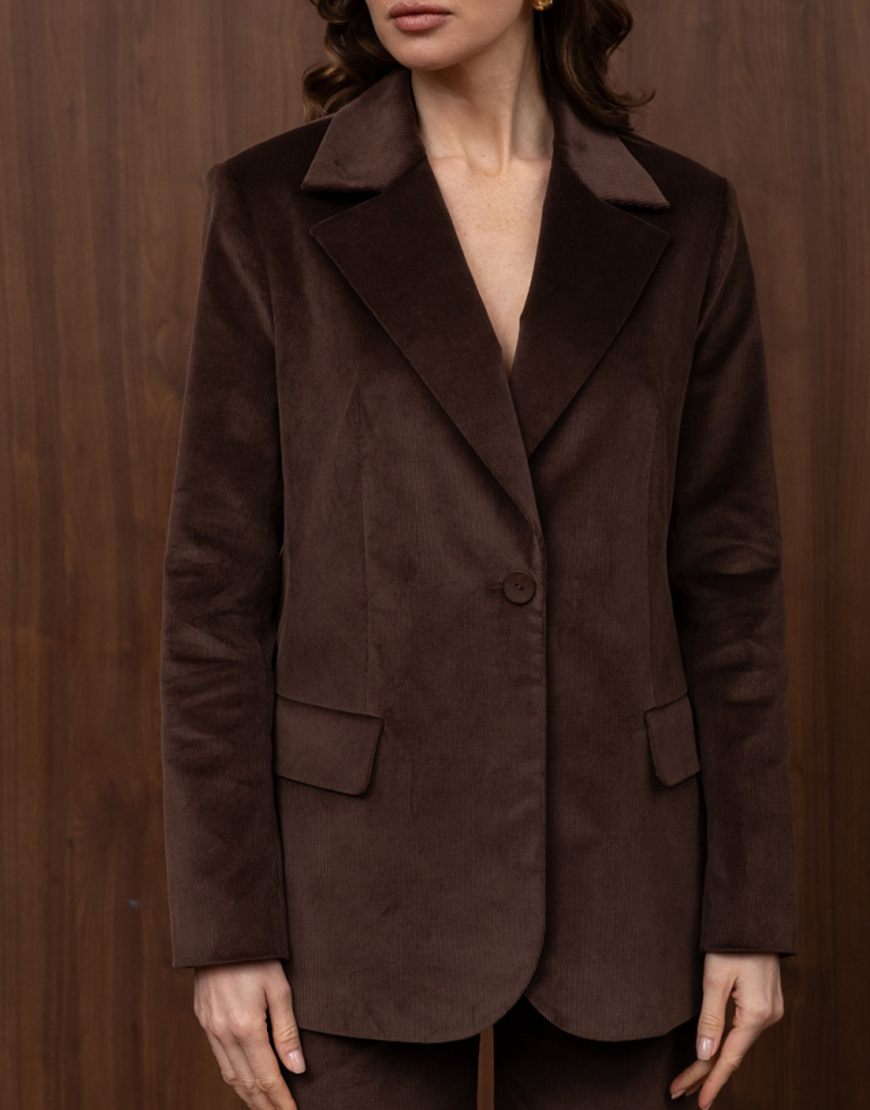 Однобортний жакет з вельвету з класичним коміром та кишенями. Ґудзики пофарбовані в тон основної тканини.