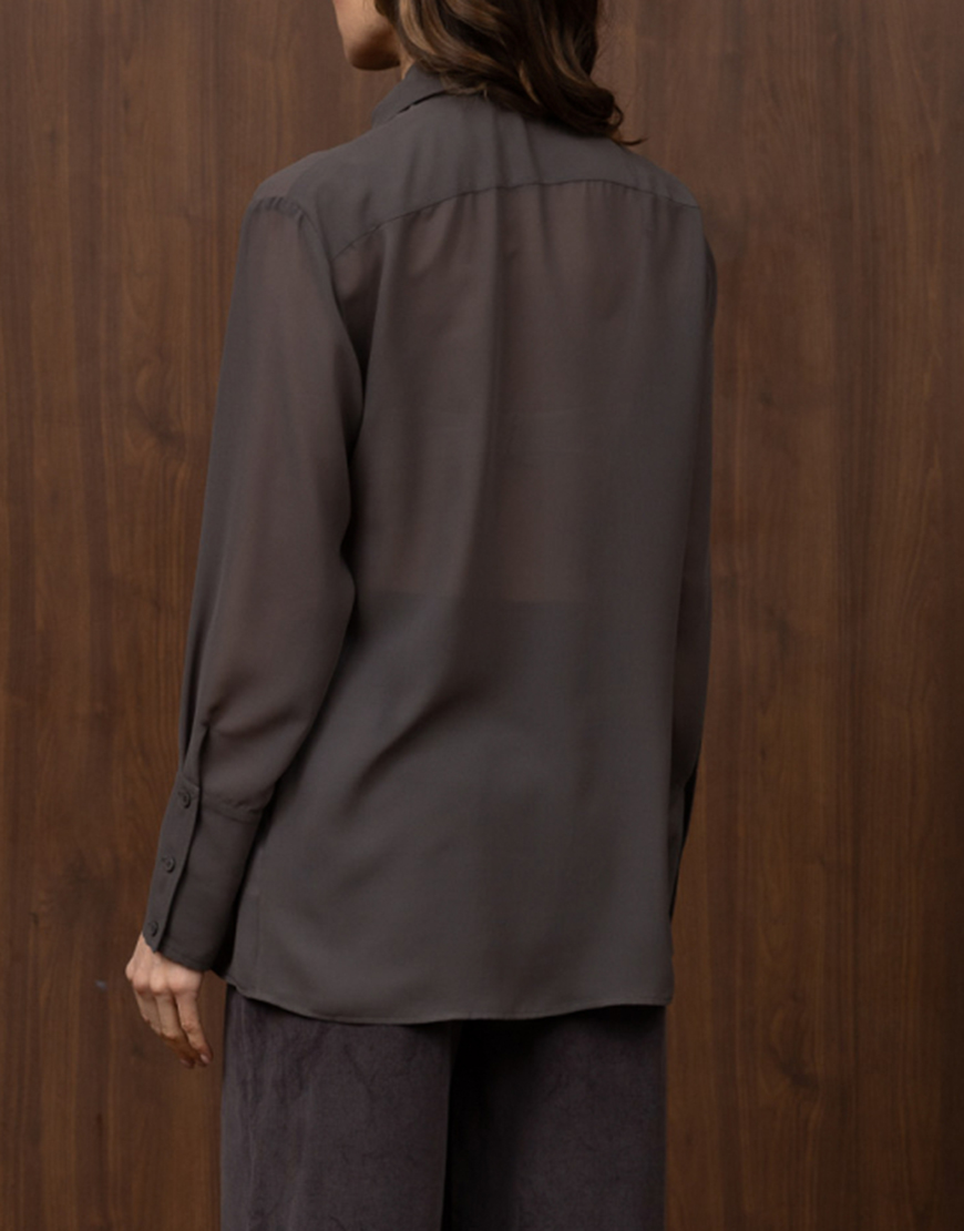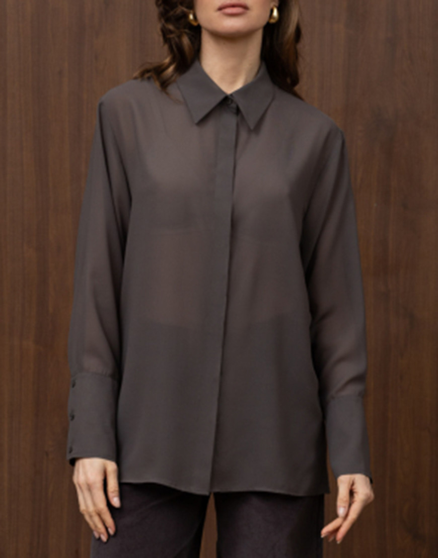 Сорочка з легкого шифону з шаликом та широкими манжетами. Шалик є окремим аксесуаром блузи та фіксується за петельку під коміром. За бажанням шалик може бути стилізований у якості банта, стрічки, що йде до низу, або навіть у вигляді паска.