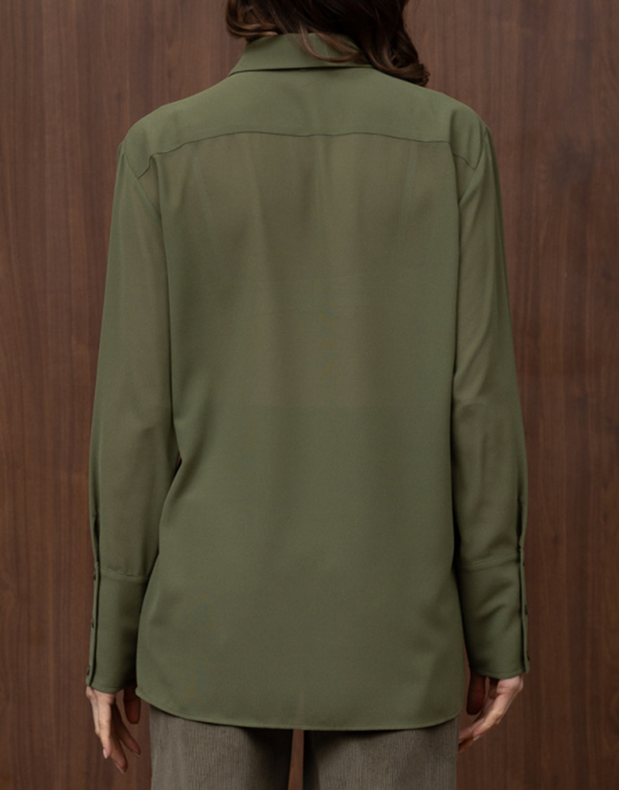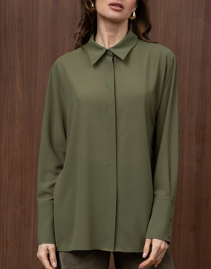 Сорочка з легкого шифону з шаликом та широкими манжетами. Шалик є окремим аксесуаром блузи та фіксується за петельку під коміром. За бажанням шалик може бути стилізований у якості банта, стрічки, що йде до низу, або навіть у вигляді паска.