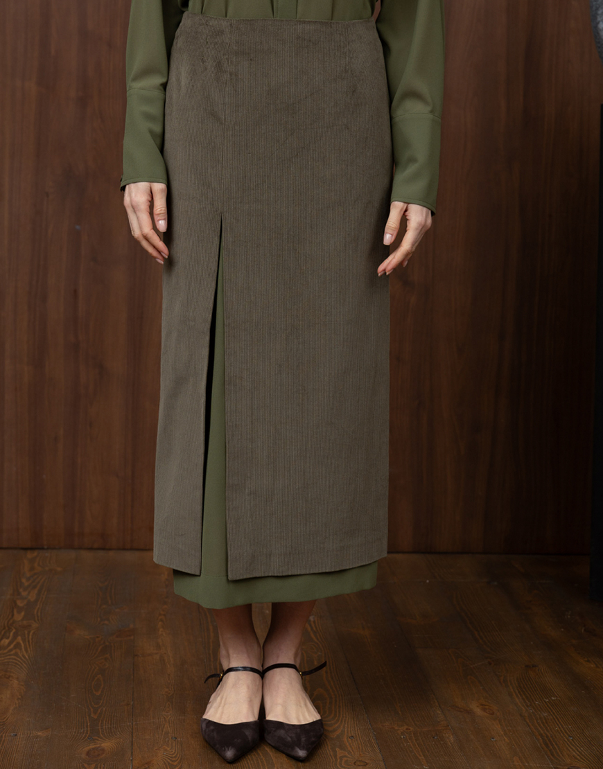 Довга спідниця з вельвету має попереду боковий розріз та шифонову нижню частину, яка її ошатно обрамляє.