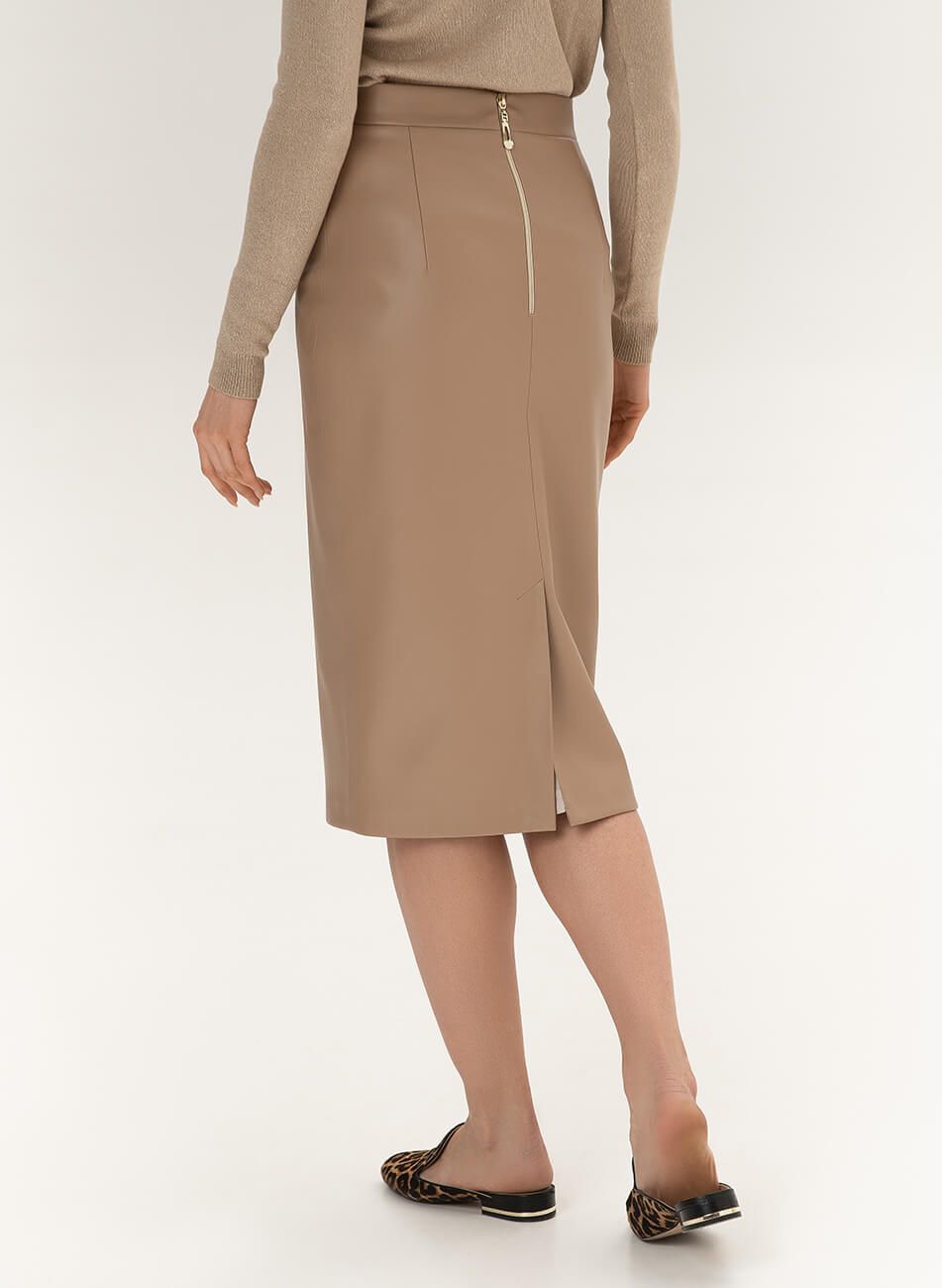 Класична спідниця з еко-шкіри. Декор із перлів не входить до комплекту. Еко-шкіра для виробництва спідниці була протестована і показала високі показники зносостійкості та стійкості до впливу зовнішнього середовища. Гарантія на матеріал: до 5 років.