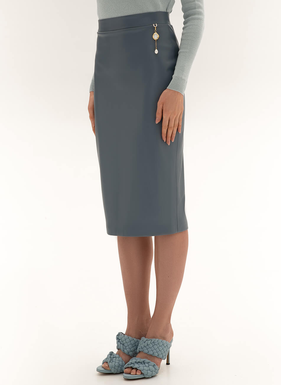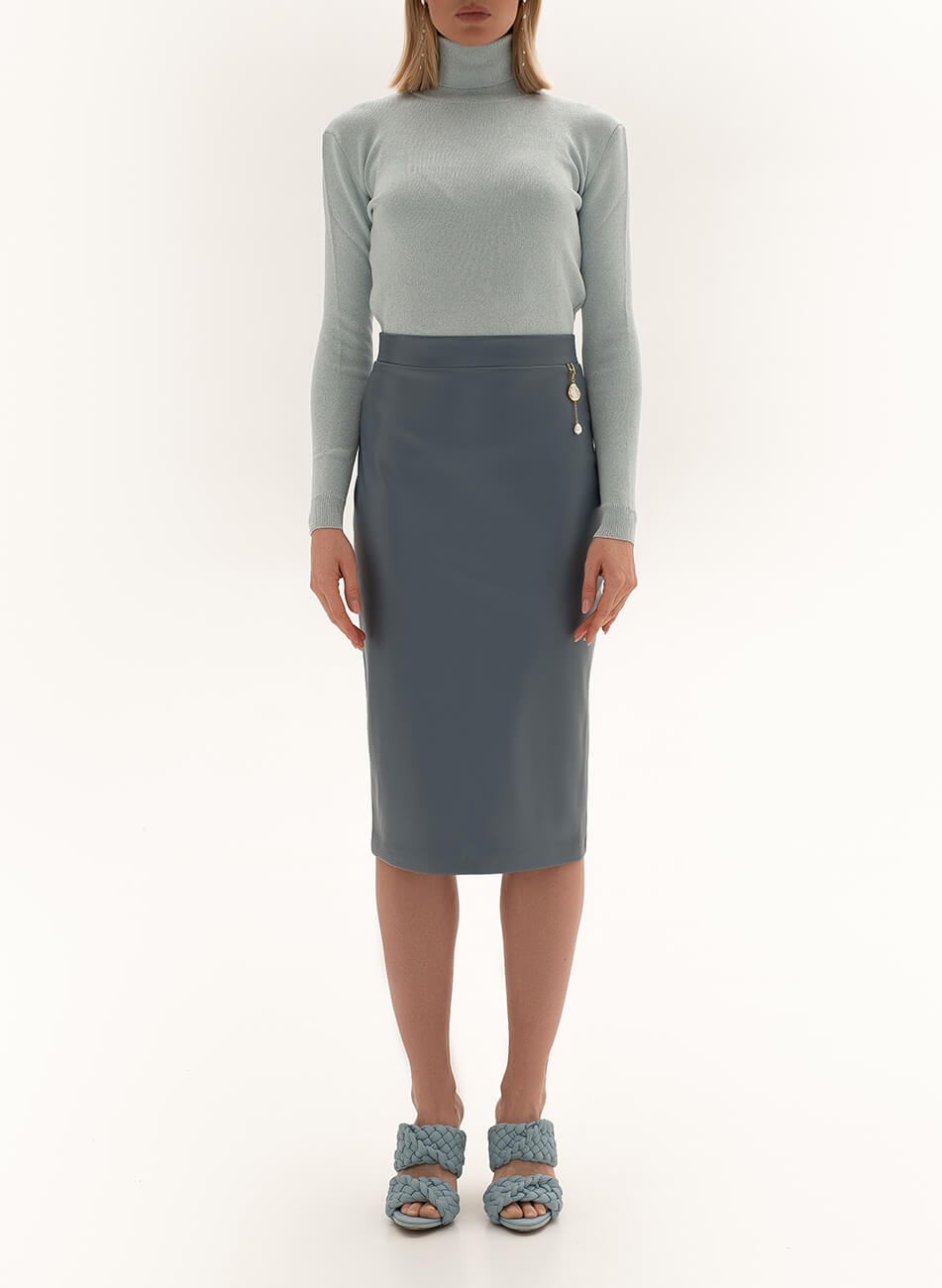 Класична спідниця з еко-шкіри. Декор із перлів не входить до комплекту. Еко-шкіра для виробництва спідниці була протестована і показала високі показники зносостійкості та стійкості до впливу зовнішнього середовища. Гарантія на матеріал: до 5 років.