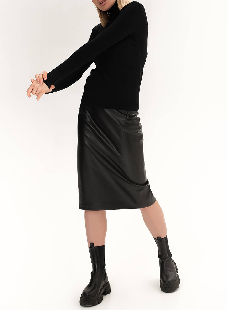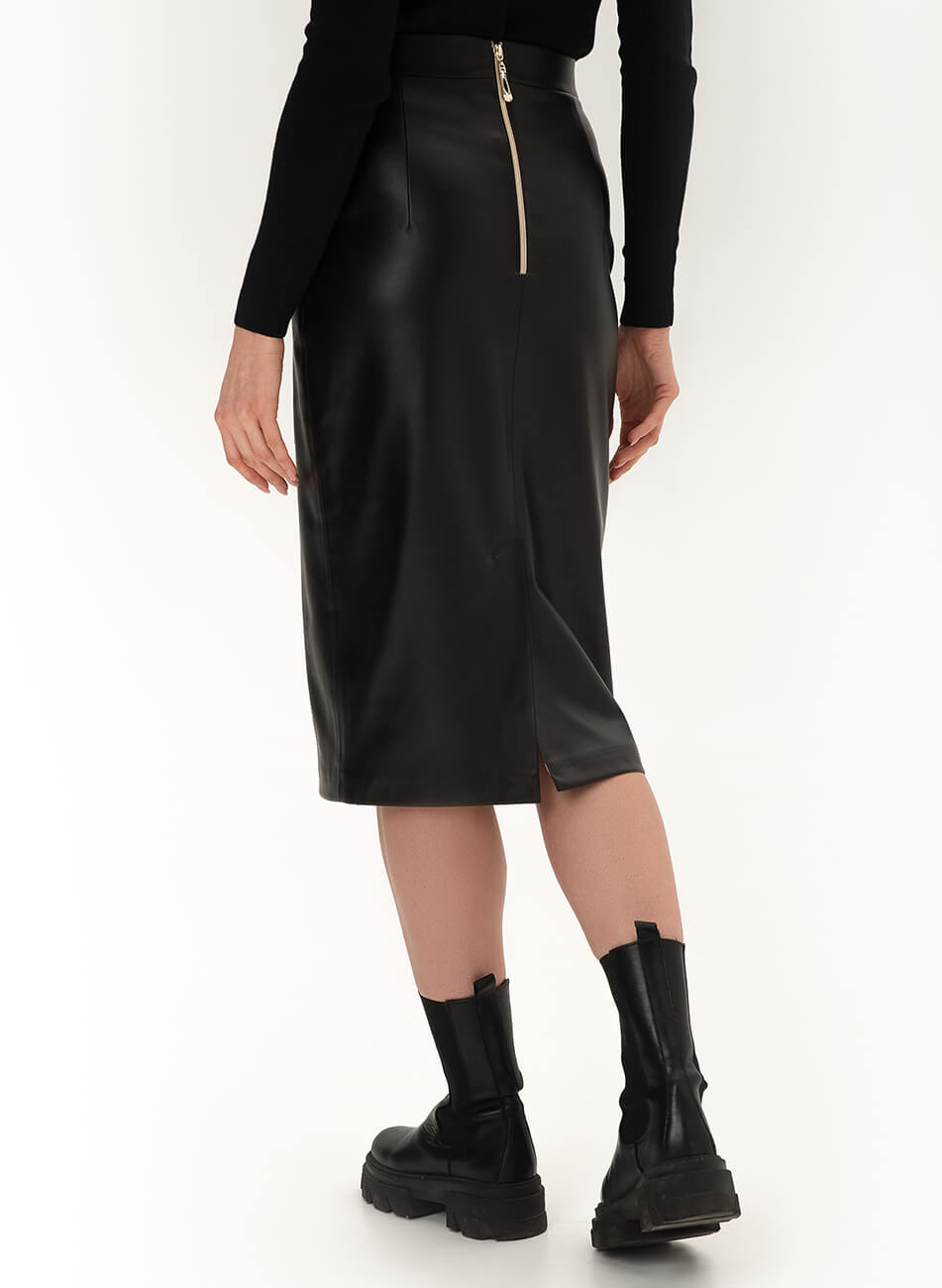 Класична спідниця з еко-шкіри. Знімний декор з натуральних перлів не входить до комплекту. Еко-шкіра для виробництва спідниці була протестована і показала високі показники зносостійкості та стійкості до впливу зовнішнього середовища. Гарантія на матеріал: до 5 років.