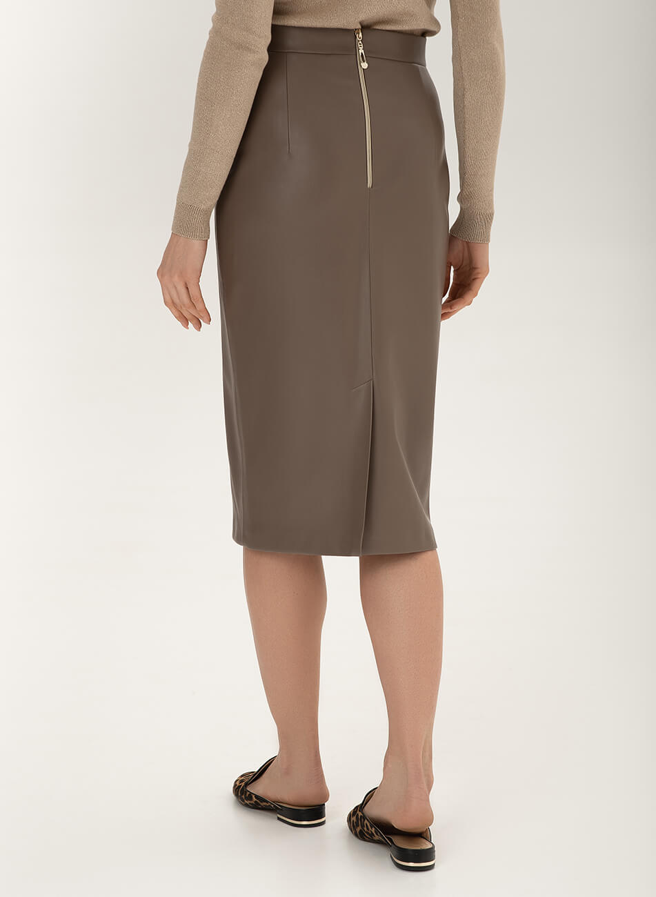 Класична спідниця з еко-шкіри. Знімний декор з натуральних перлів не входить до комплекту. Еко-шкіра для виробництва спідниці була протестована і показала високі показники зносостійкості та стійкості до впливу зовнішнього середовища. Гарантія на матеріал: до 5 років.