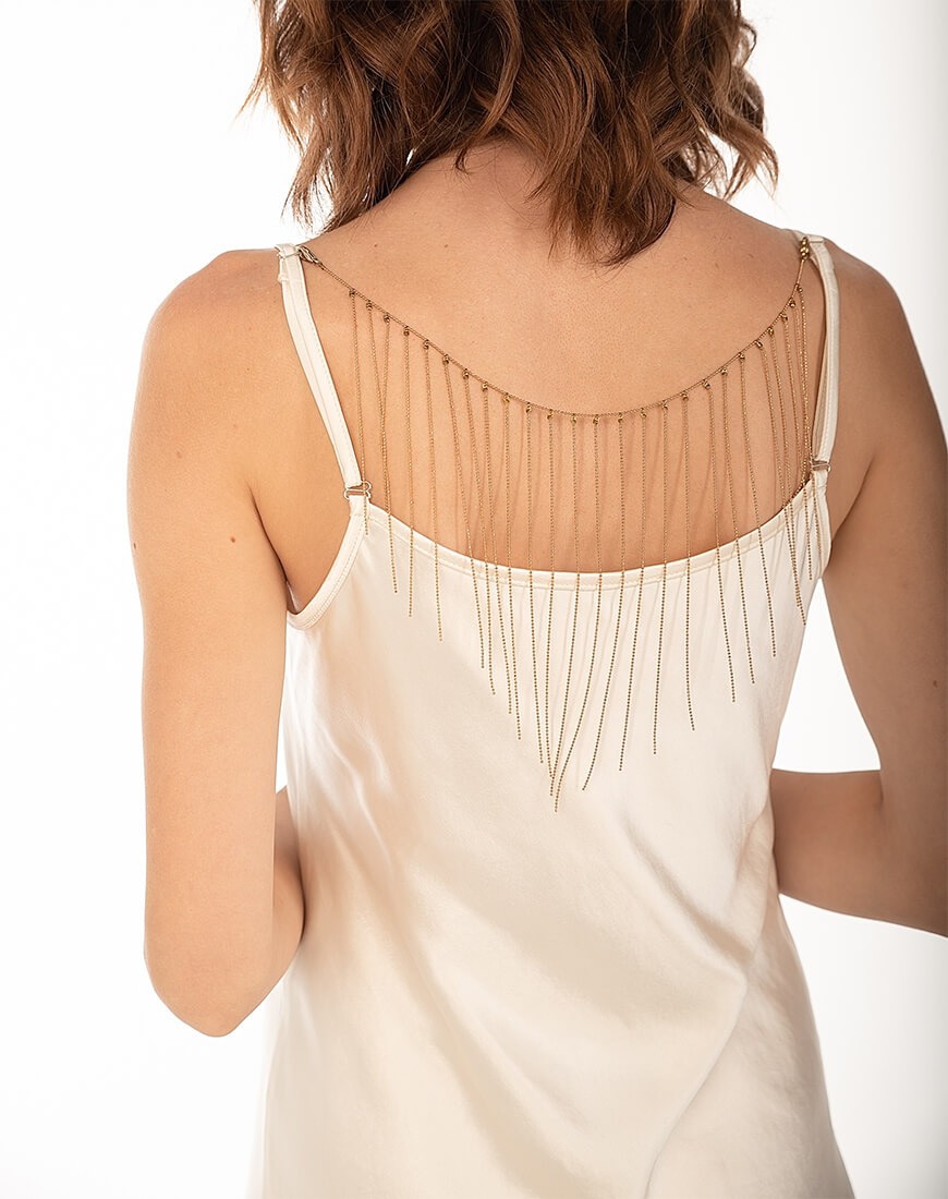 Сарафан на тонких бретелях з відкритою спиною. Знімний декор на спині виконаний з коралових намистин і барокових перлів. Бретелі регульовані – максимальна довжина 49 см. Склад: Льон – 86% Поліакрил – 14% Інструкція з догляду: машинне прання за температури 30 градусів. Режим – делікатне прання, без віджимання. Прасувати можна при низьких температурах до 110 градусів. Інформація про модель: 80-58-88 см. Зріст 172 см
