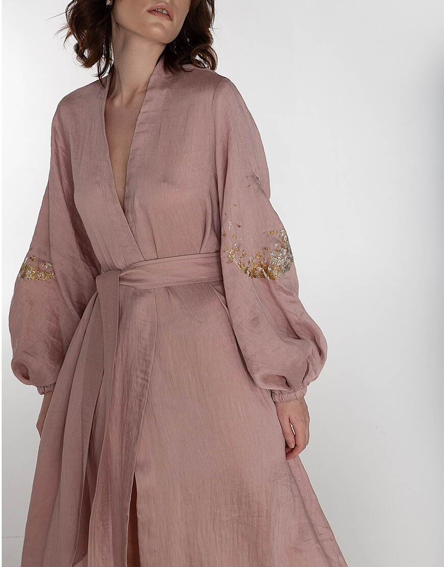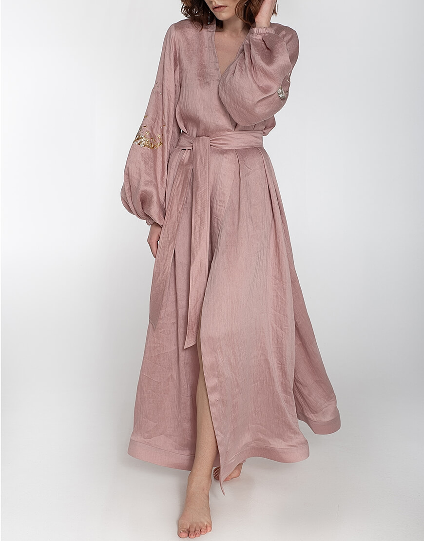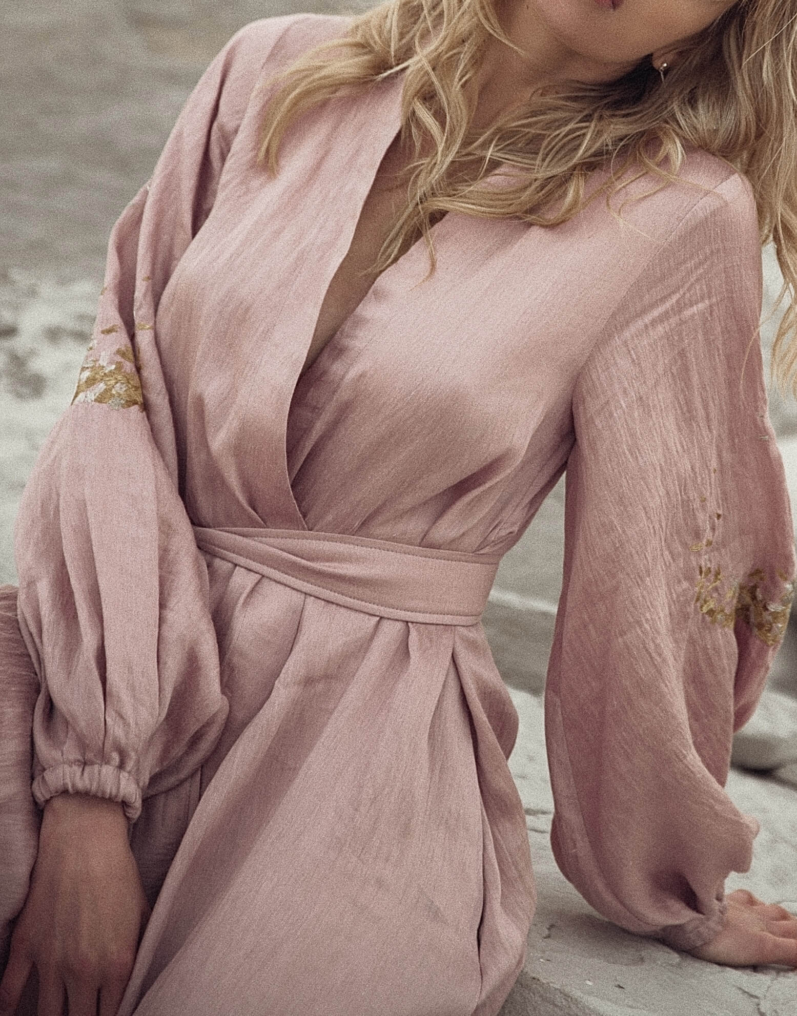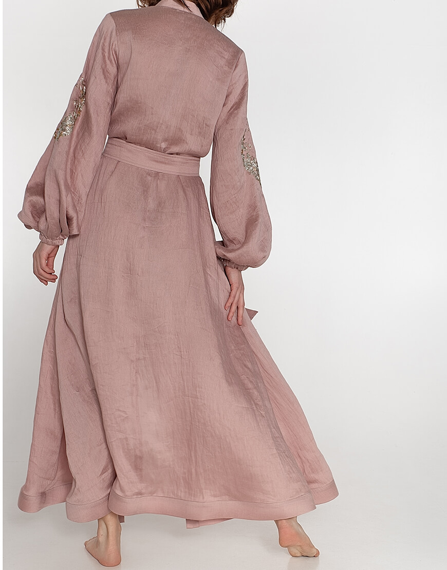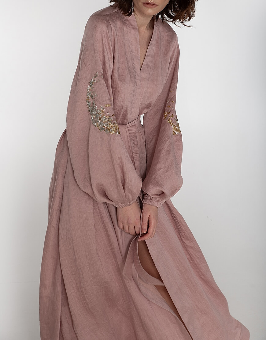Сарафан на тонких бретелях з відкритою спиною. Знімний декор на спині виконаний з коралових намистин і барокових перлів. Бретелі регульовані – максимальна довжина 49 см. Склад: Льон – 86% Поліакрил – 14% Інструкція з догляду: машинне прання за температури 30 градусів. Режим – делікатне прання, без віджимання. Прасувати можна при низьких температурах до 110 градусів. Інформація про модель: 80-58-88 см. Зріст 172 см