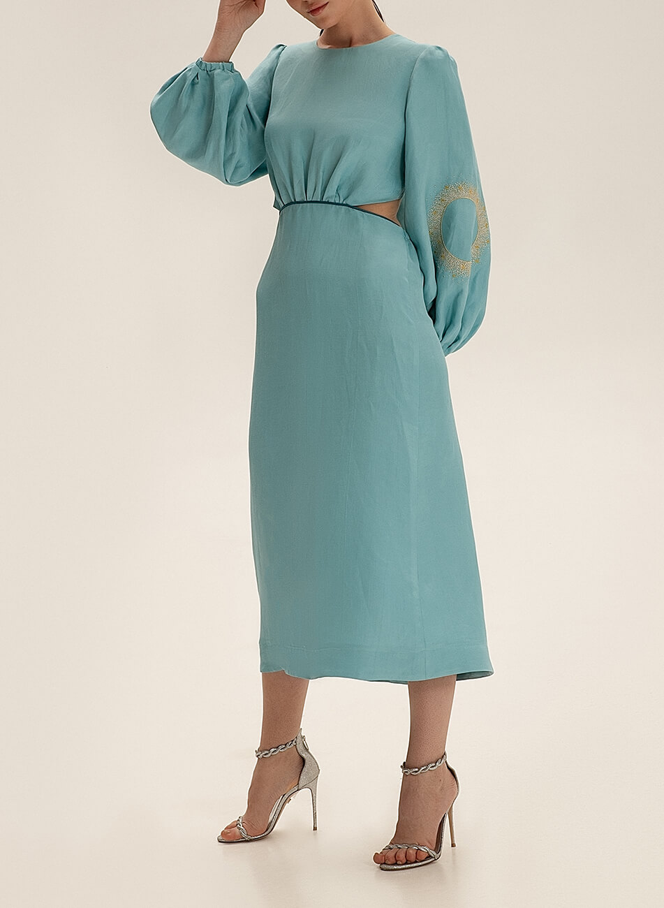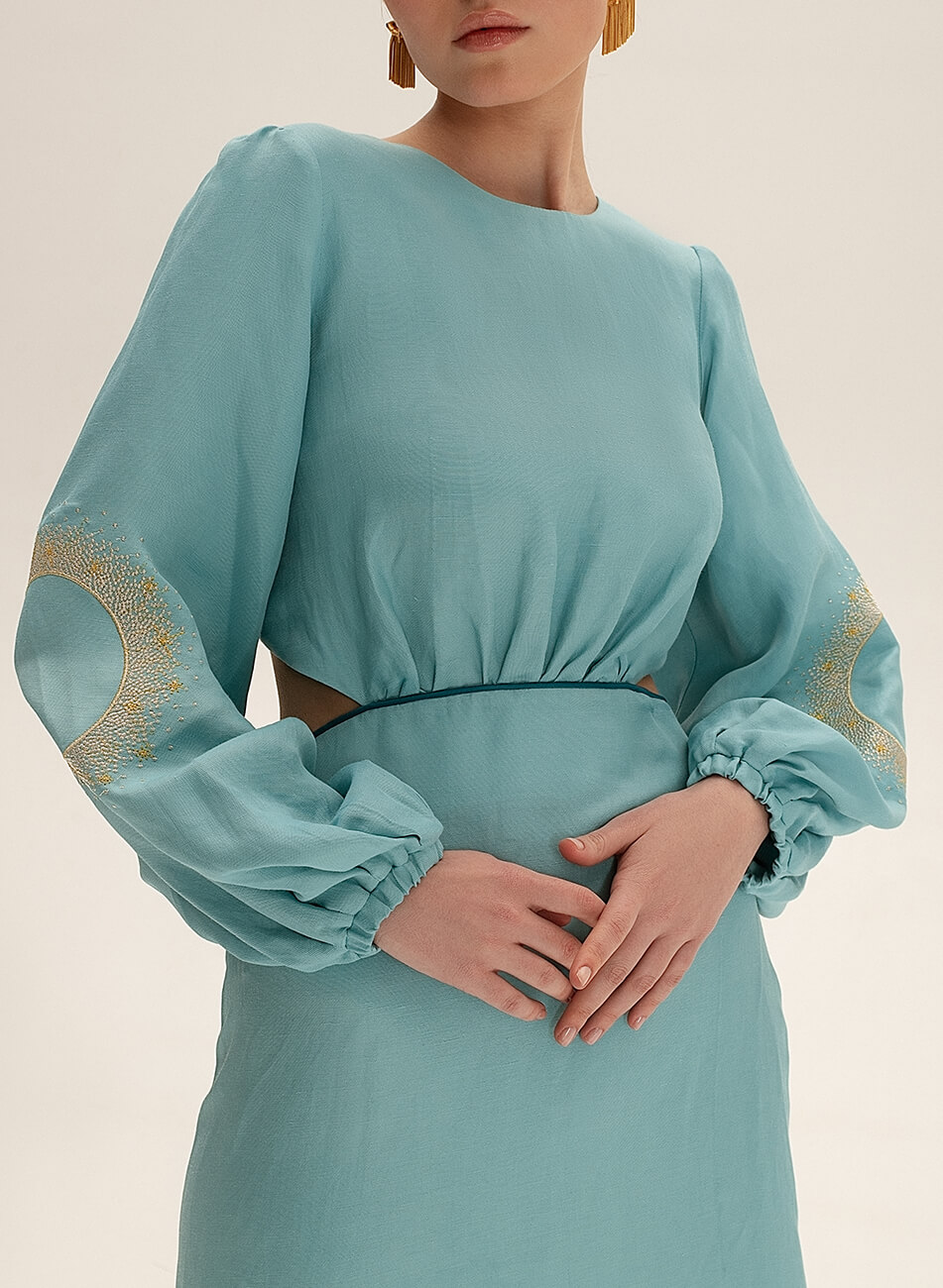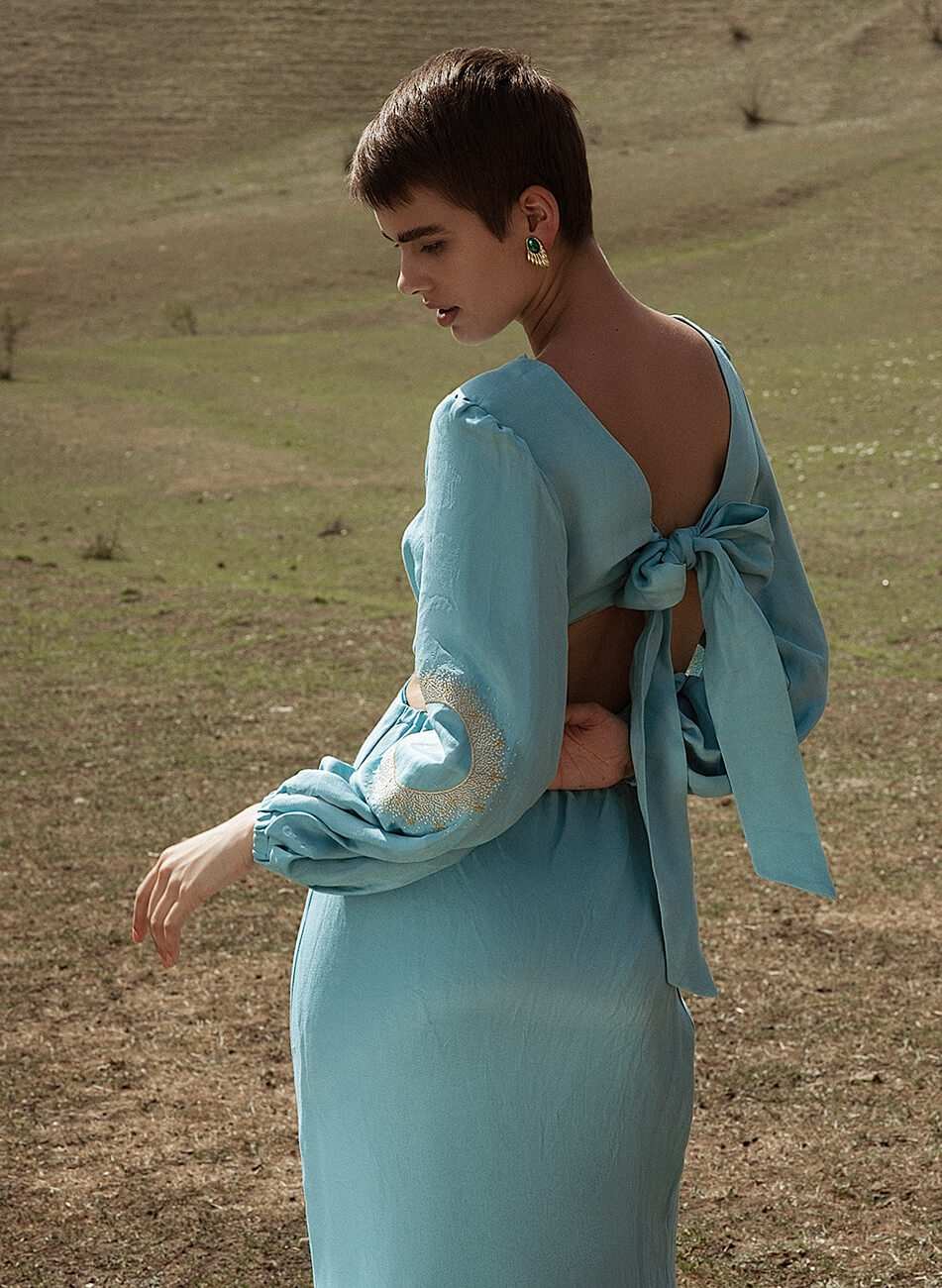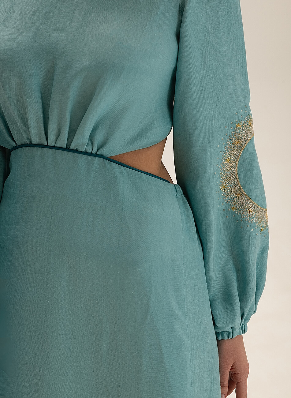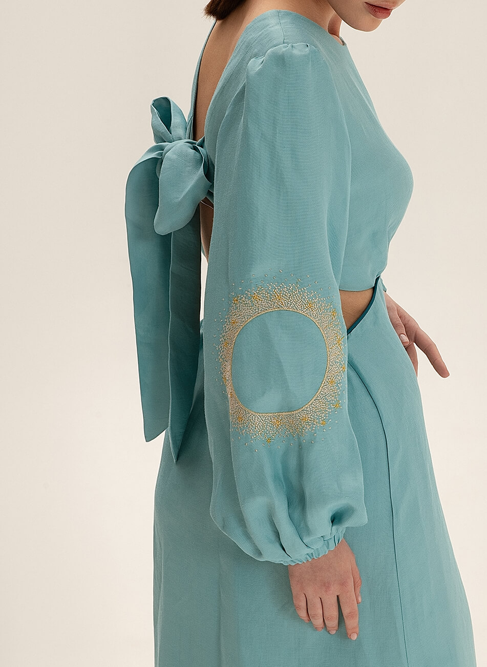 Лляна сукня міді з вирізами. Рукава сукні розшиті орнаментом “Затемнення”. На спині декоративний бант.